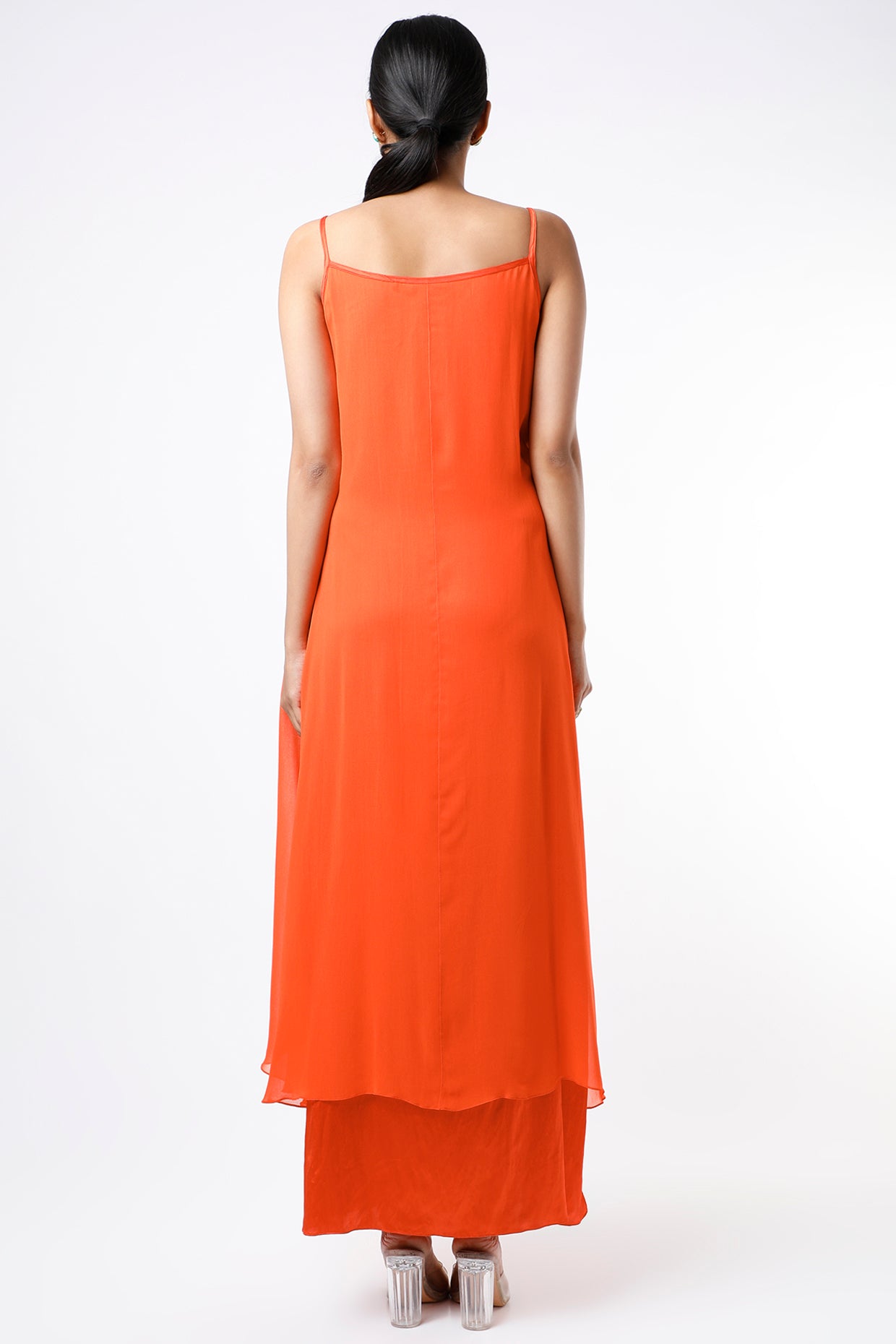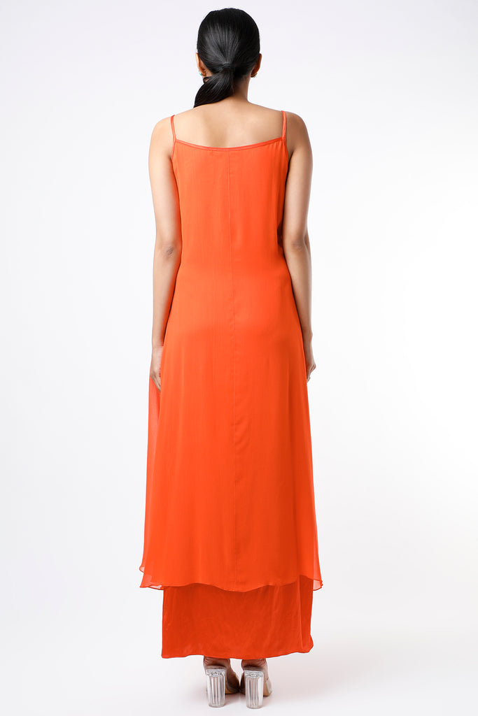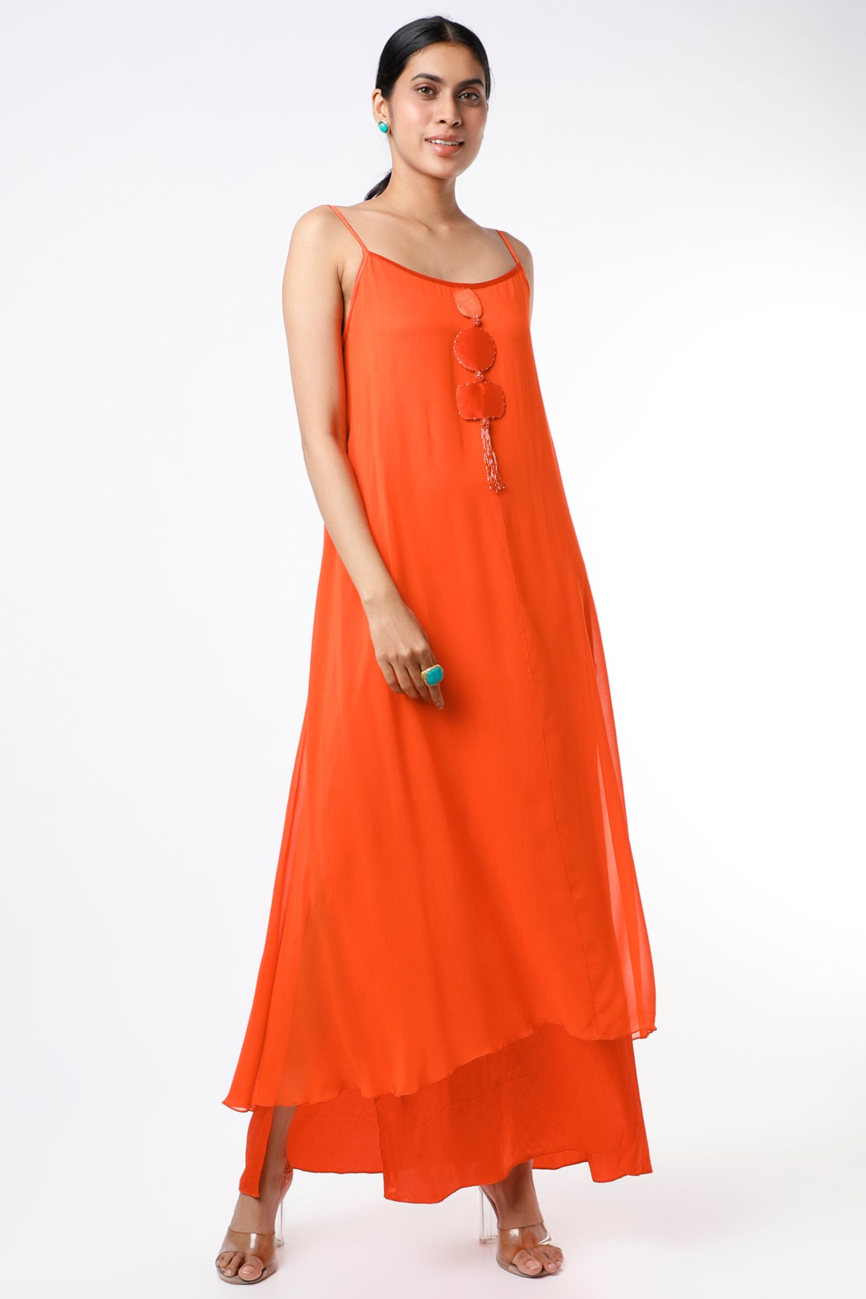 Featuring a orange layered maxi dress in georgette base with pendant embellishments.