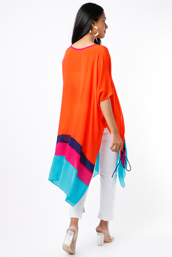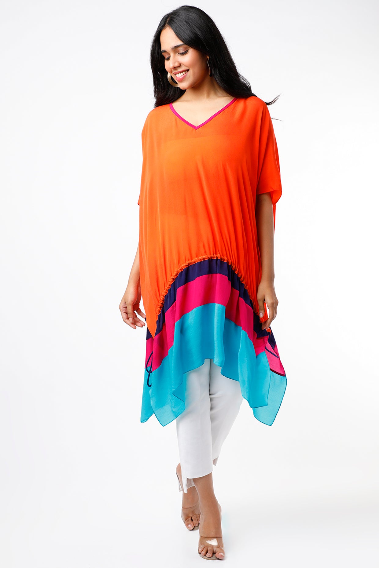 Featuring an orange gathered kaftan top in crepe base with a V-neckline. This contains only one piece.
