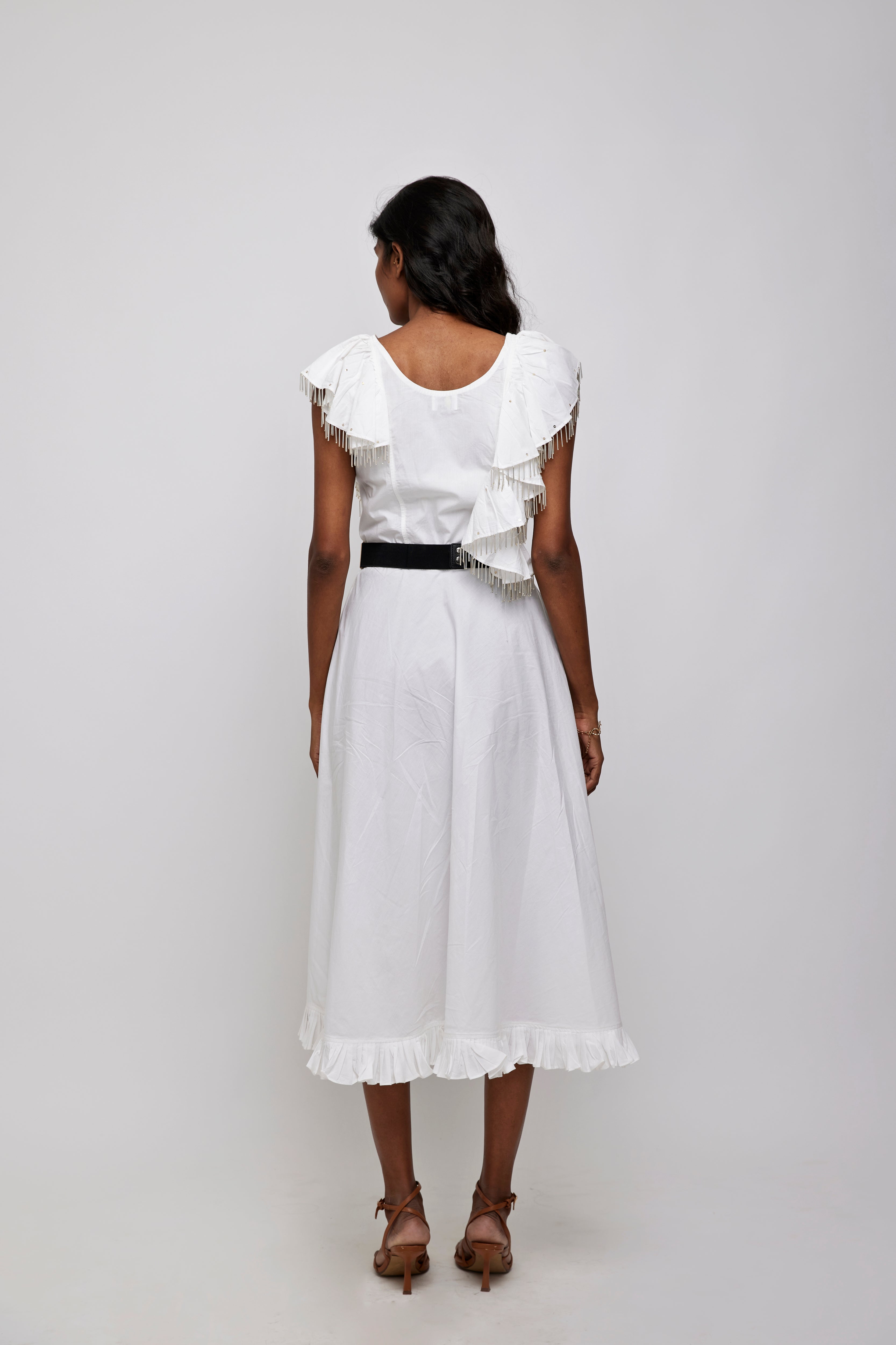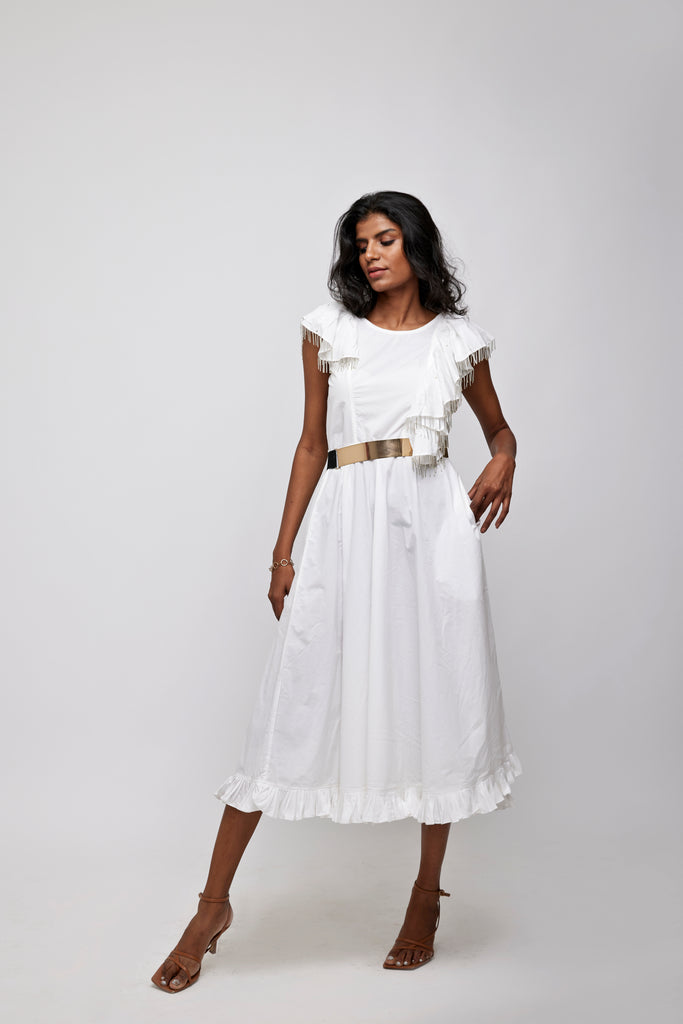 A calf length half circular dress with ruffles at the hem, and a slit pocket.A yoke with princess styleline darts at the front and back, jewel neckline.