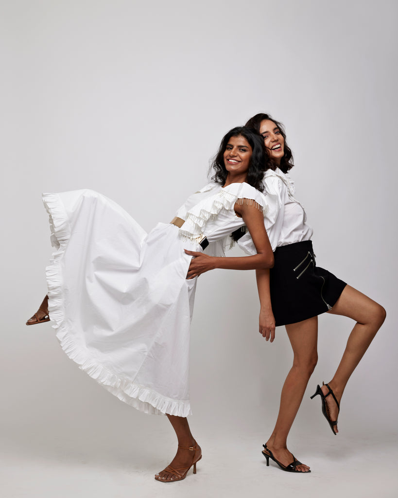 The pleated ruffles with golden sequins and silver tubes, golden beads elements used in 1/4th and 3/4th proportion front and back.