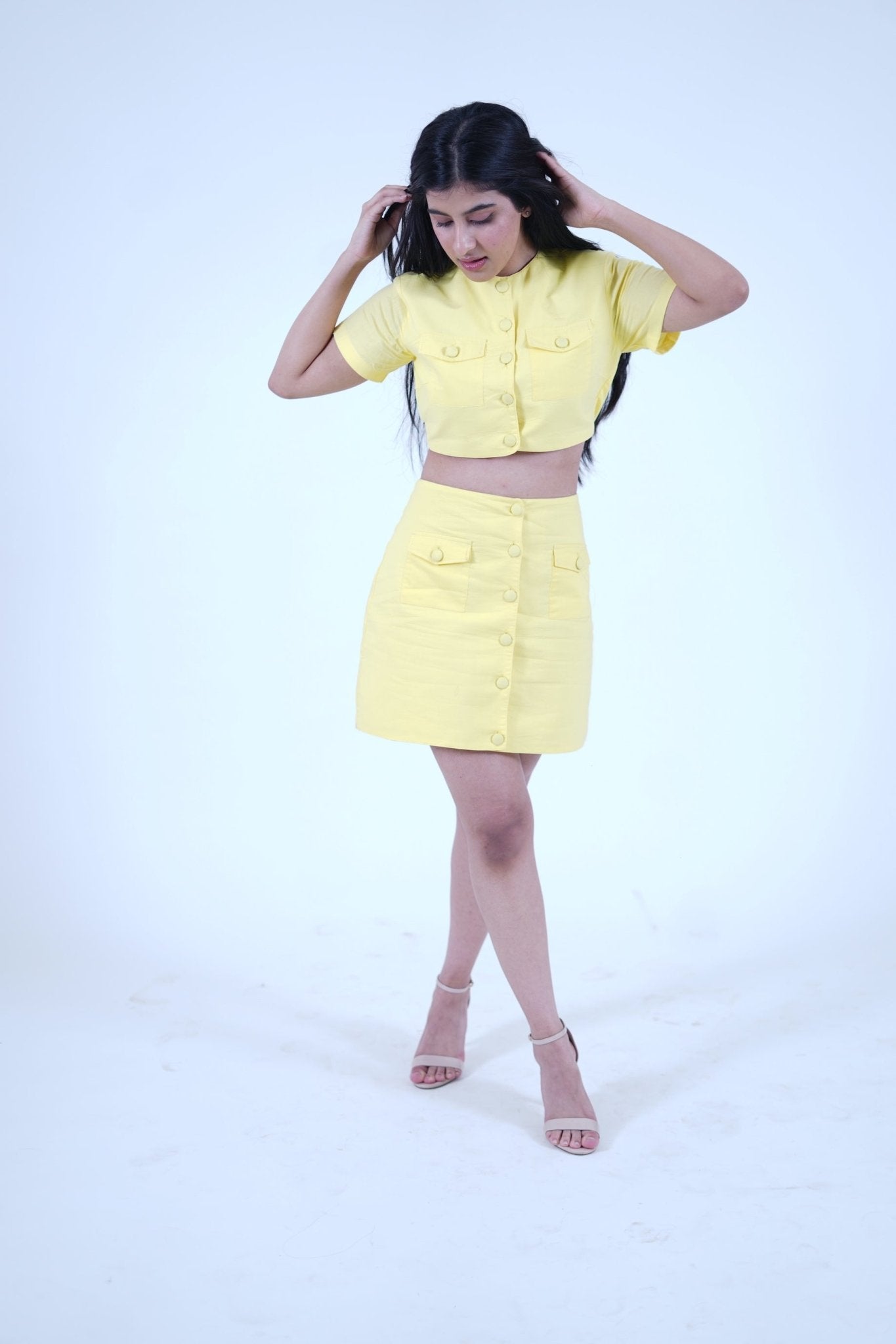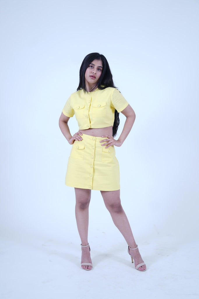 Yellow Co-ord set with light blazer finish crop top. Highwaist skirt with pockets along with fabric buttons.