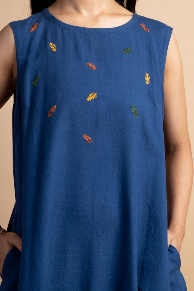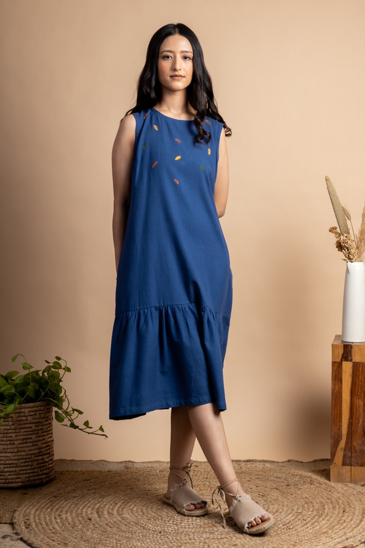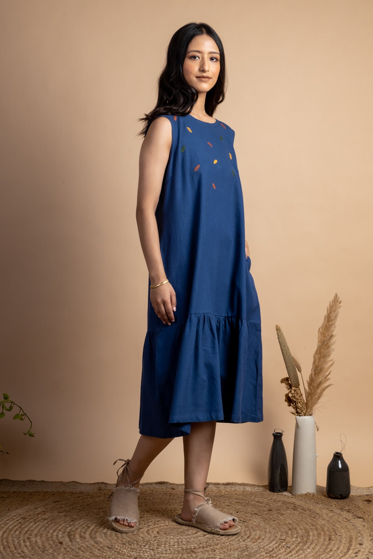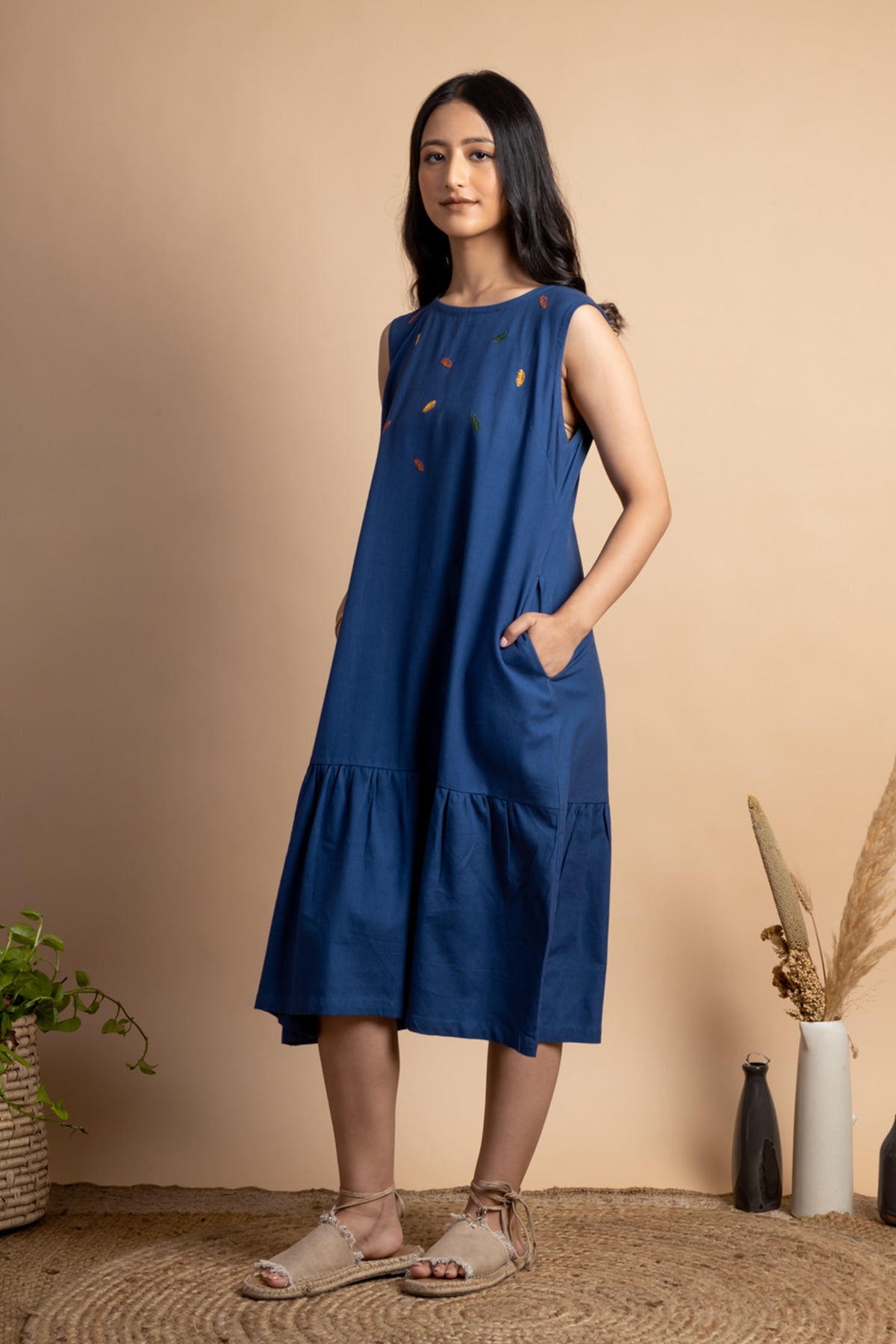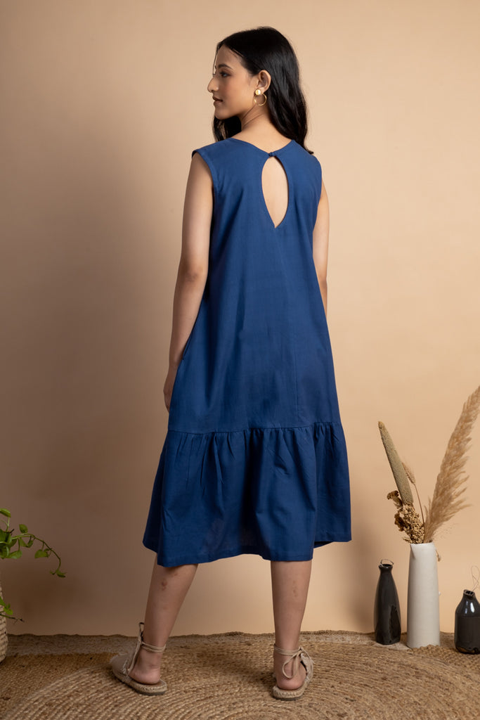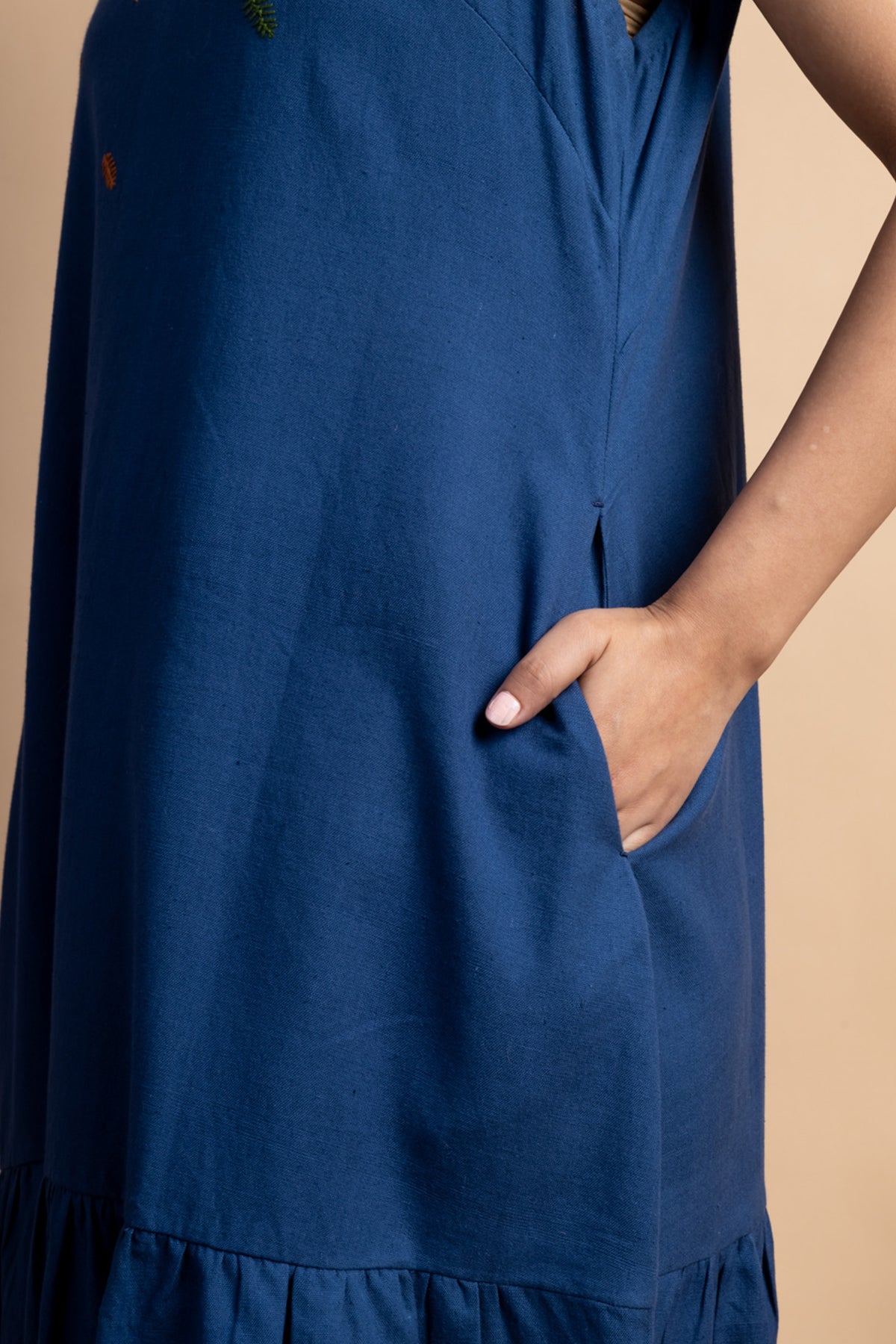 Prepare to get overwhelmed with compliments by wearing this Navy handwoven cotton Tier Dress featuring hand embroidery and side pockets. It also has a keyhole detail in the back. This is our personal favourite dress that is simple yet very chic.