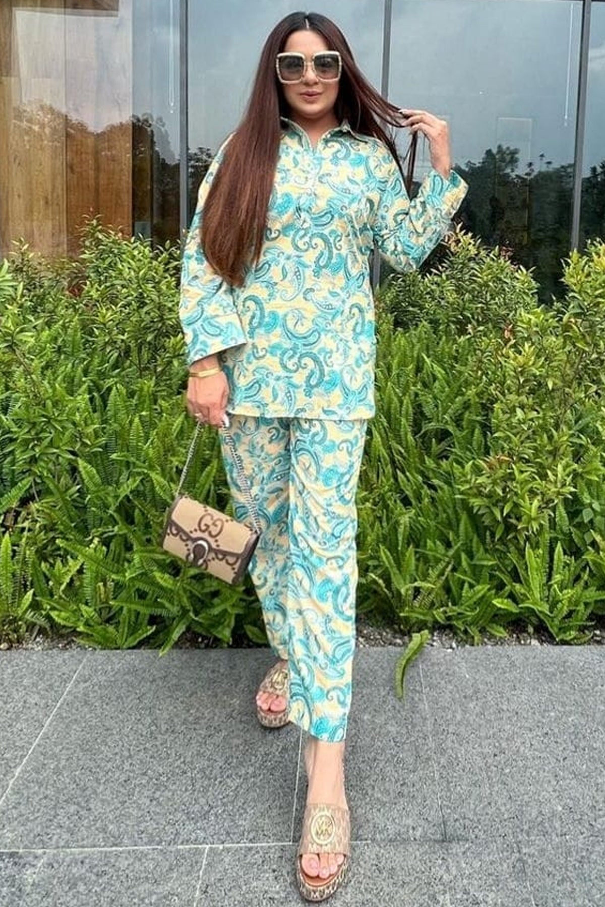 Pastel blue high low shirt n pants co-ord set in premium muslin cotton