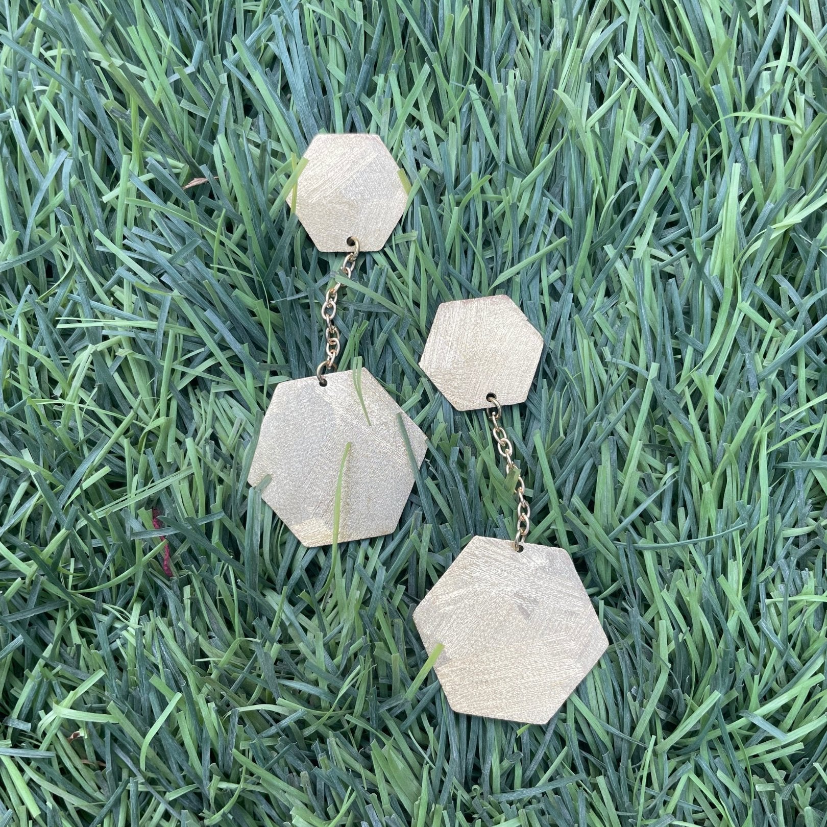 Minimal Honeycomb inspired earrings. Medium and large hand-cut pieces are attached with a chain.