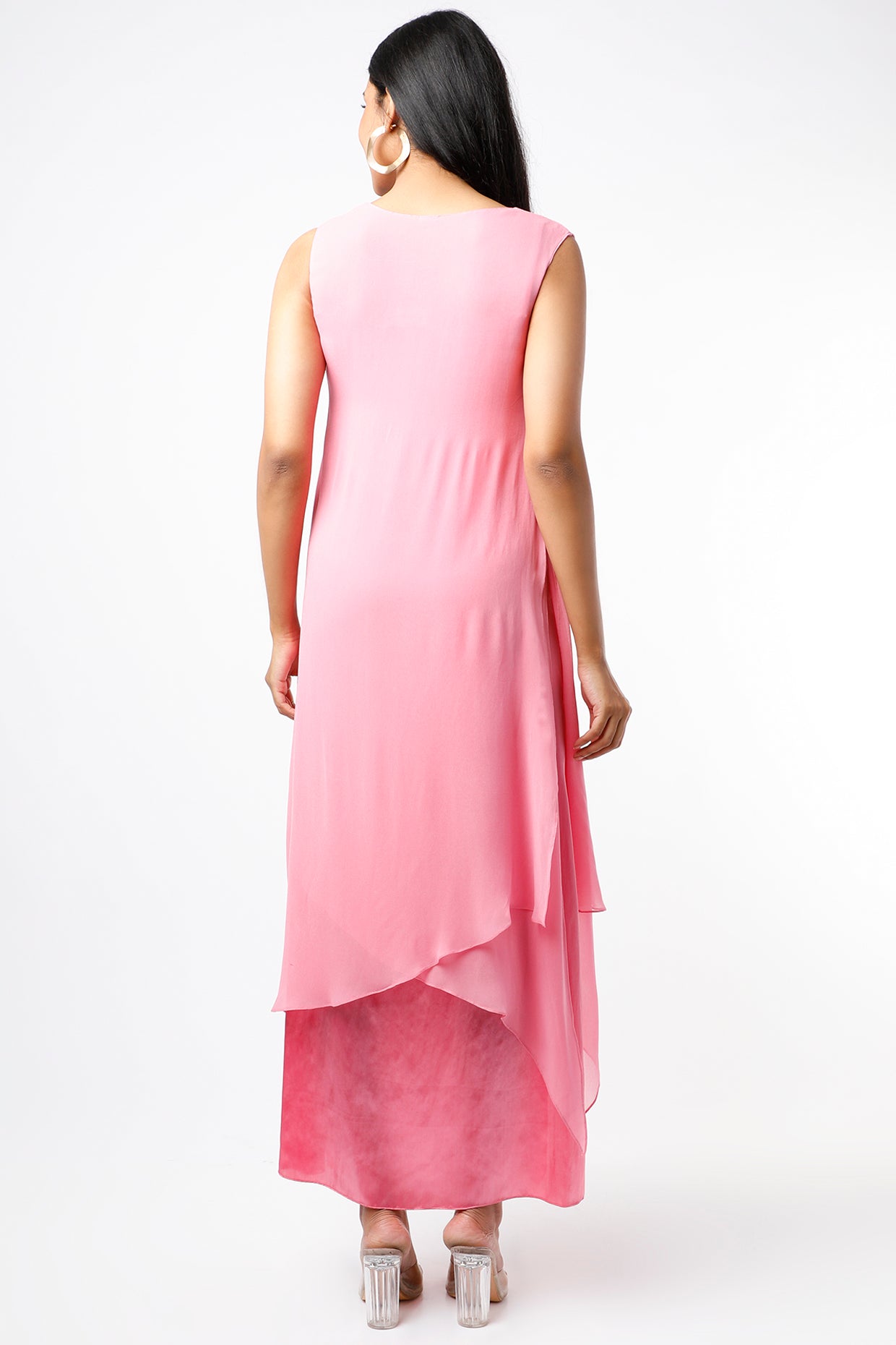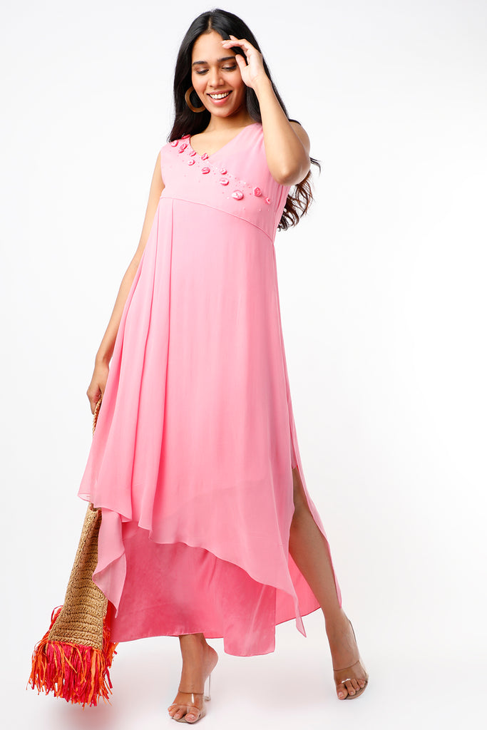 Featuring a pink layered dress in georgette base with embroidery.