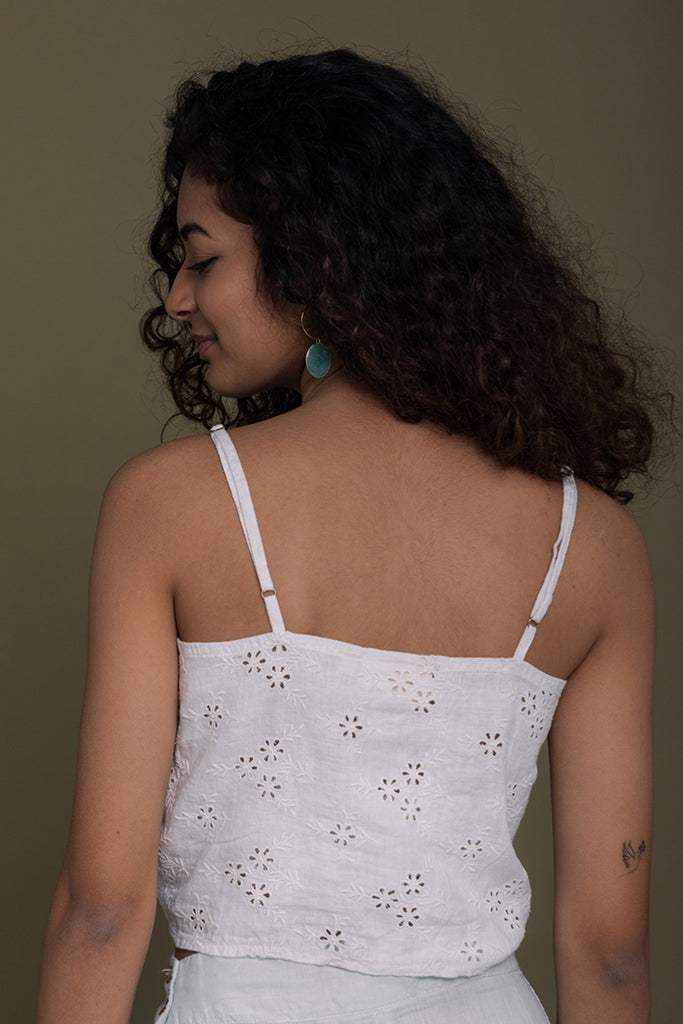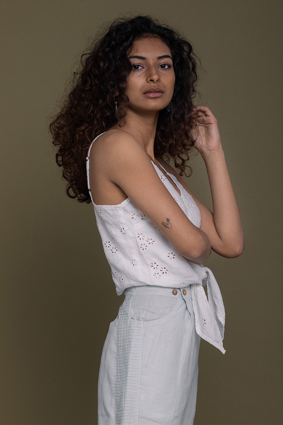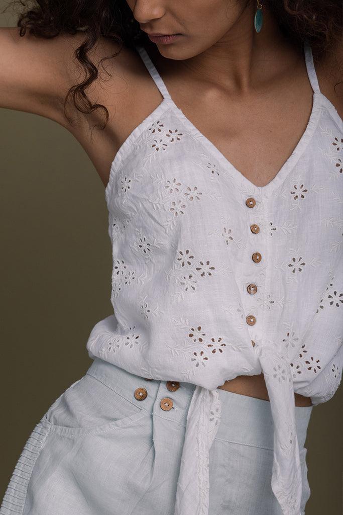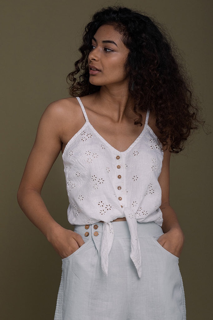 This airy camisole-style top is a wardrobe essential with adjustable straps, a tie-up front and allover eyelet embroidery.