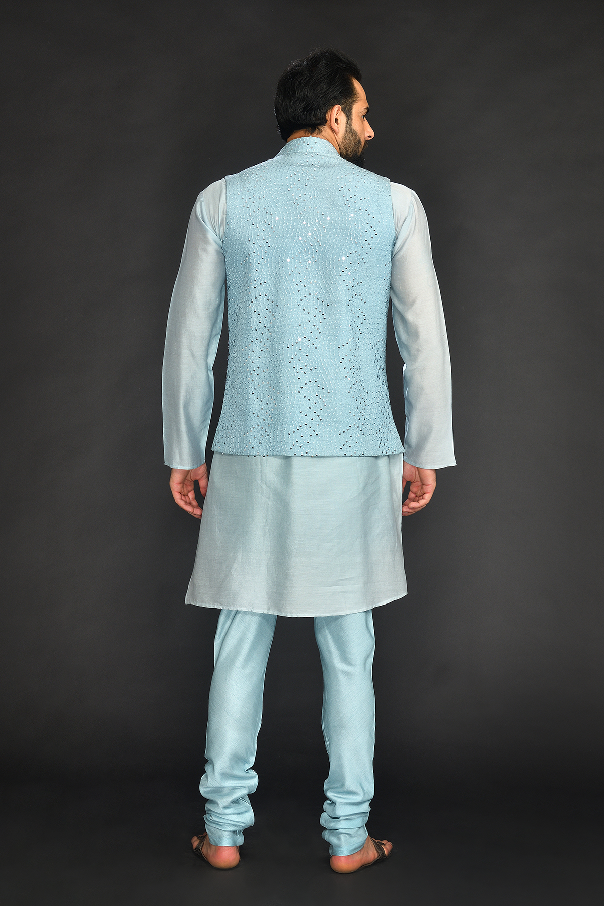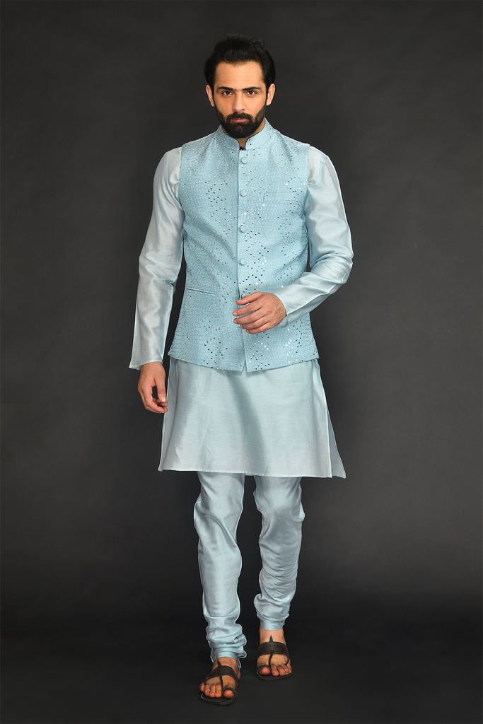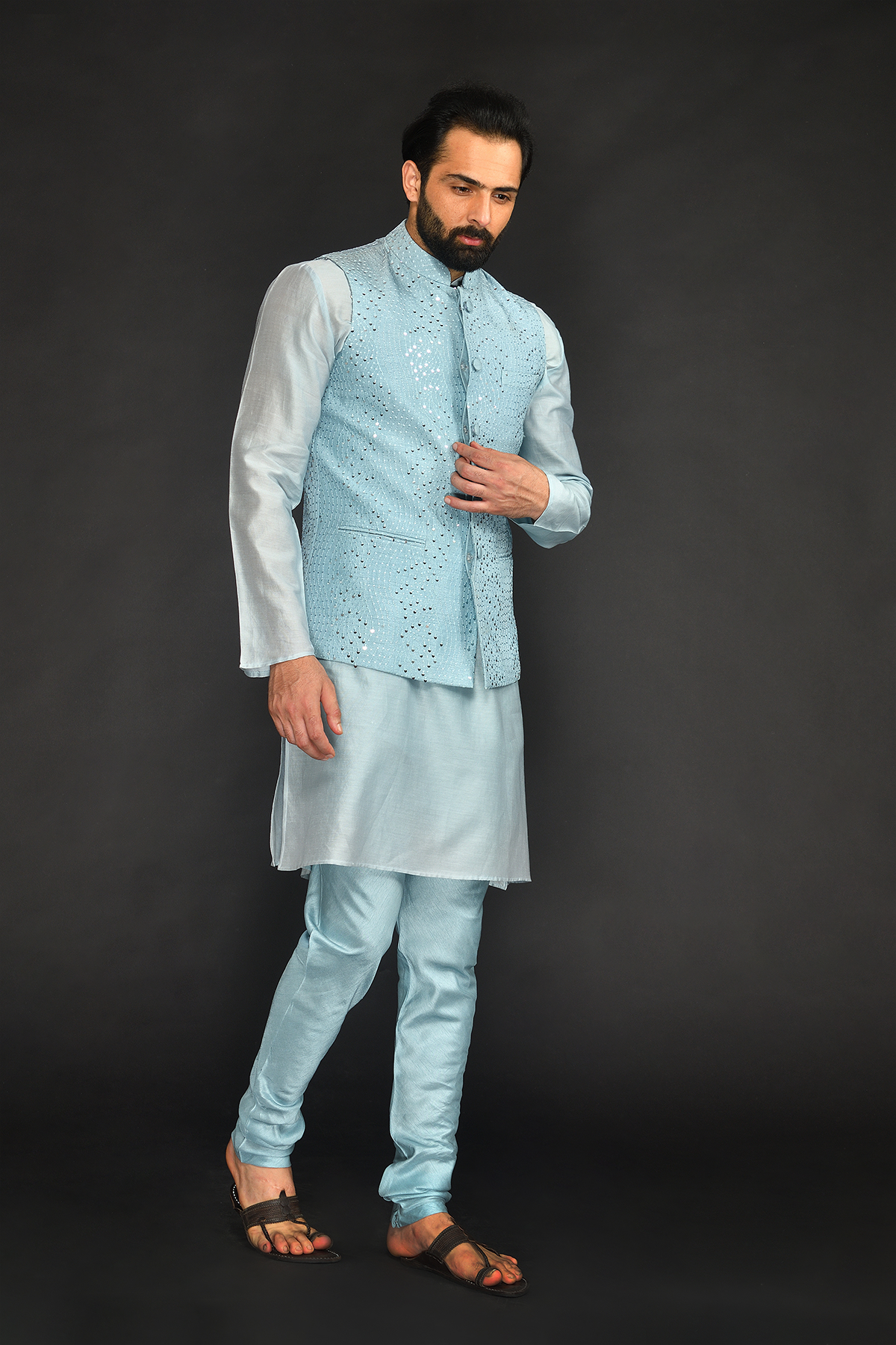 Powder Blue Mirro Textured Embroidery Bundi with Vis. Silk Kurta paired with self color Chudidar Bottom.