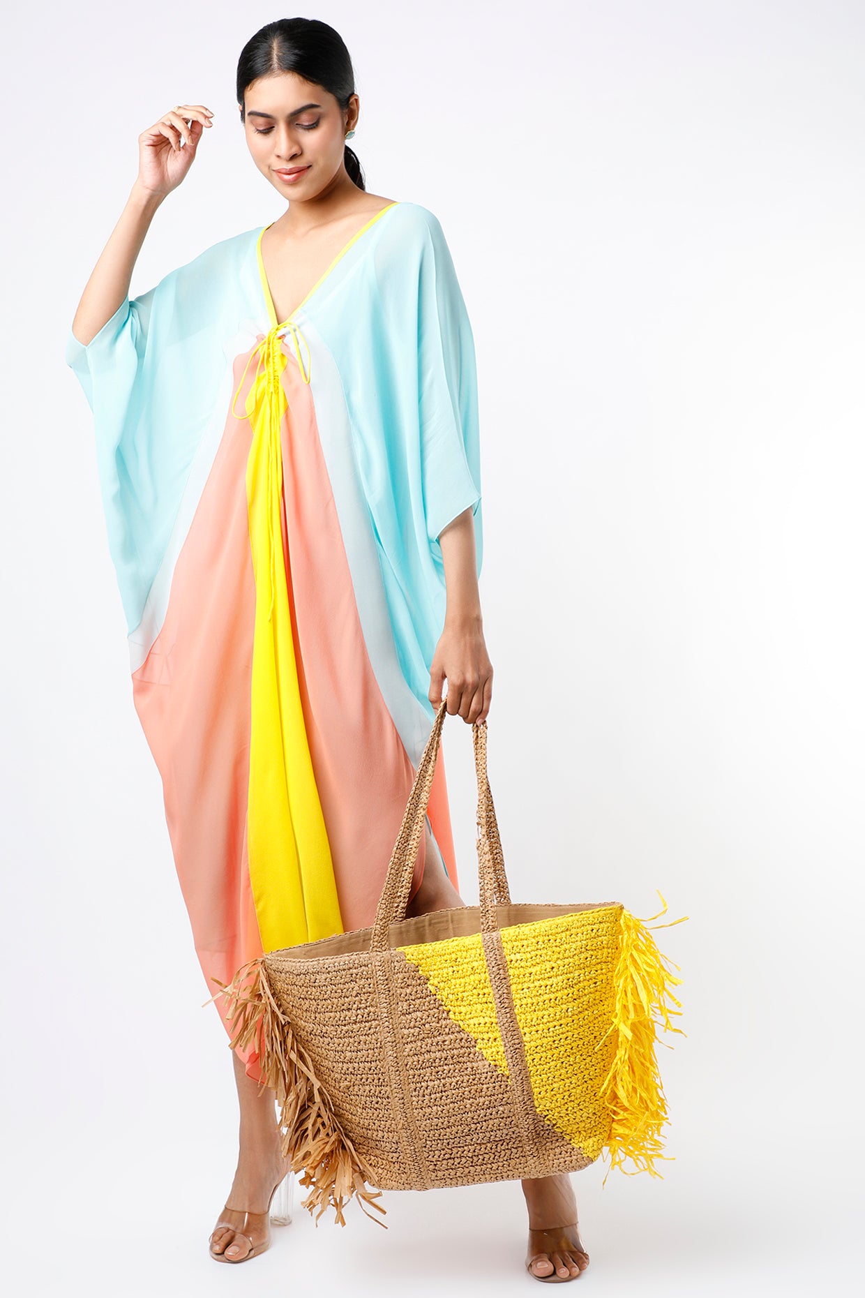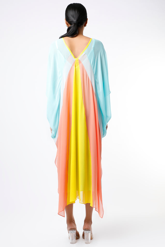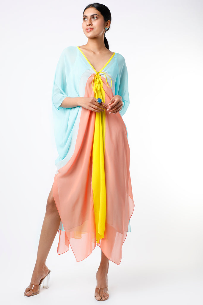 Featuring a powder blue ruched kaftan in georgette base with color blocking.
