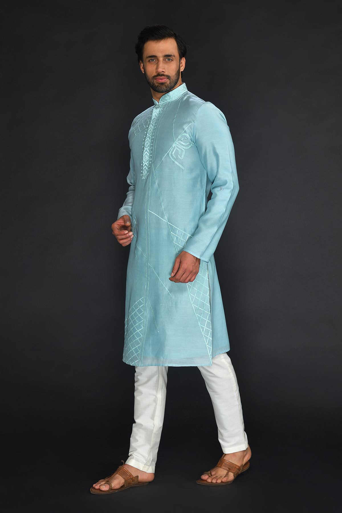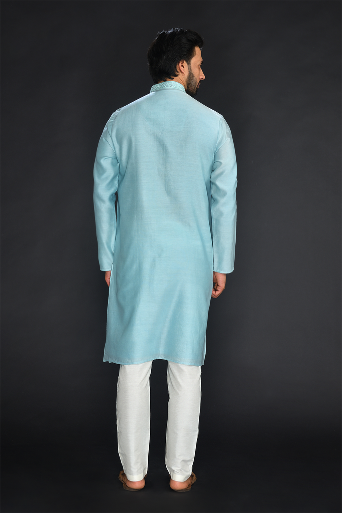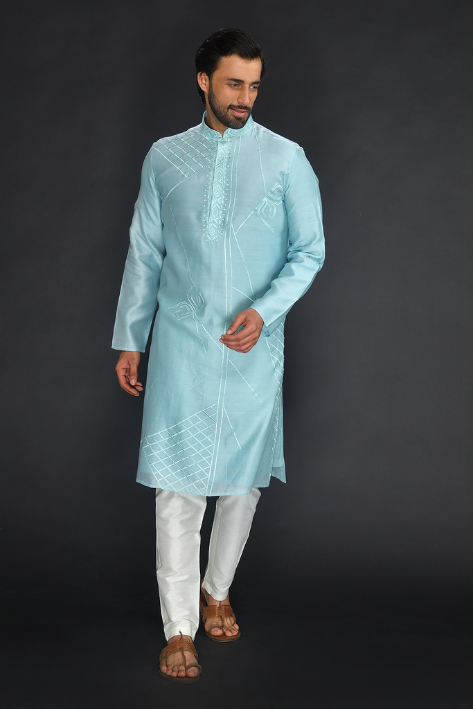 Powder Blue Machine Thread Embroidery Kurta paired with spun silk chudidar bottom.