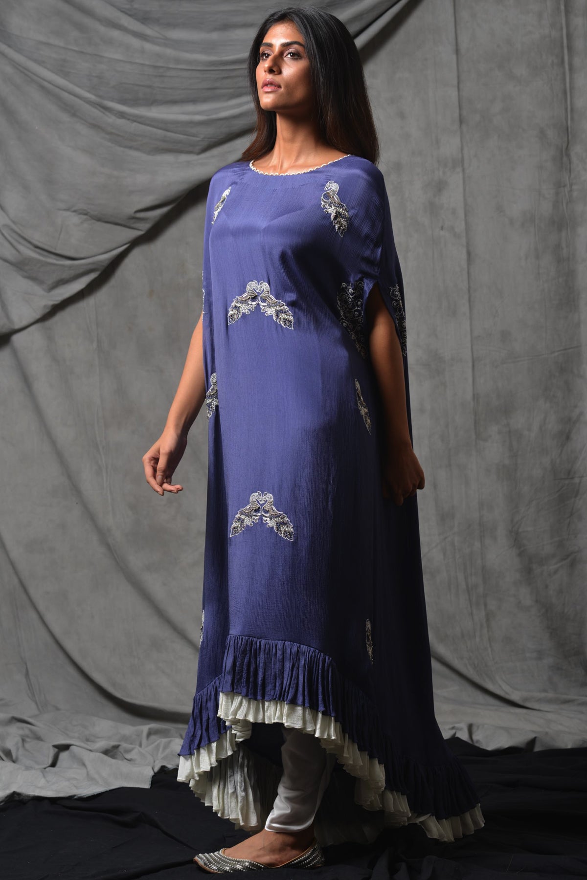This set features a ruffle embroidered asymmetrical kurta with a pair of dhoti pants.