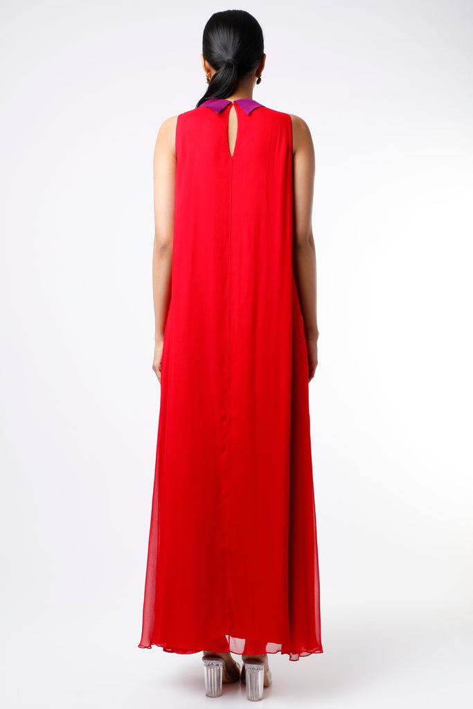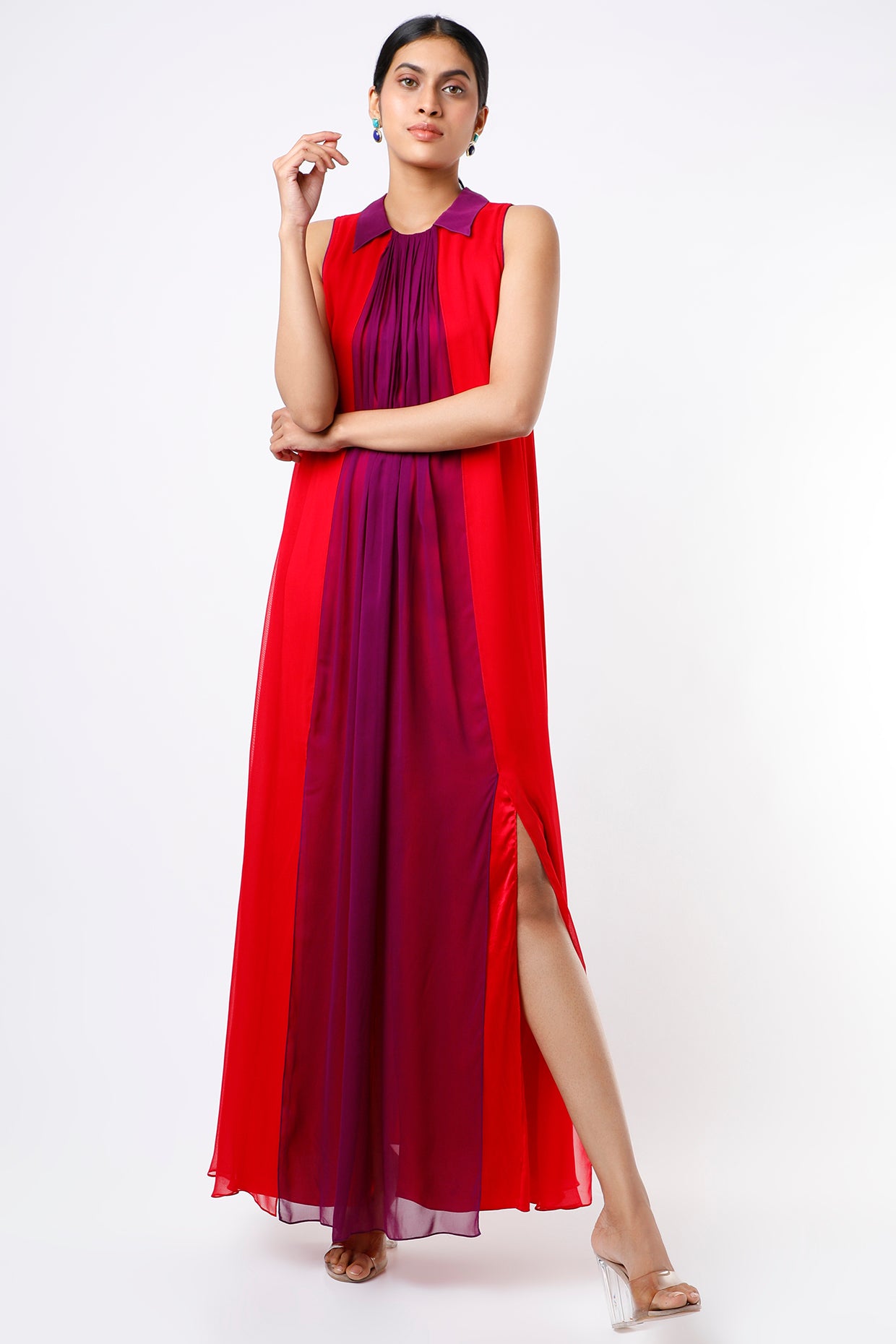 Featuring a Red and Purple sleeveless maxi dress in georgette base with a slit.