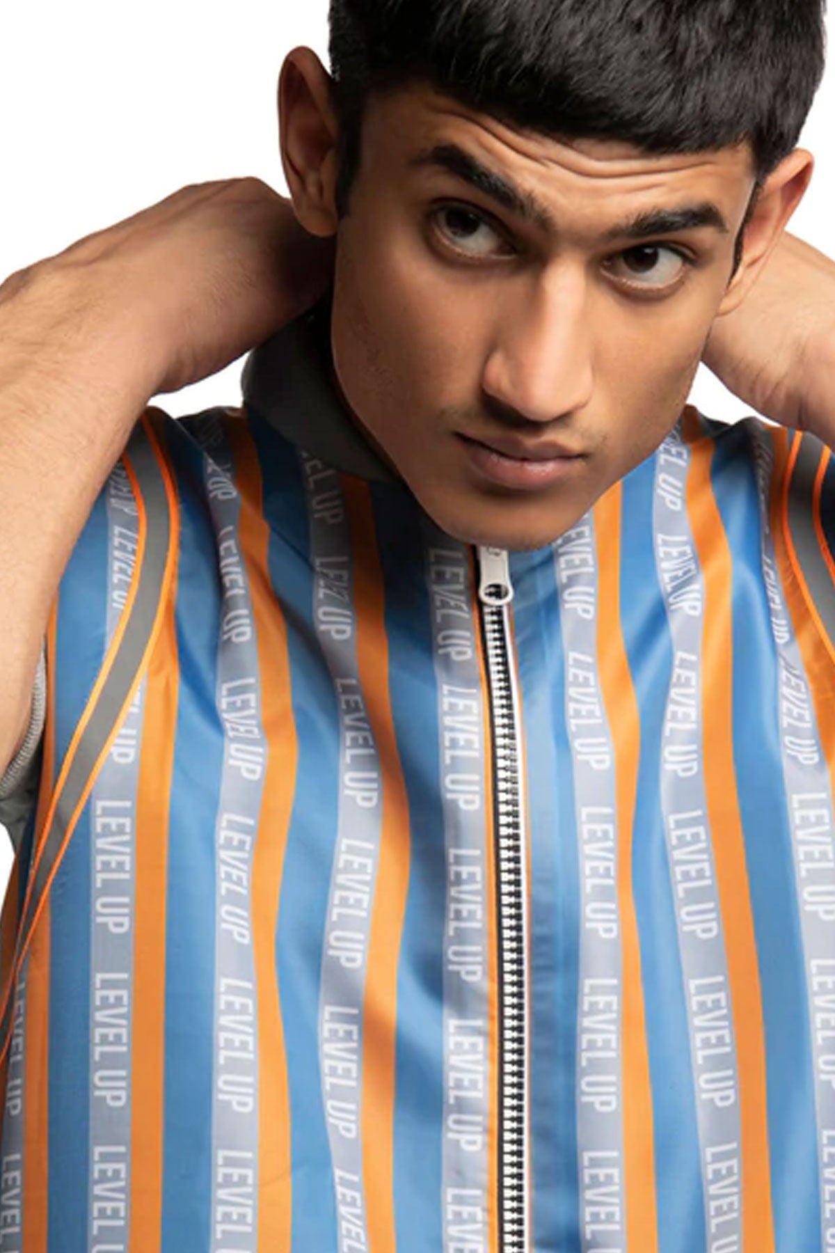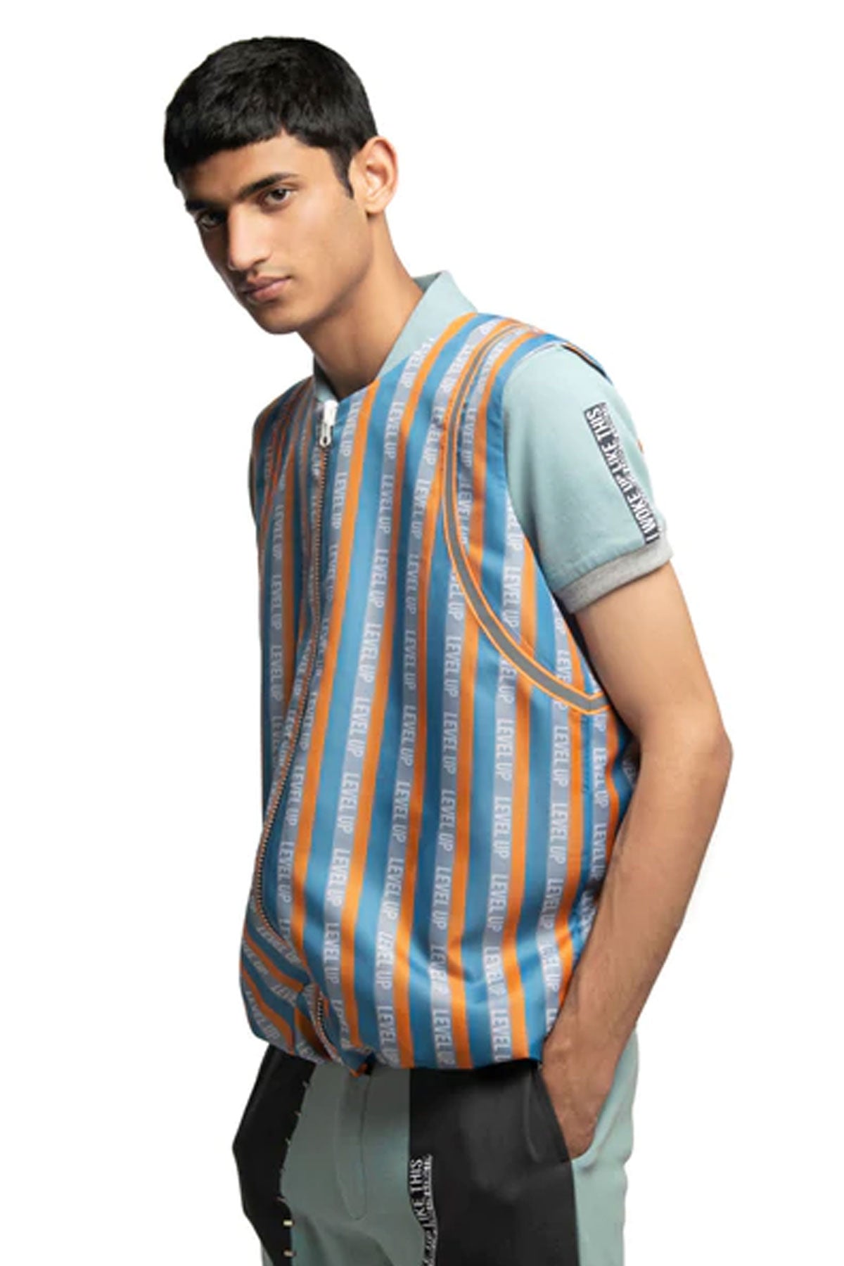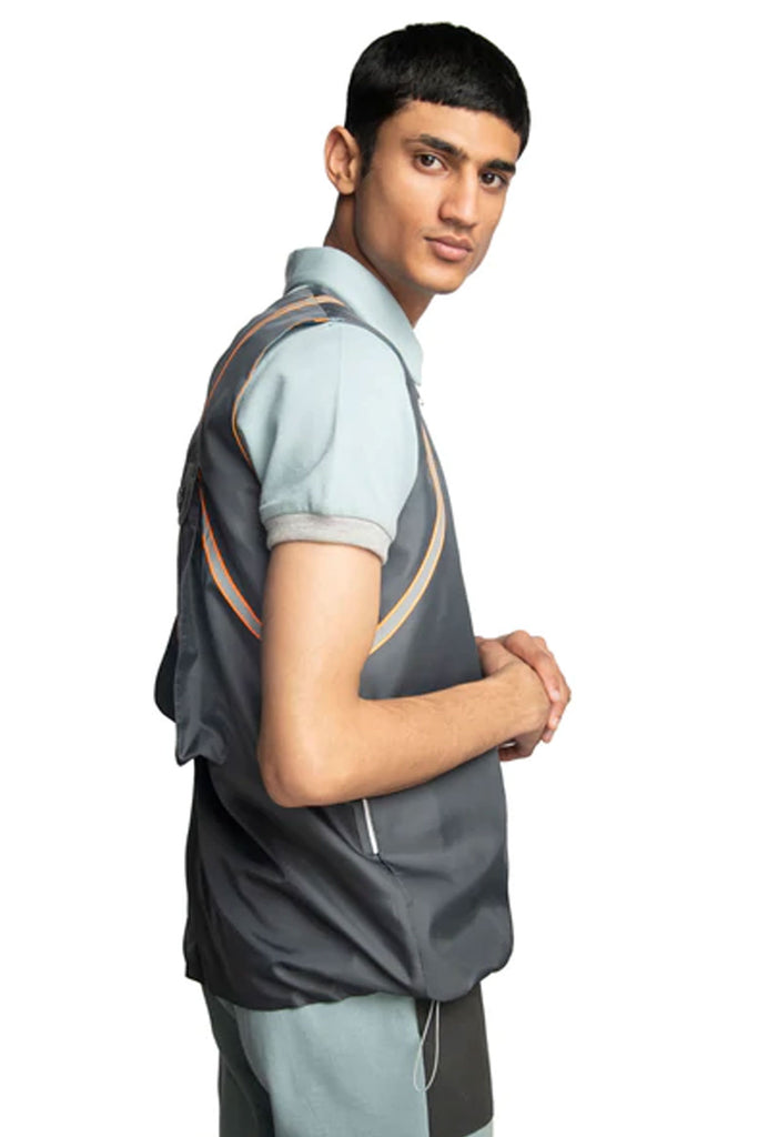 Reversible sleeveless windcheater vest. “Level Up” stripe pattern in multicolour throughout. Box backpack at back. Orange reflective tape at back. Two-toned reversible zip closure at front. Signature ALL2DEFY trimming at pocket. Tonal stitching. Reverse in charcoal grey windcheater. Box pocket at back. Stitch detail and staple hardware at pocket. Orange reflective tape at back. Signature ALL2DEFY trimming at pocket.