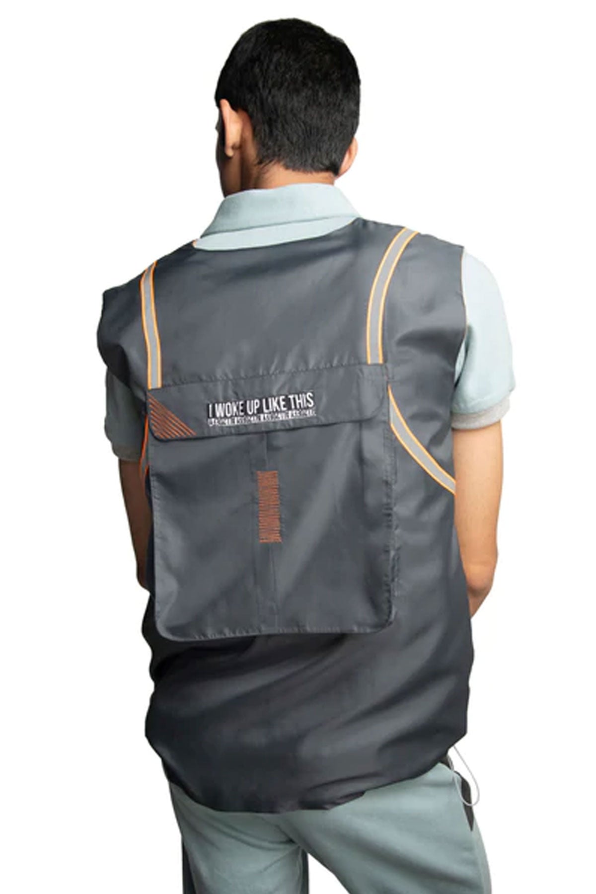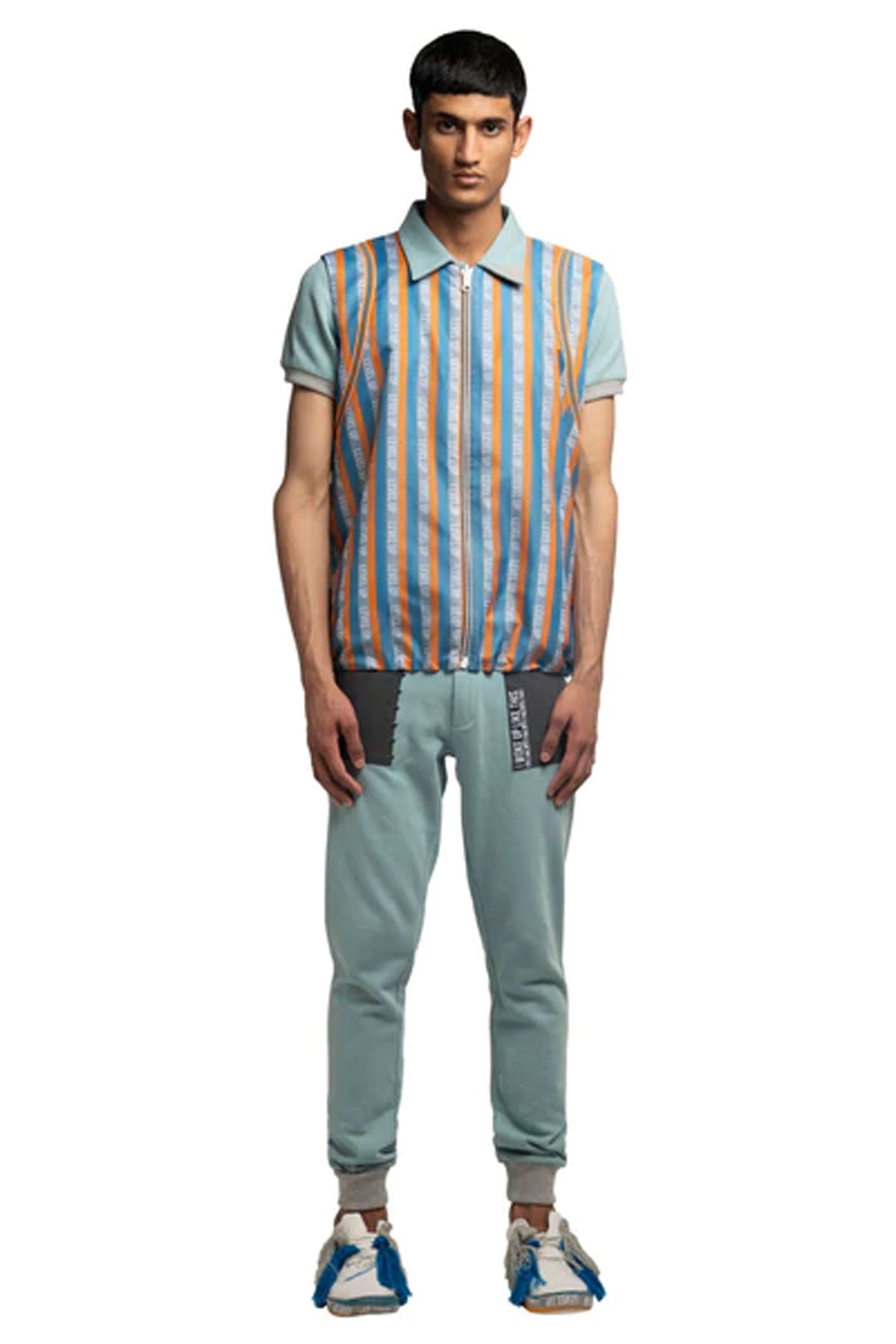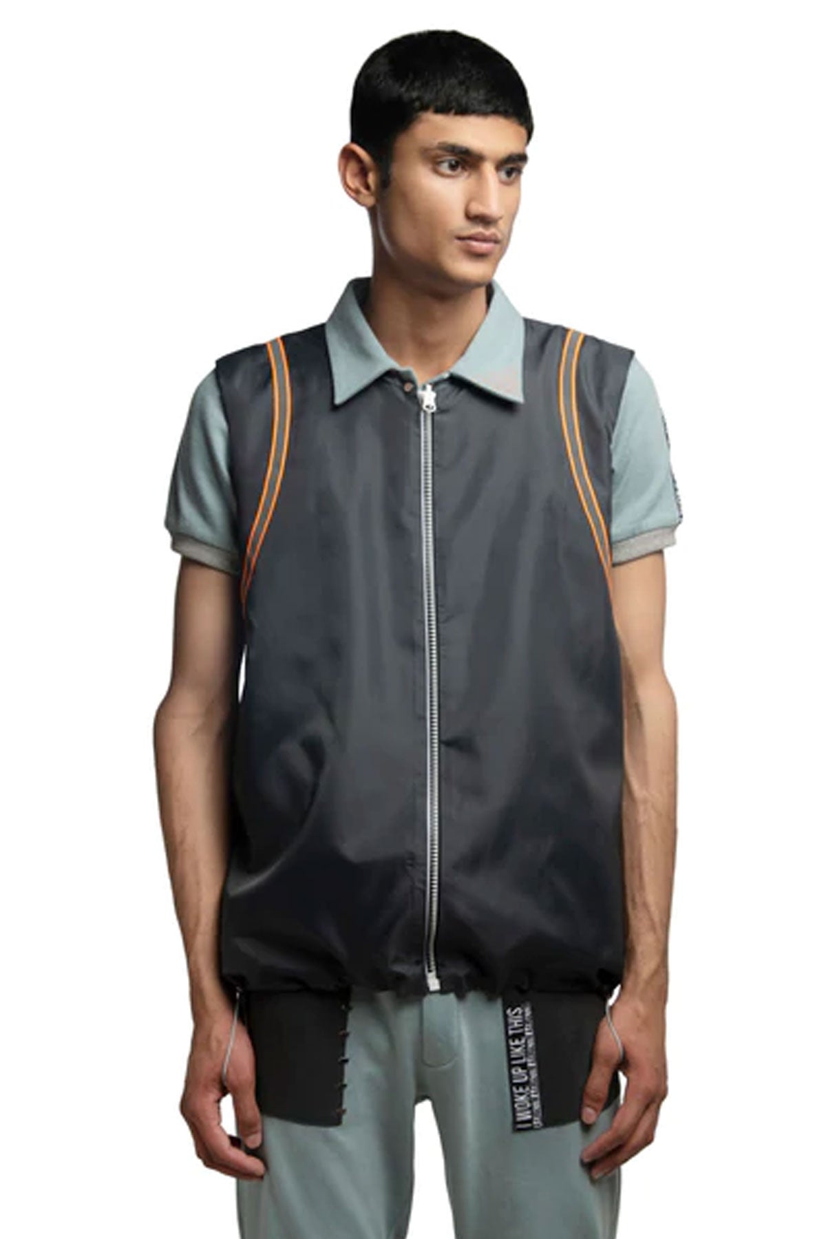 Reversible sleeveless windcheater vest. “Level Up” stripe pattern in multicolour throughout. Box backpack at back. Orange reflective tape at back. Two-toned reversible zip closure at front. Signature ALL2DEFY trimming at pocket. Tonal stitching. Reverse in charcoal grey windcheater. Box pocket at back. Stitch detail and staple hardware at pocket. Orange reflective tape at back. Signature ALL2DEFY trimming at pocket.