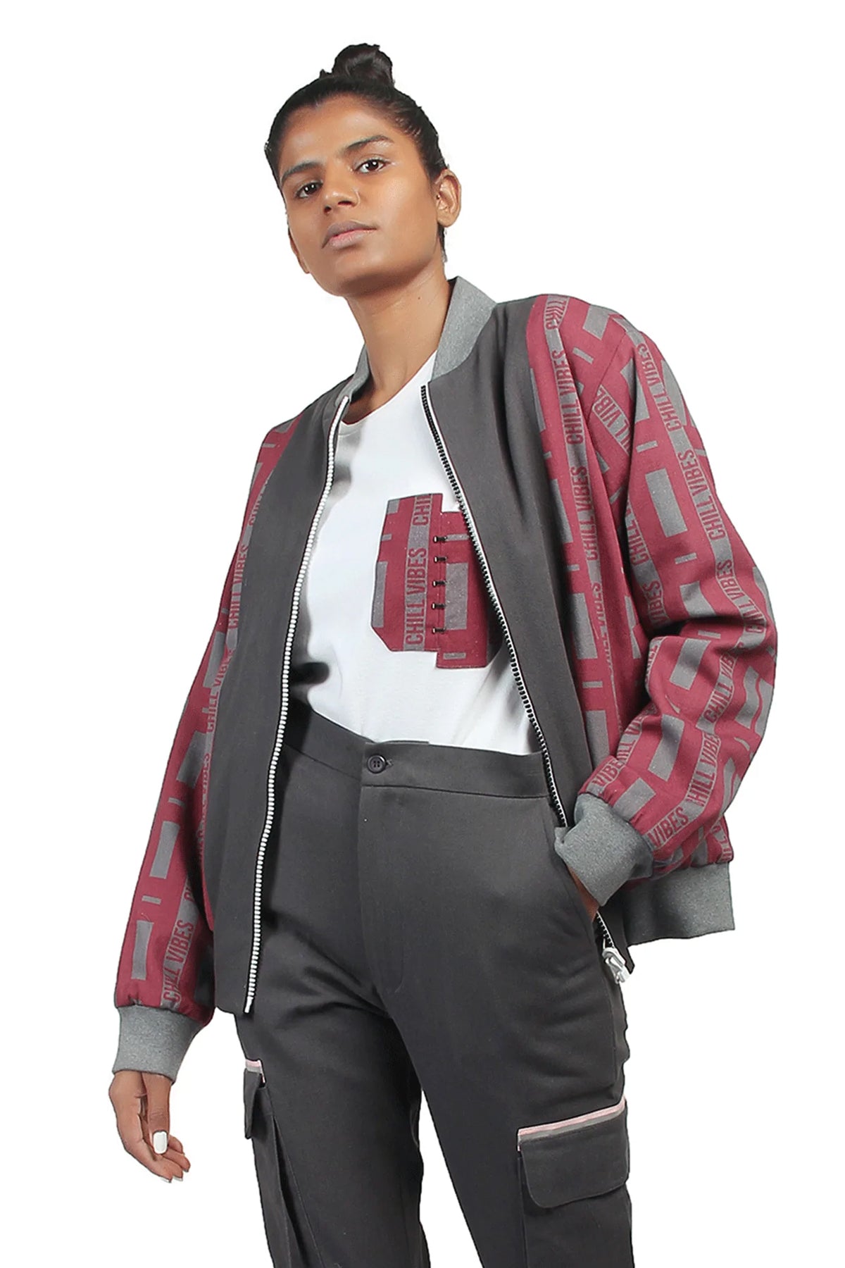 Reversible long sleeve denim bomber. “Chill Vibes” geometric pattern in multicolour throughout. Charcoal grey trimming at front. Welt pockets at waist. Rib knit stand collar, cuffs, and hem. Two-toned reversible zip closure at front. Signature ALL2DEFY trimming at sleeve. Reverse in charcoal grey denim. Box pockets at chest. Pink reflective tape at front.