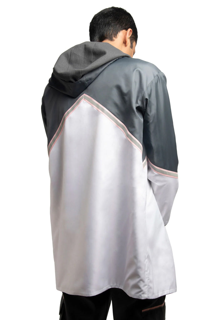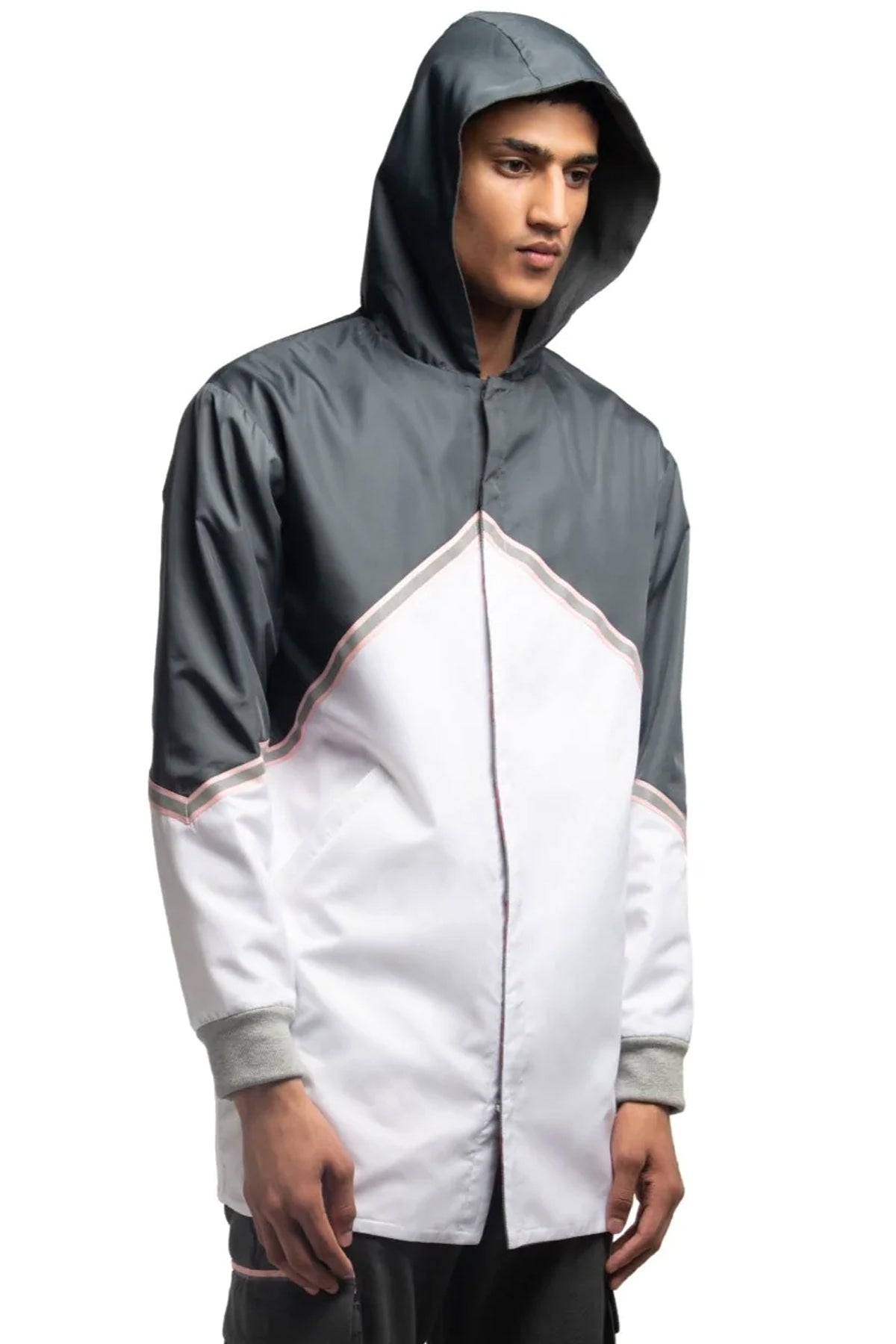 Reverse in charcoal grey and white windcheater. Pink reflective tape at front. Welt pockets at waist.