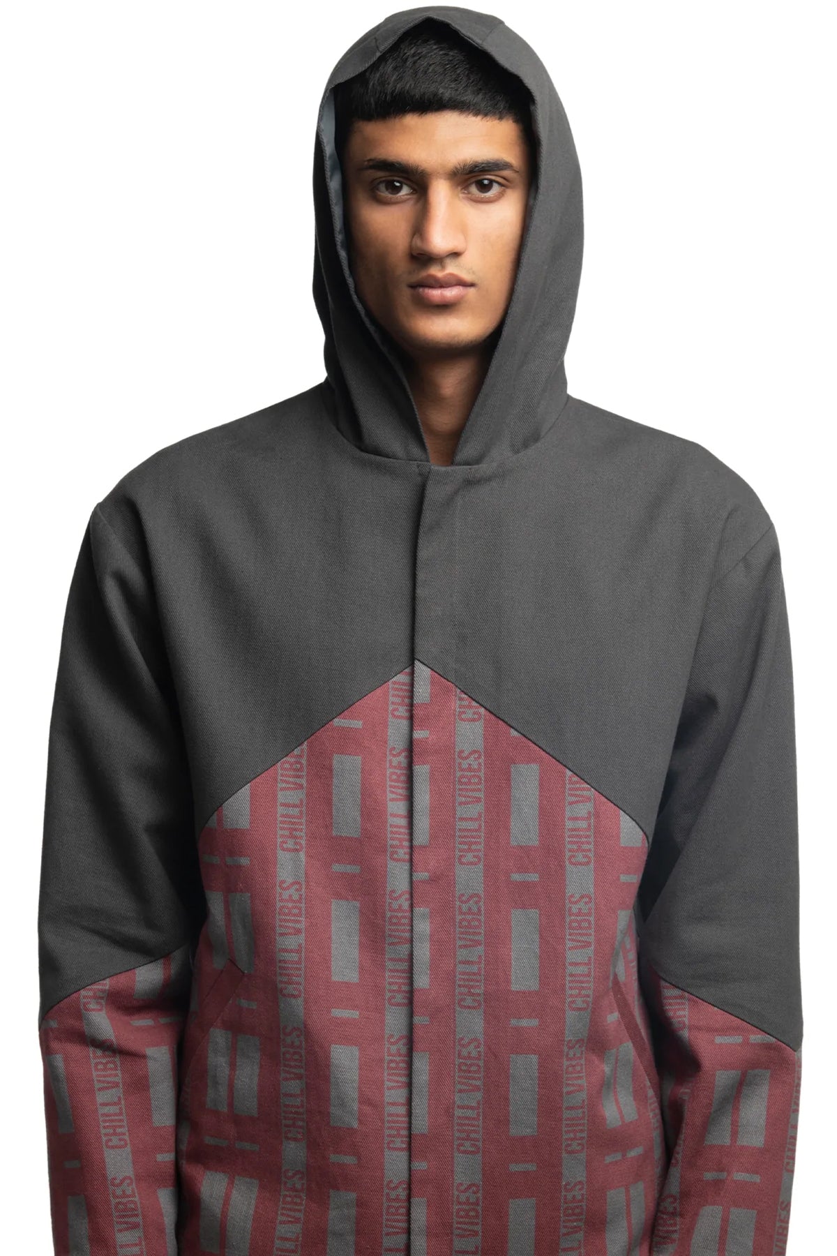 Reversible long sleeve denim hoodie. “Chill Vibes” geometric pattern in multicolour at bottom. Denim in white at top. Welt pockets at waist. Reversible snap closure at front. Tonal stitching. Signature ALL2DEFY trimming at sleeve.