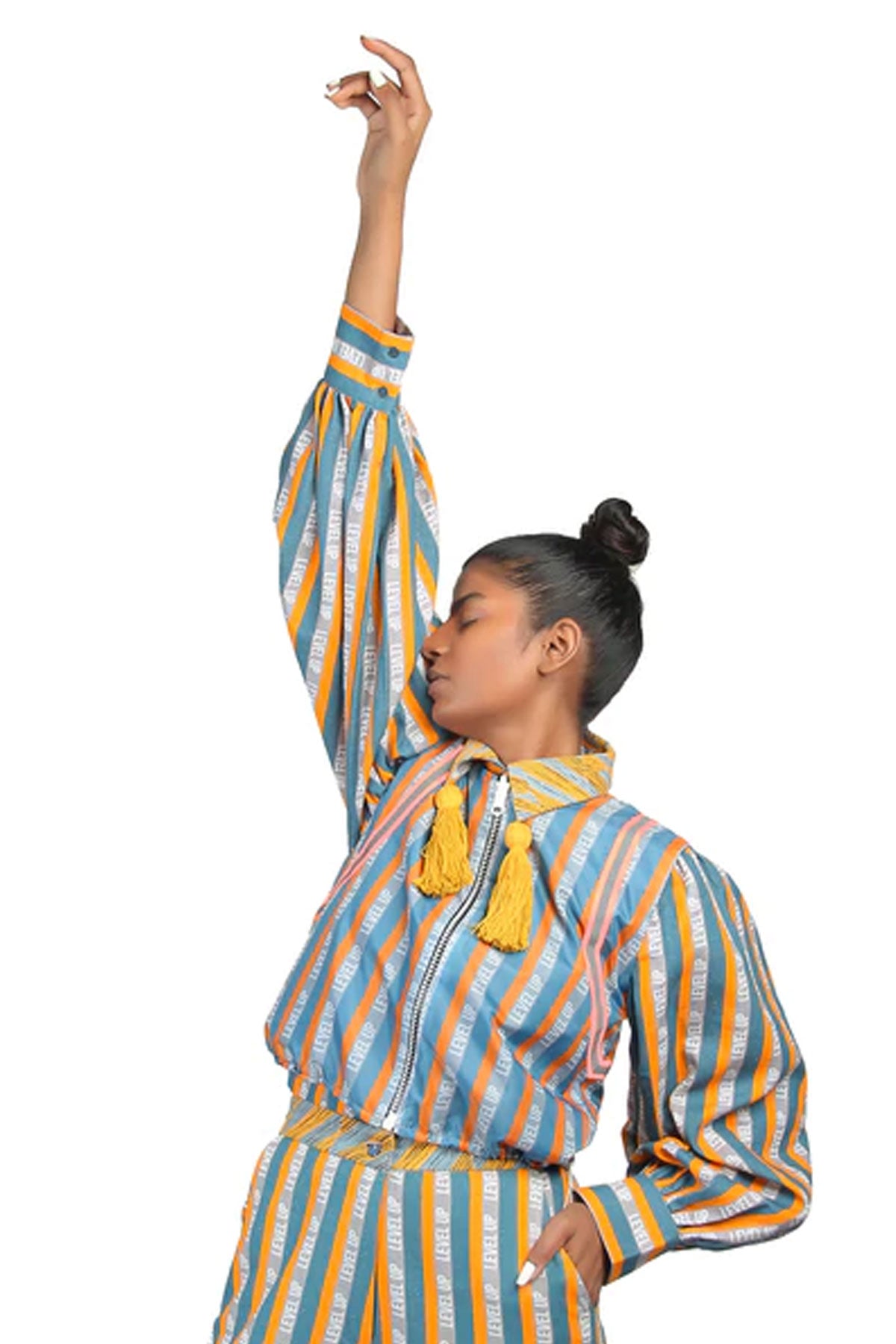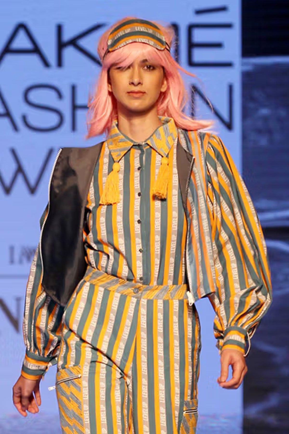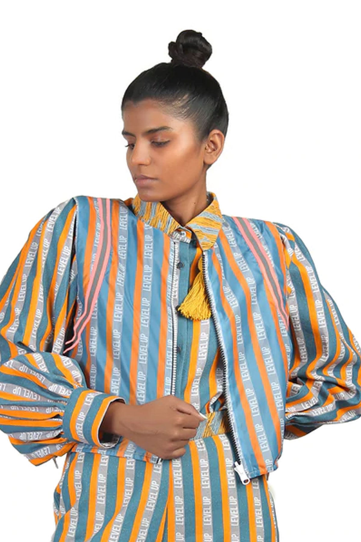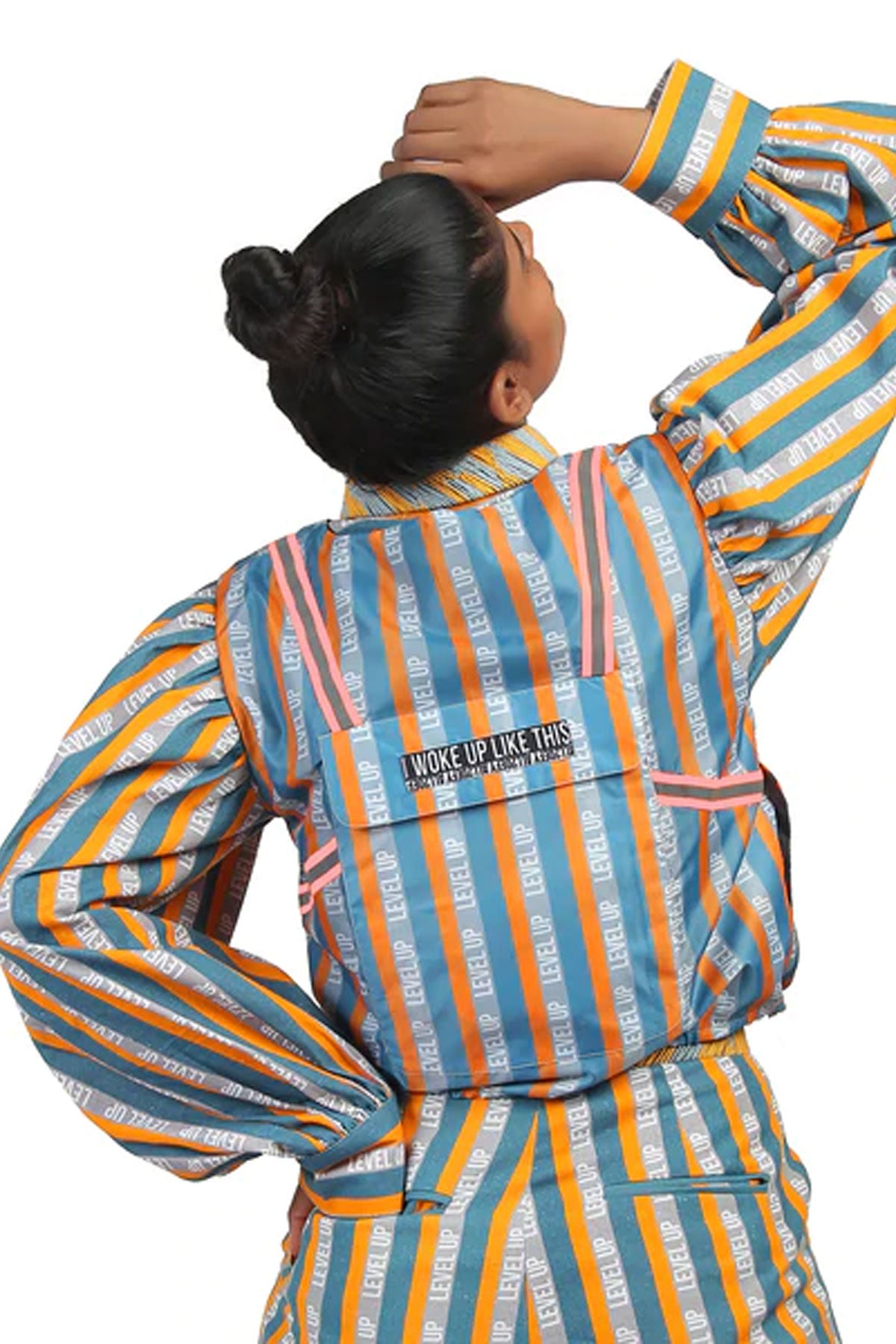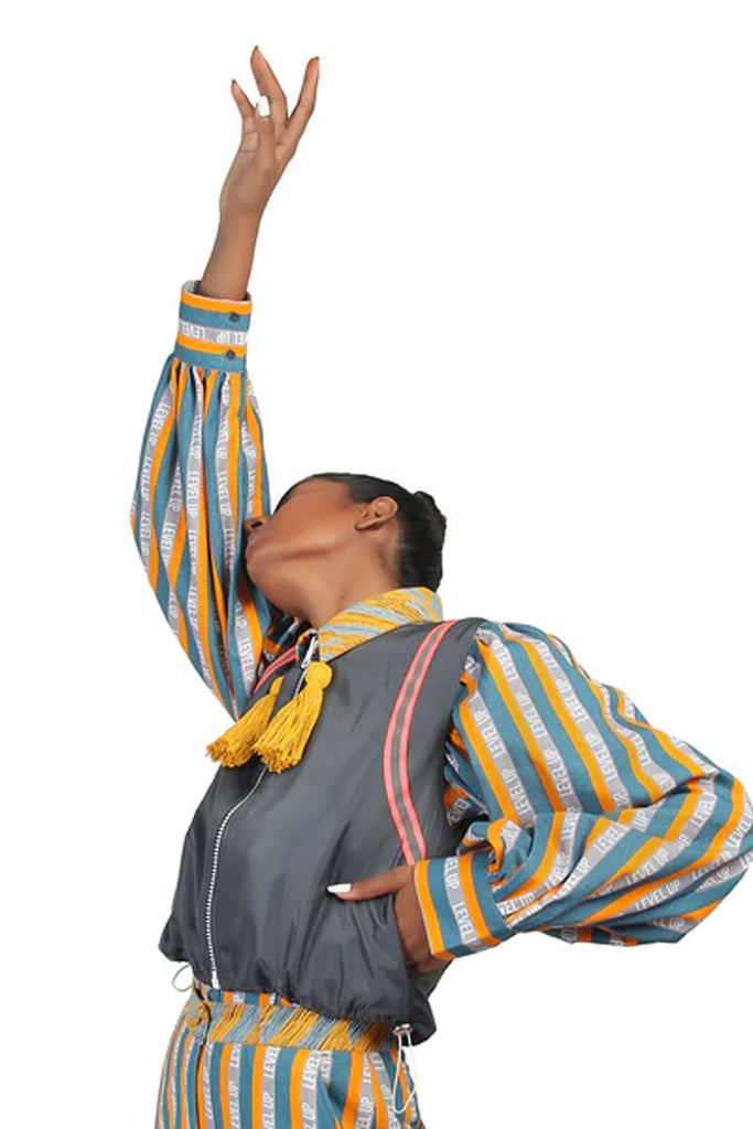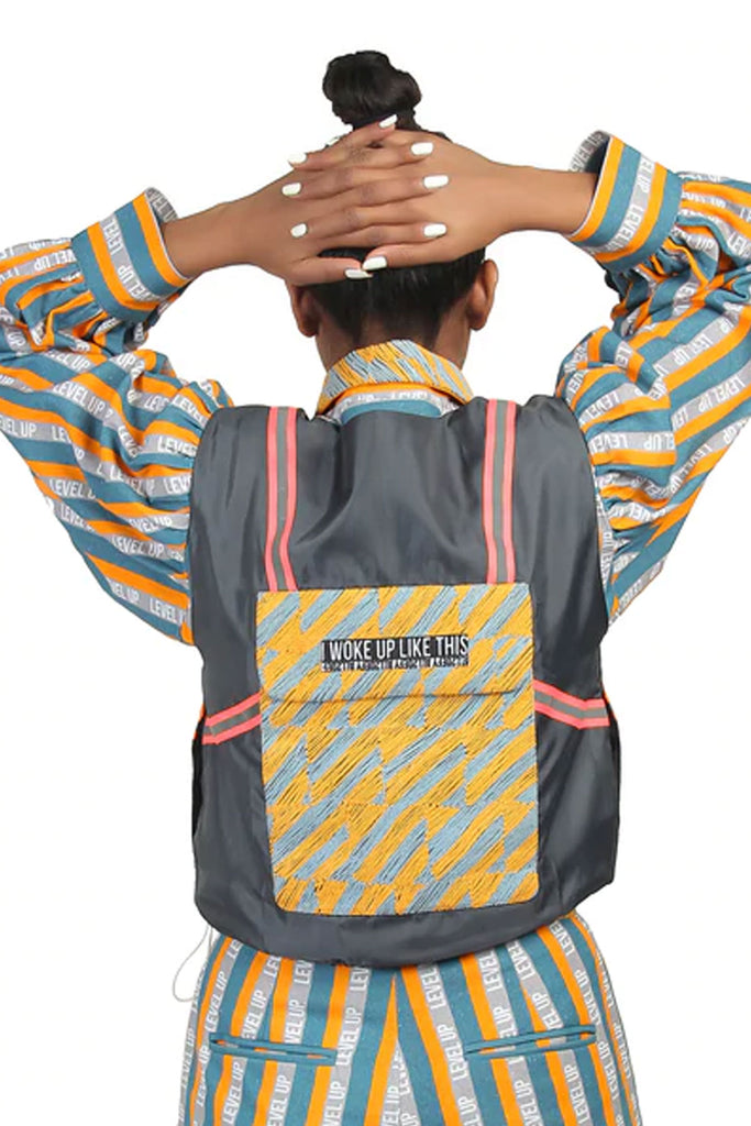 Reversible sleeveless windcheater vest. “Level Up” stripe pattern in multicolour throughout. Box backpack at back. Pink reflective tape at armwhole. Two-toned reversible zip closure at front. Signature ALL2DEFY trimming at backpack. Tonal stitching. Reverse in charcoal grey windcheater. Box backpack at back. Geometric embroidery in multicolour at backpack. Pink reflective tape at armwhole. Signature ALL2DEFY trimming at backpack.