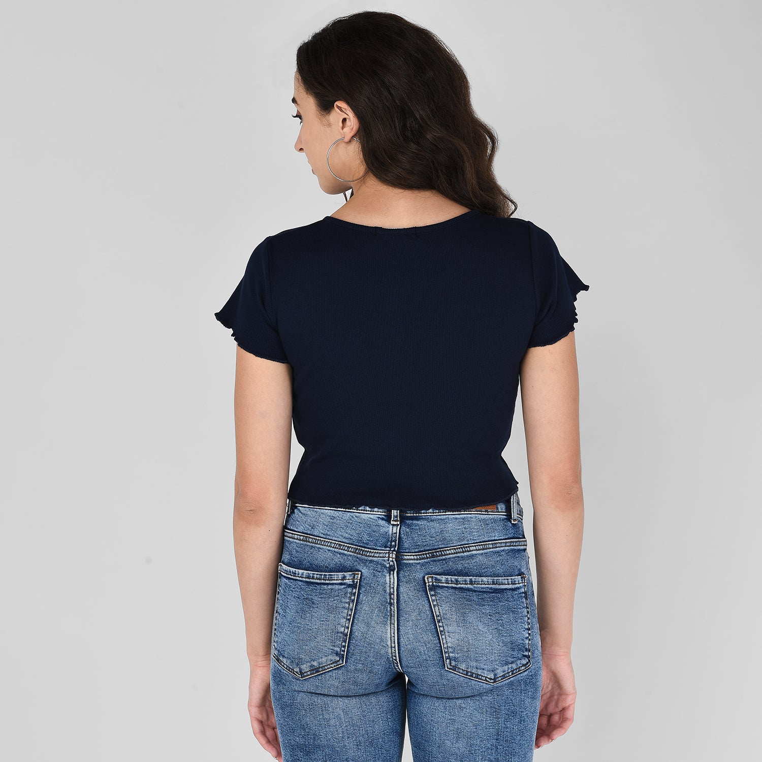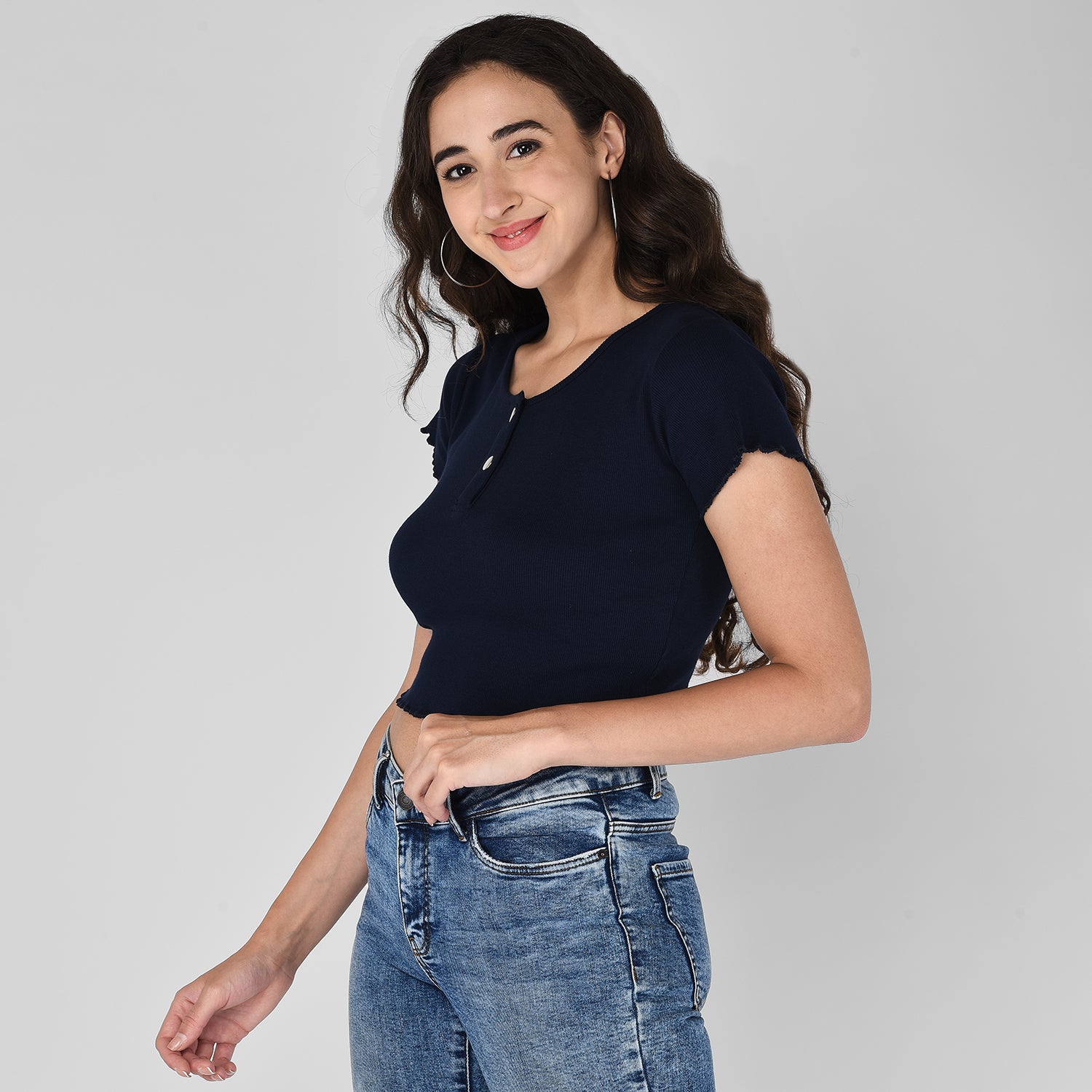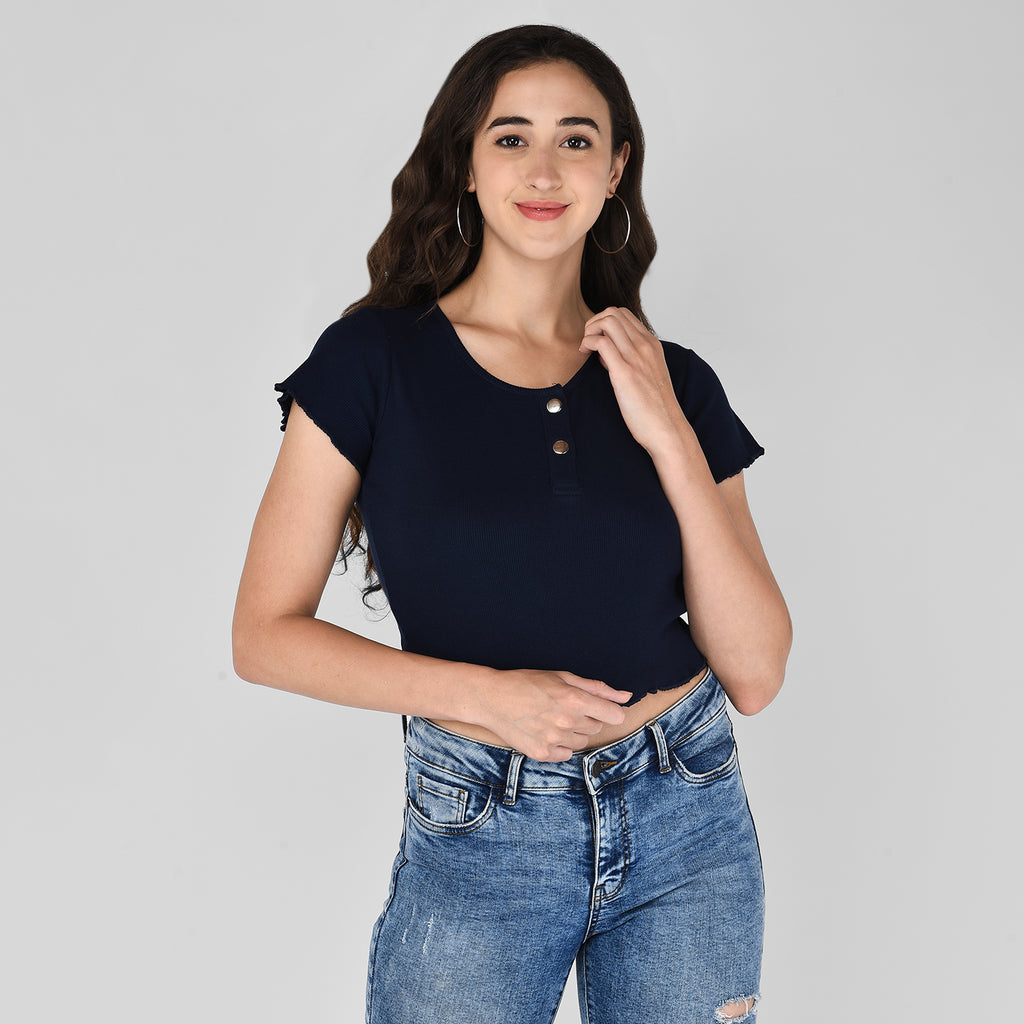 With a dash of cuteness, we bring you this basic rib top, which is crafted from high-quality cotton fabric and features a round neckline and short sleeves. This crop top makes for the perfect going-out pick. Accessorize this crop top minimally and step into a good pair of sneakers to complete the look for a casual brunch or a fun Sunday picnic.