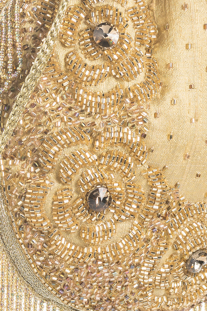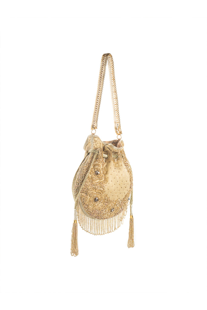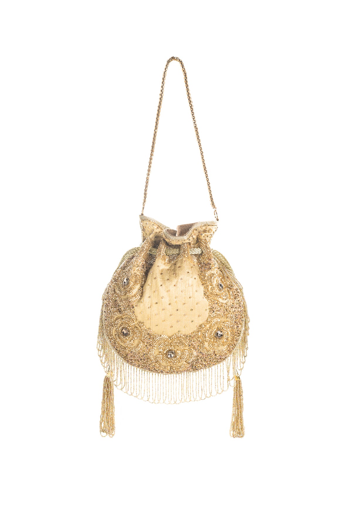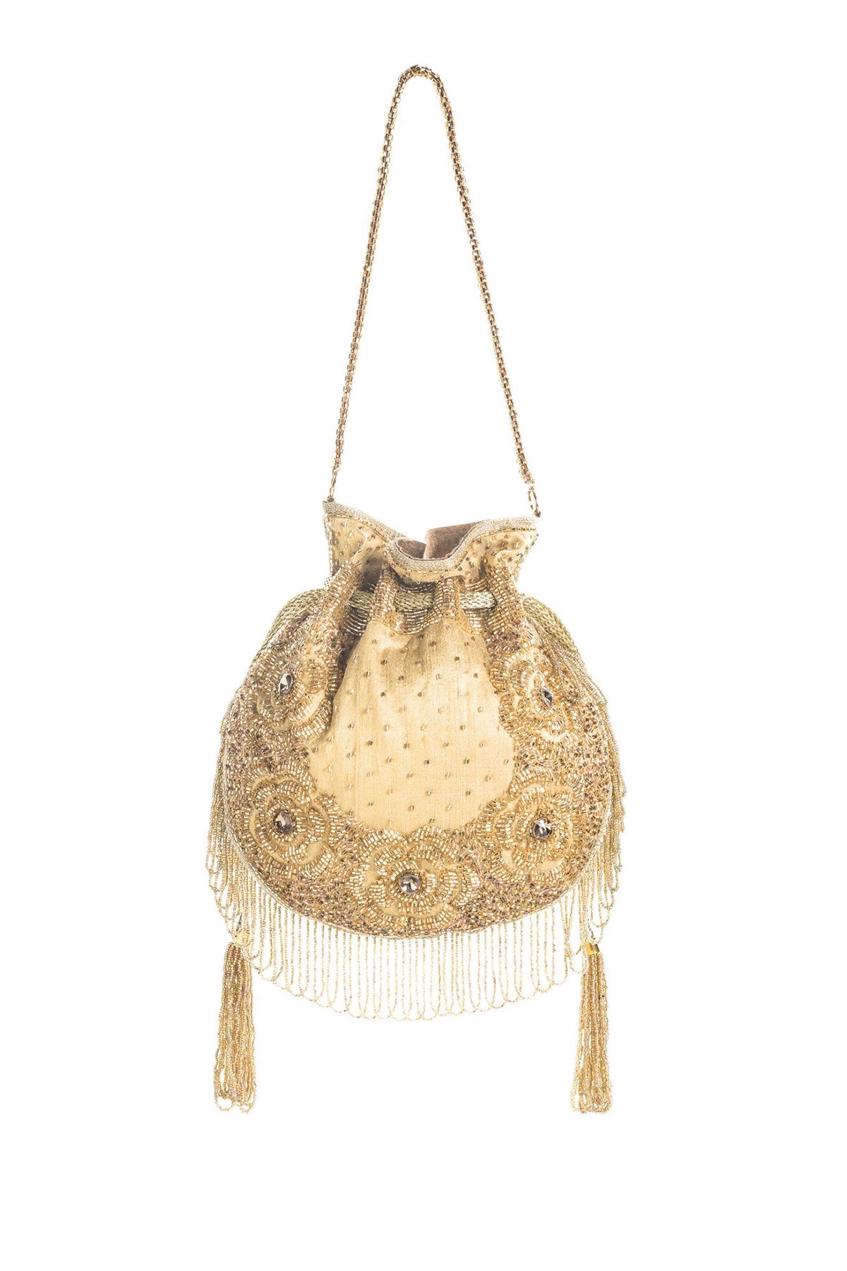 Raw silk potli bejewelled with crystals and kardana embroidery, finished with kardana tassels at the bottom.