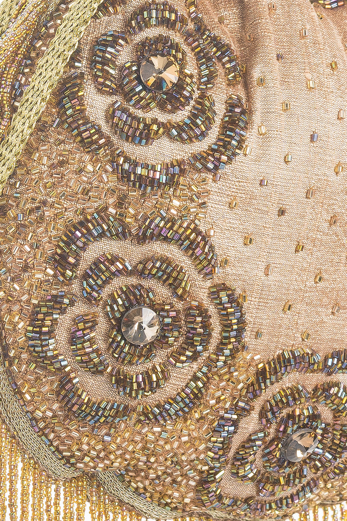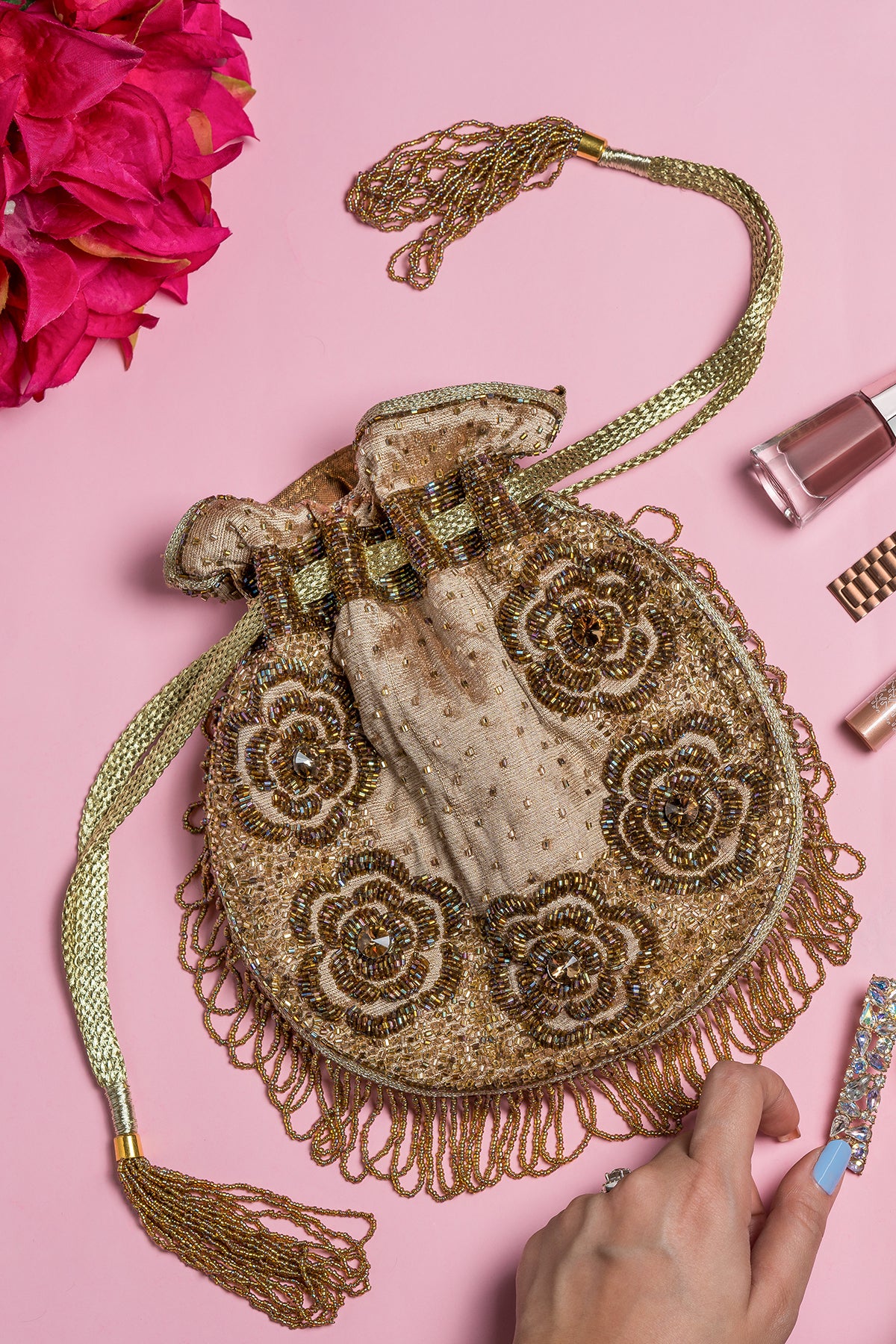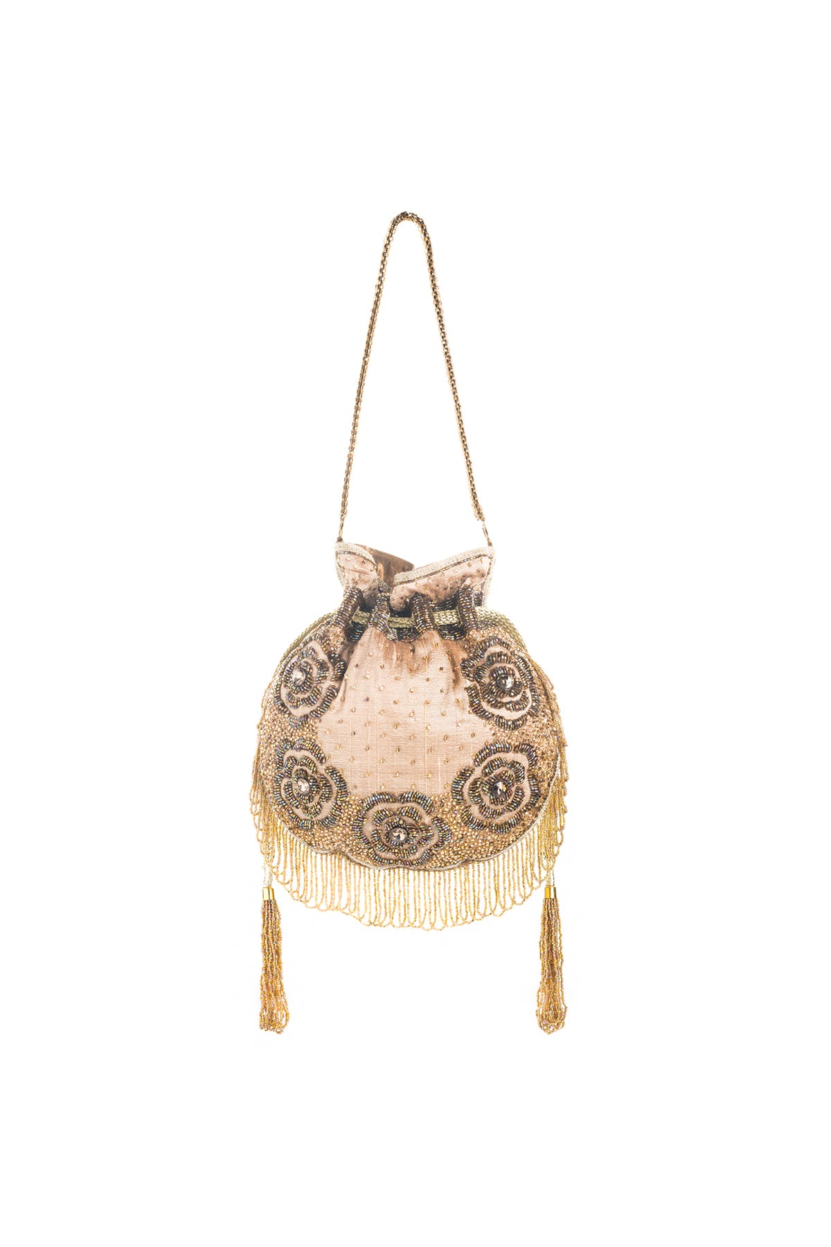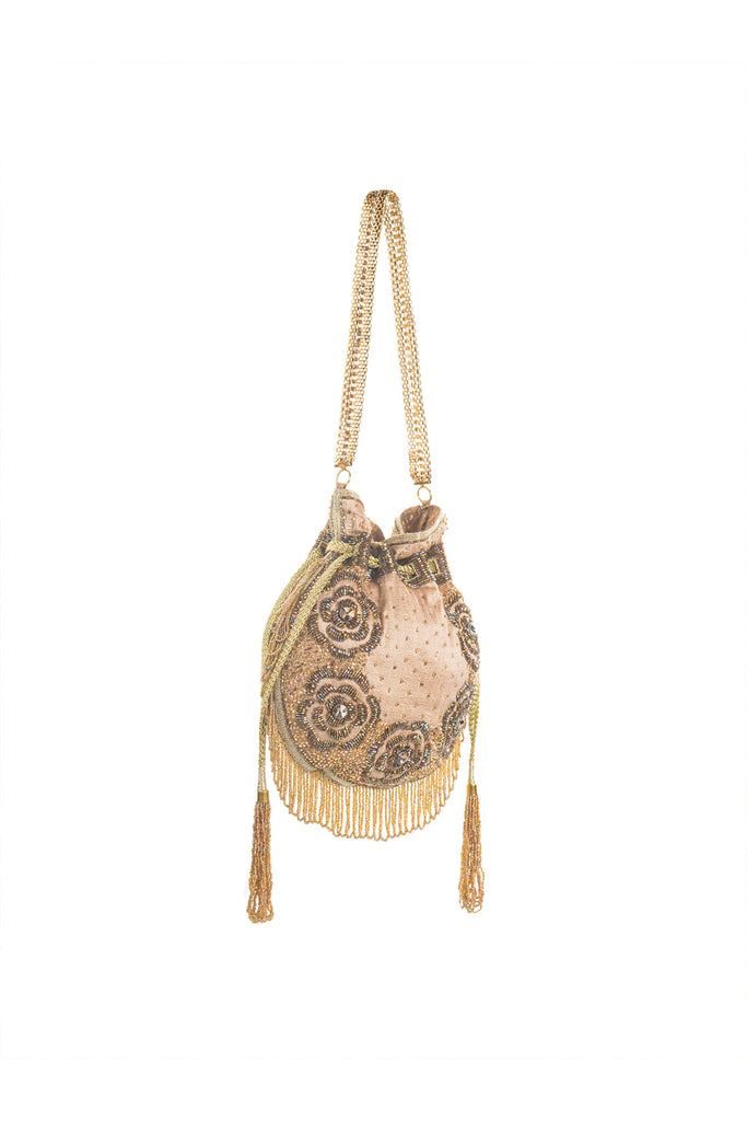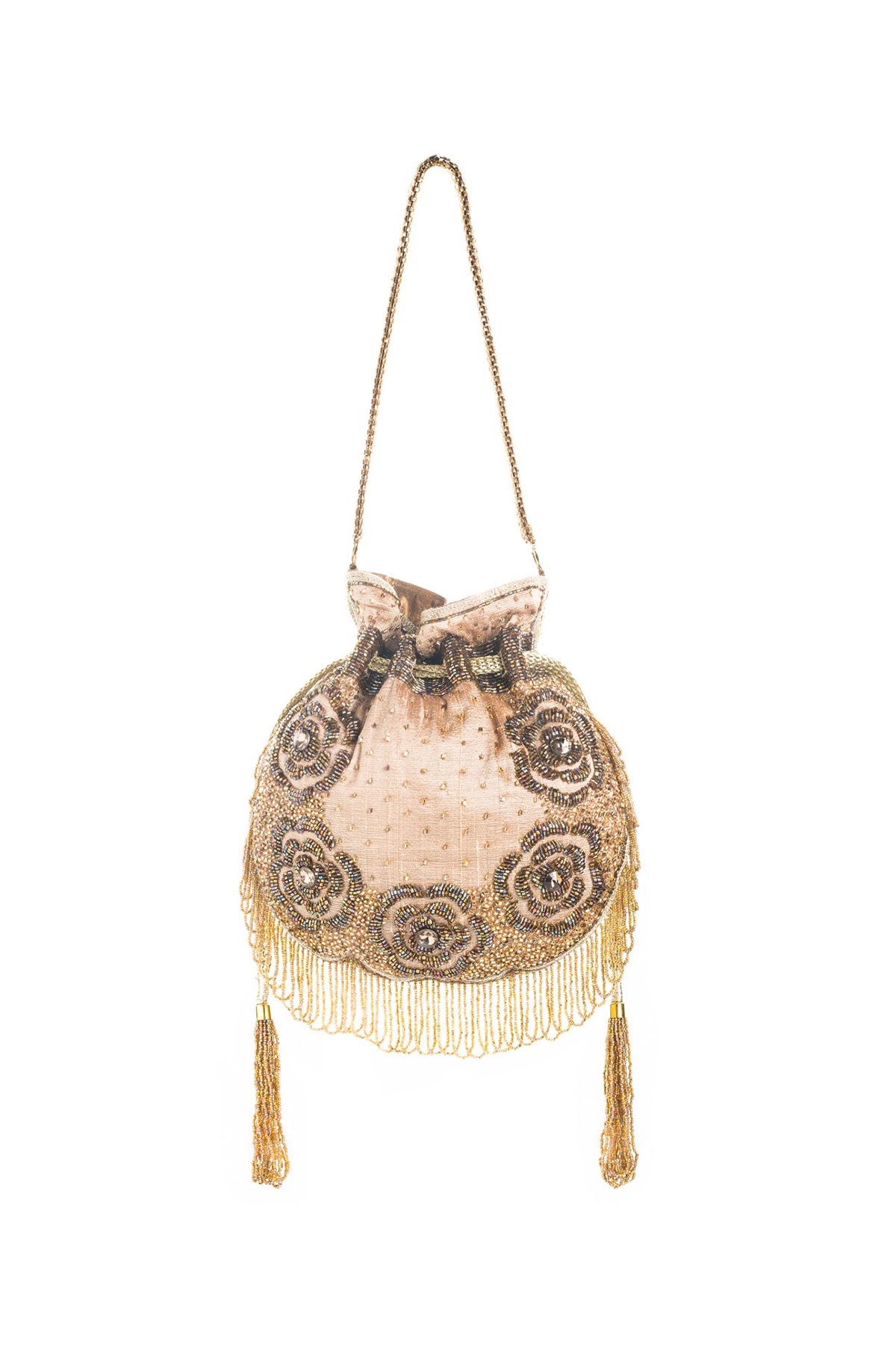Raw silk potli bejewelled with crystals and kardana embroidery, finished with kardana tassels at the bottom.