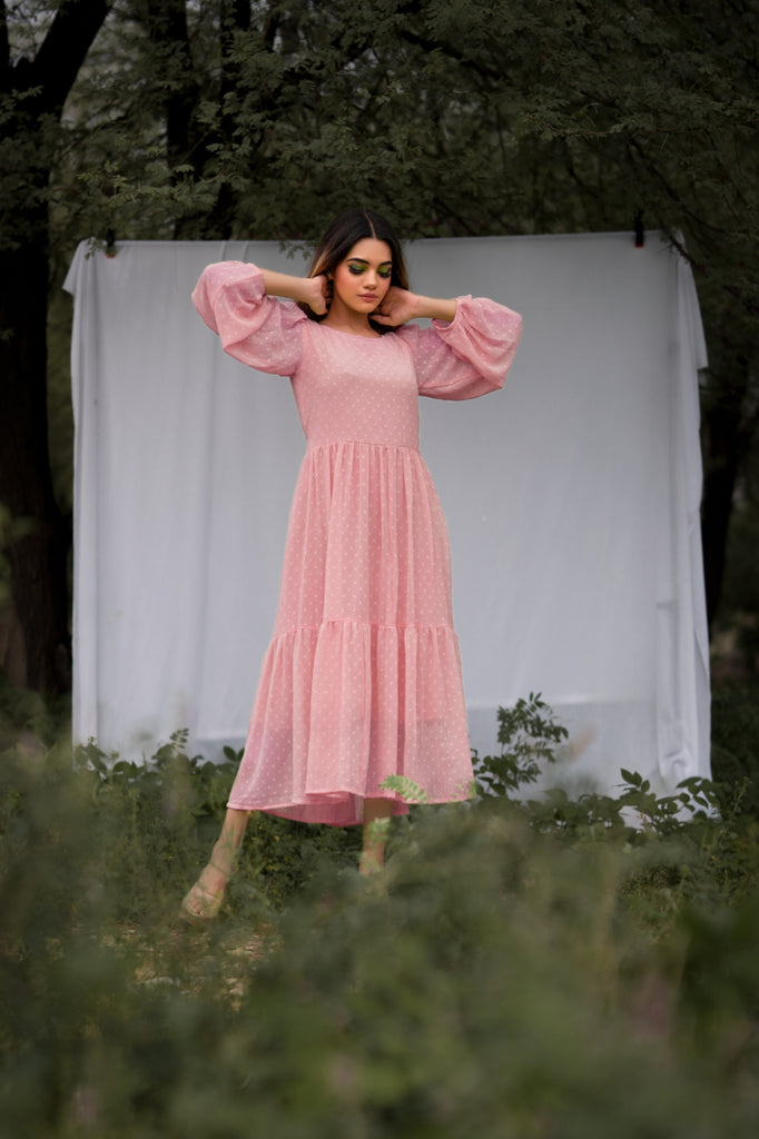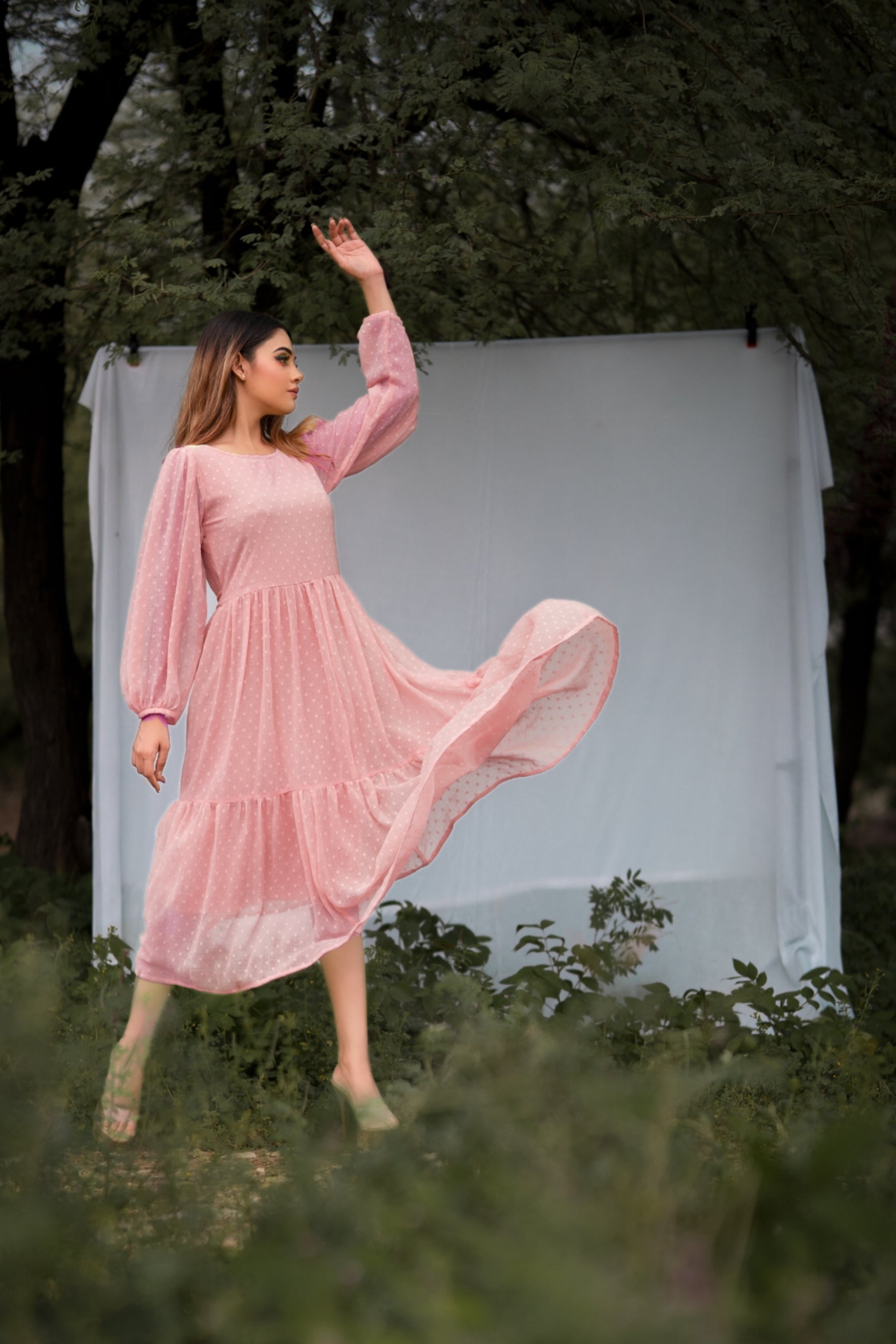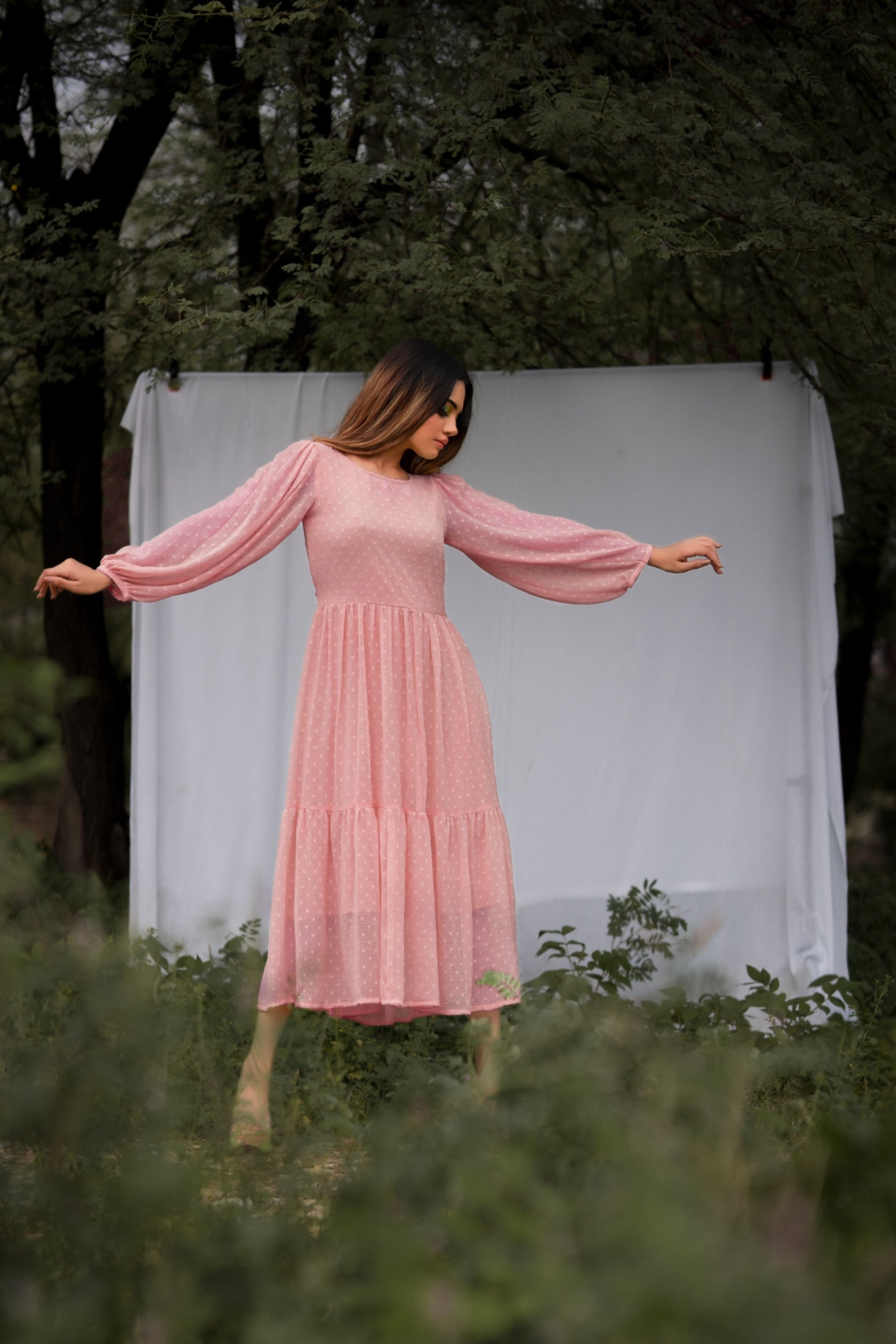featuring this very beautiful midi princy tier dress handcrafted by MannMani. it has round neck, full sleeves, and 2 tiers.It has a very soft light weight and breathable fabric. Style this outfit with high heels and minimal hairstyle. shop online now from MannMani.