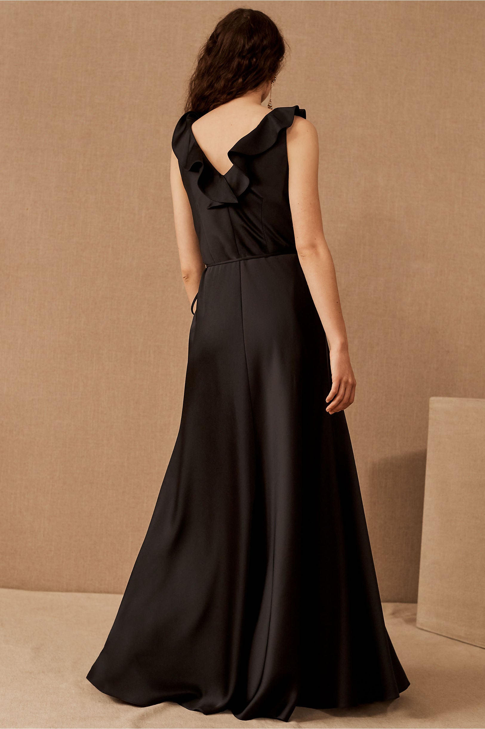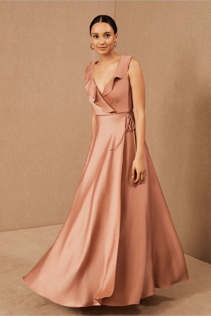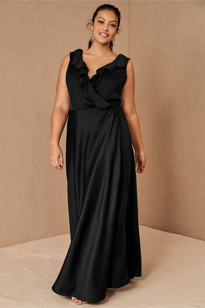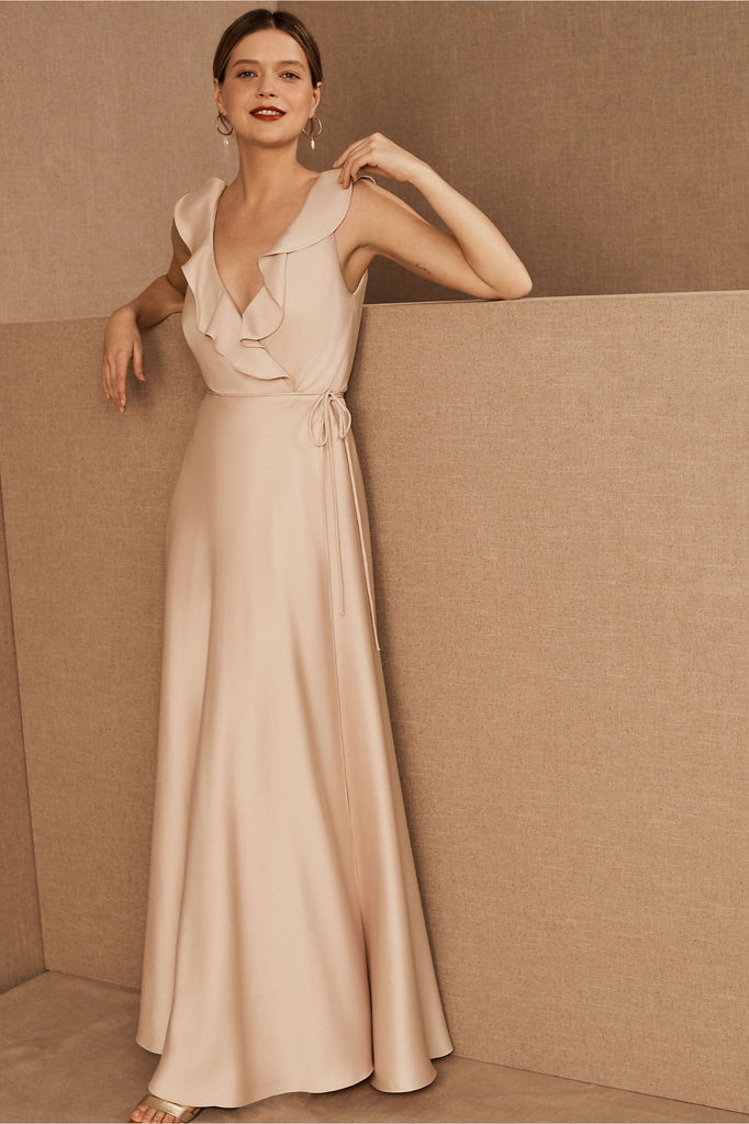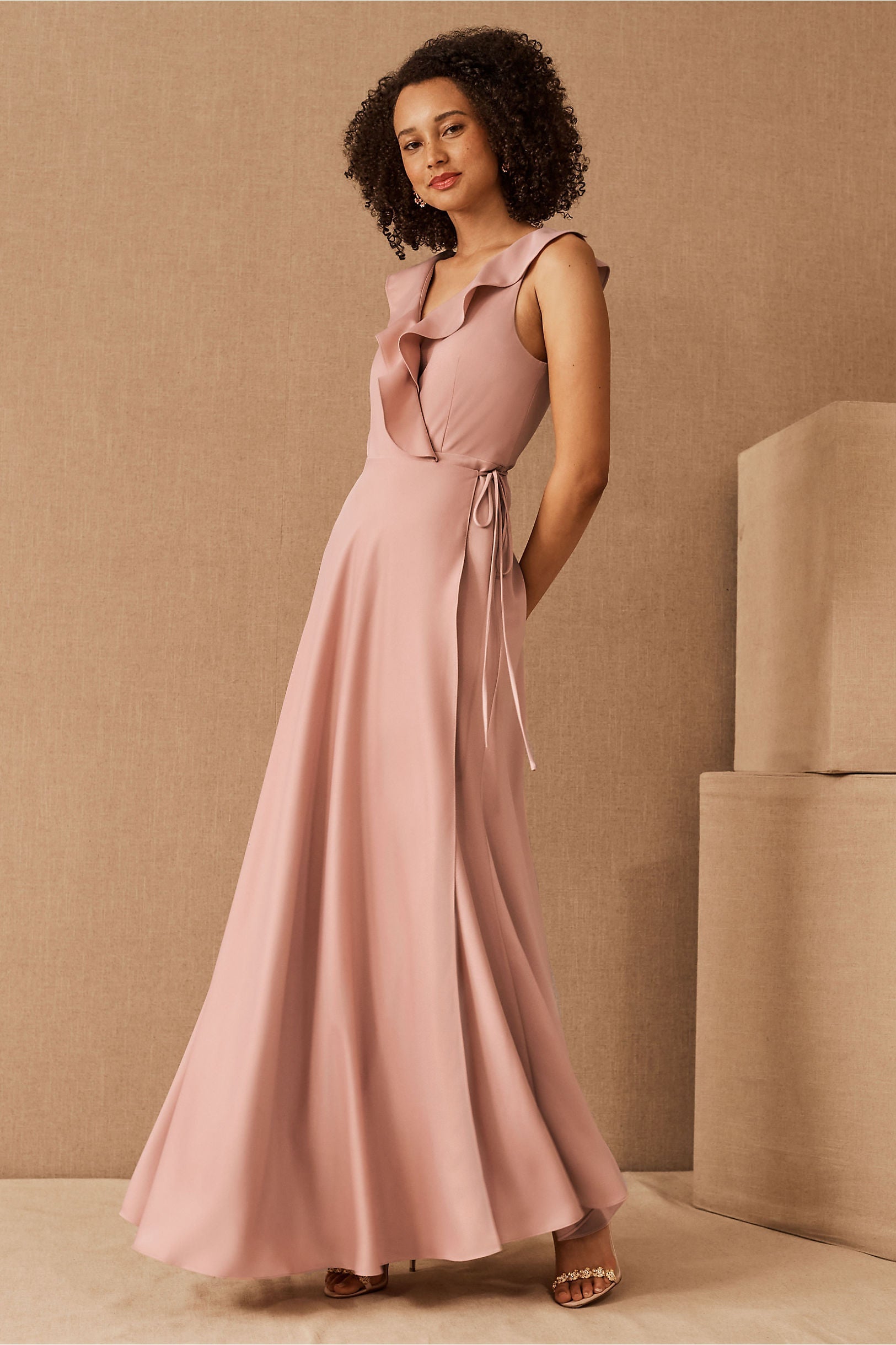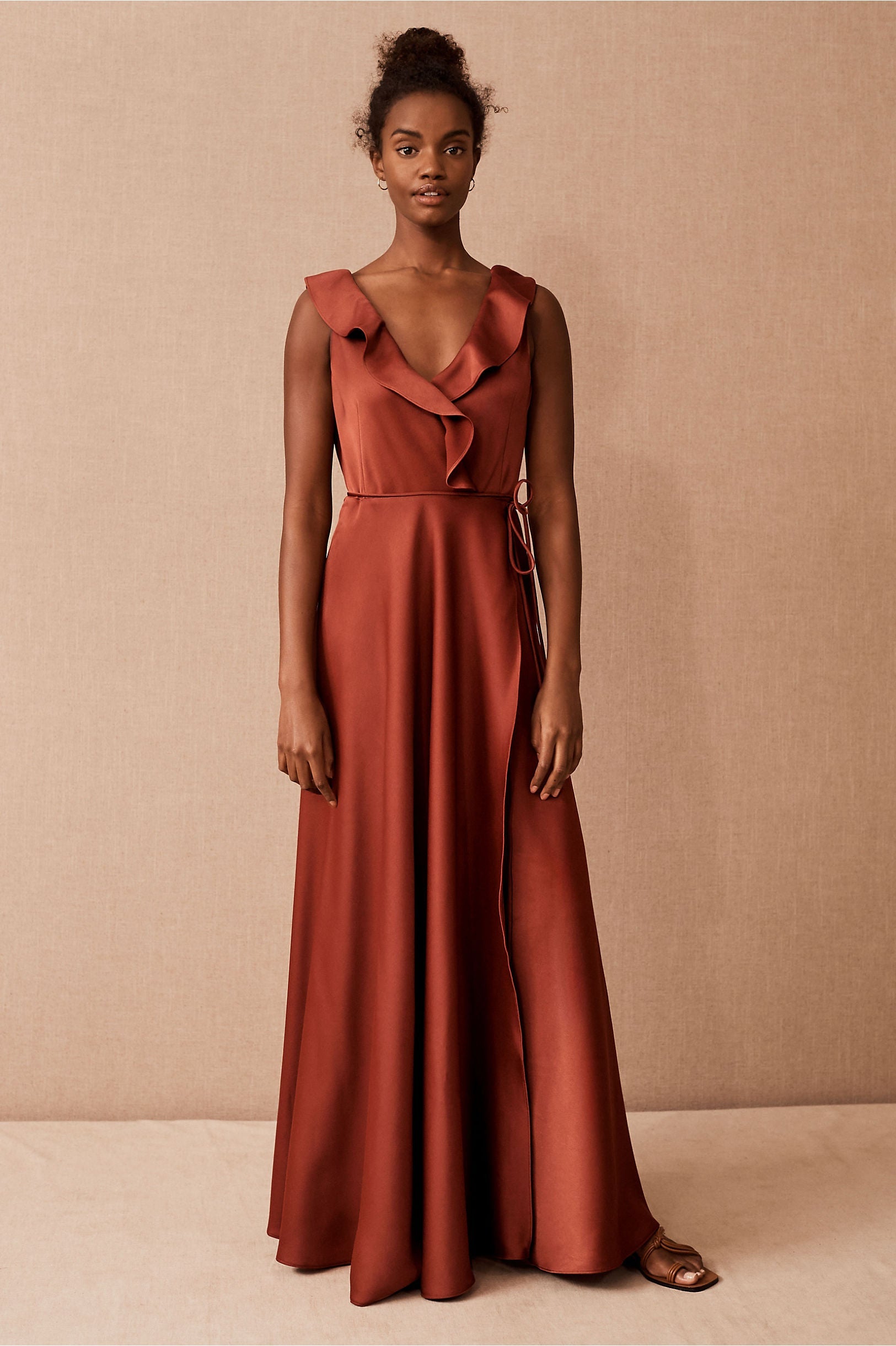 A ruffled neckline pours into a silky wrapped silhouette as a tie detail tops the flowy, floor length skirt. Tie closure Polyester; polyester lining