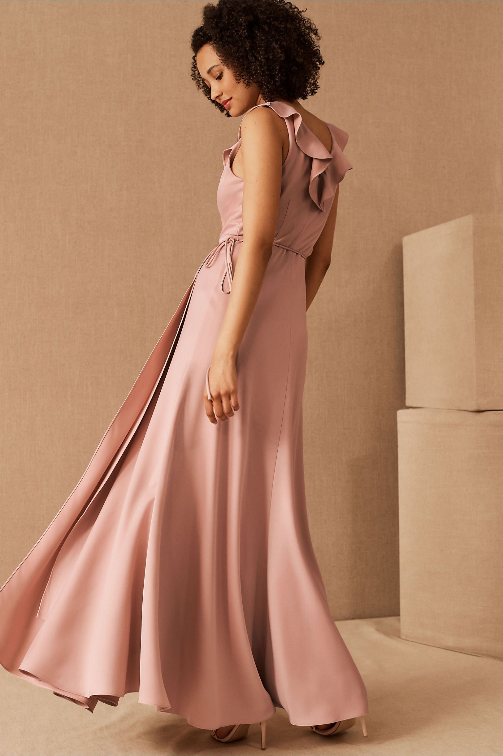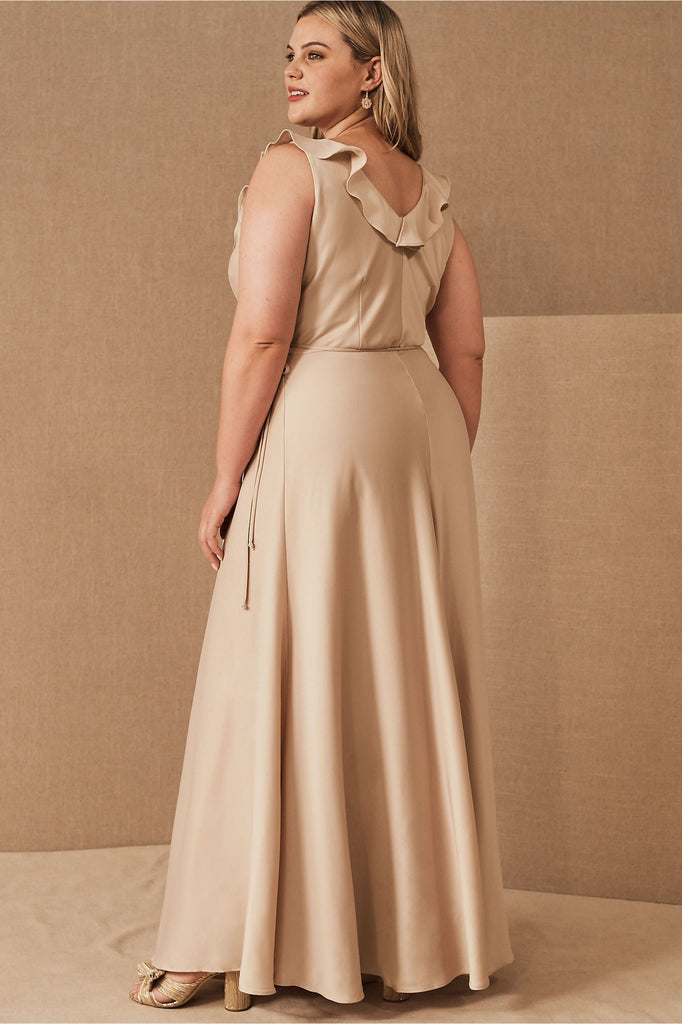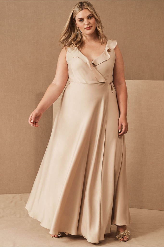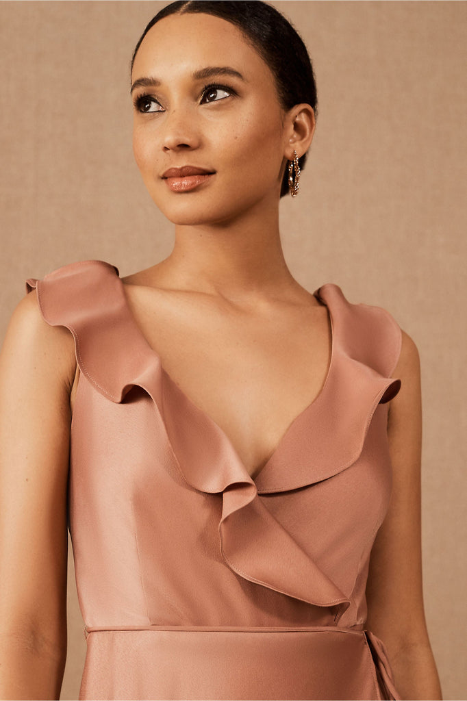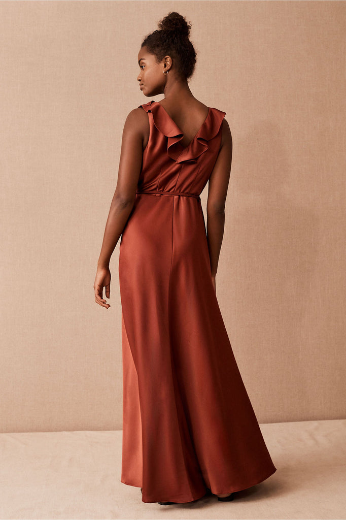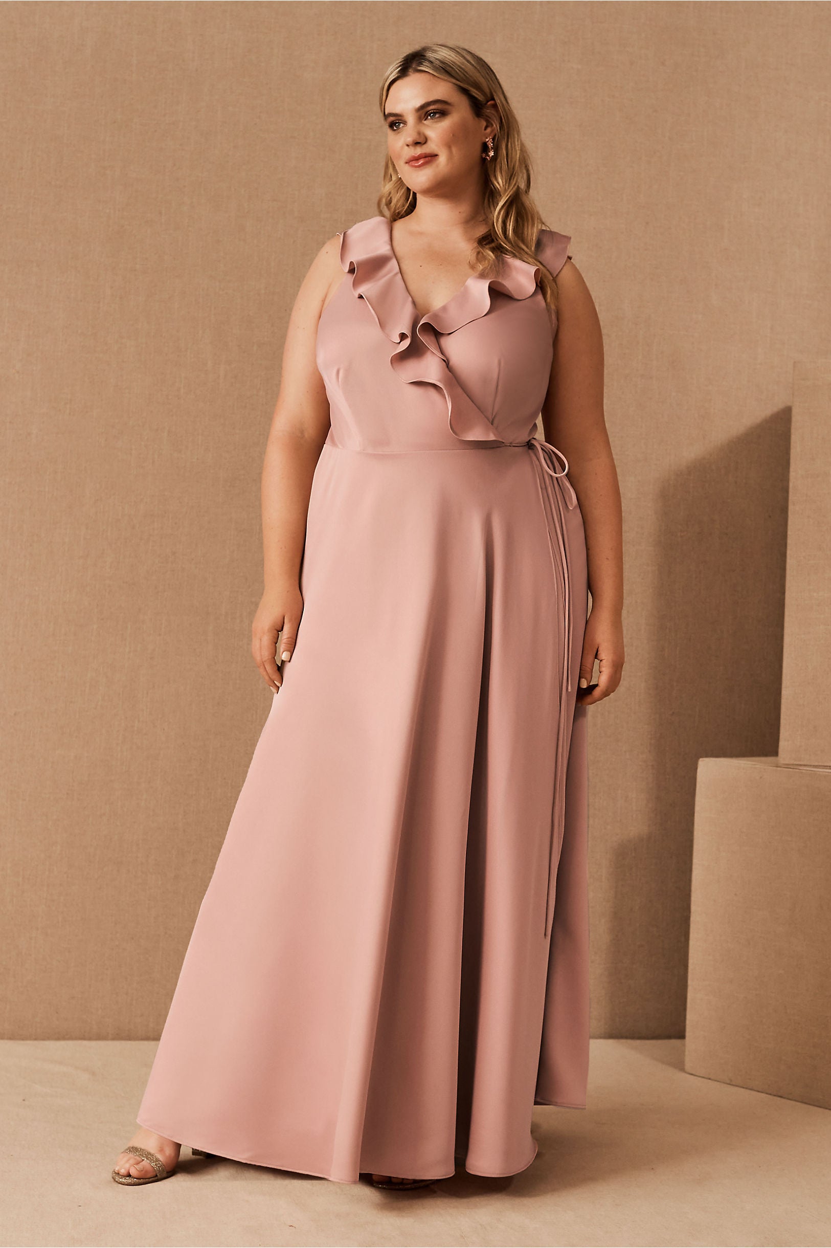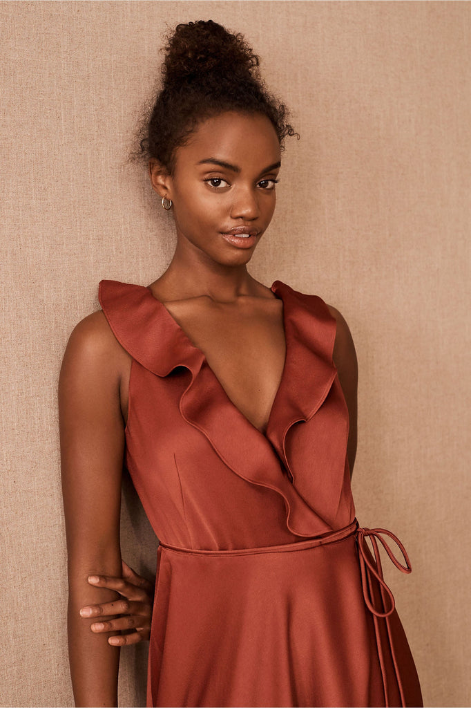 A ruffled neckline pours into a silky wrapped silhouette as a tie detail tops the flowy, floor length skirt. Tie closure Polyester; polyester lining