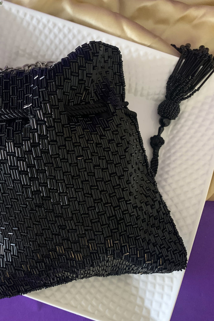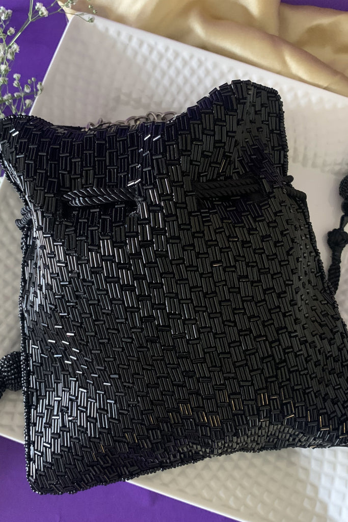 Black saali work potli. The potli comes with a removable metallic handle which is encrusted with stone work. A chain is provided to enable you to wear the potli on your shoulder and be handsfree. Work on both sides.