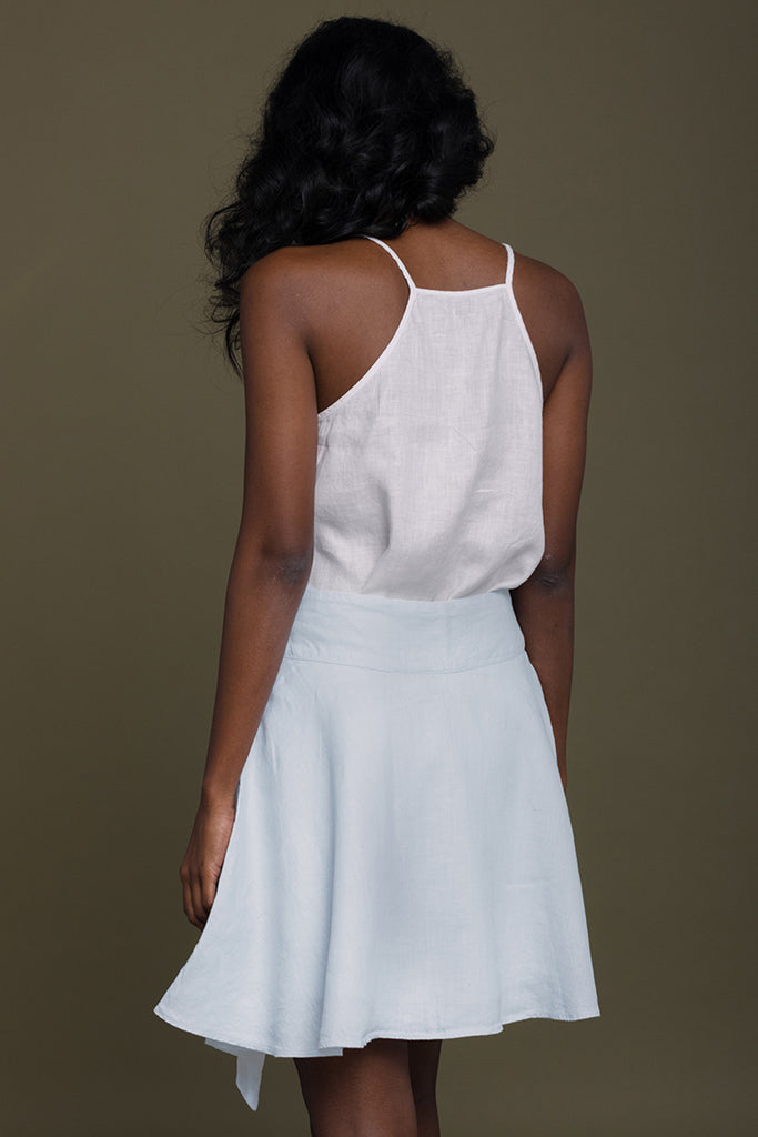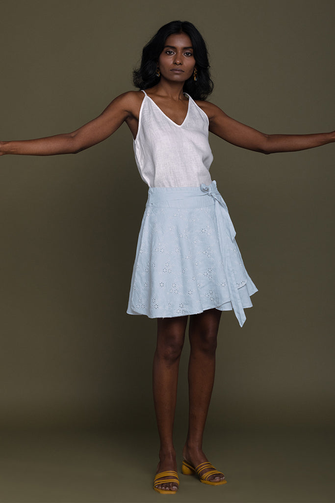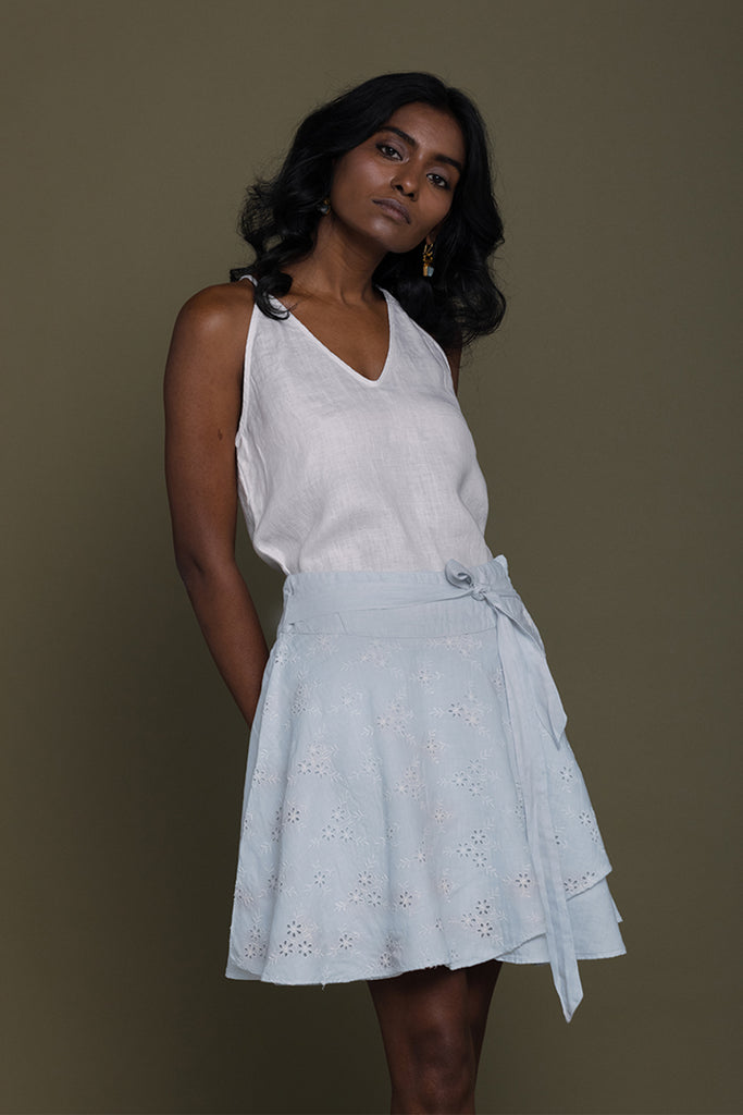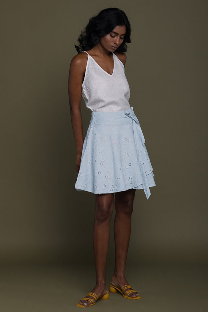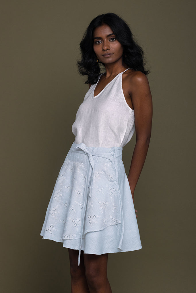With a floral motif embroidered layer, this wraparound banded-waist skirt with a tie-up belt has a fun and feminine feel.