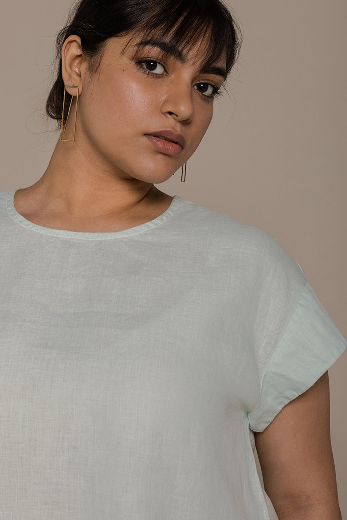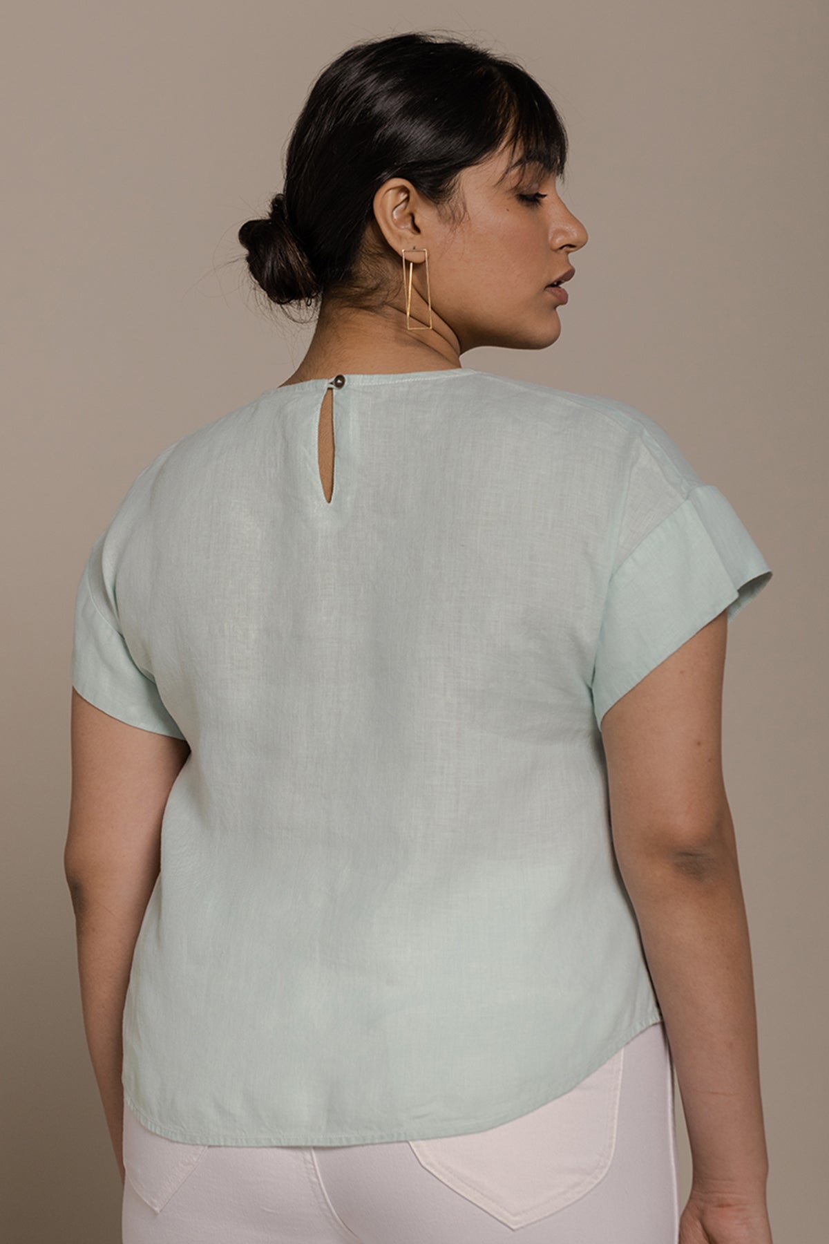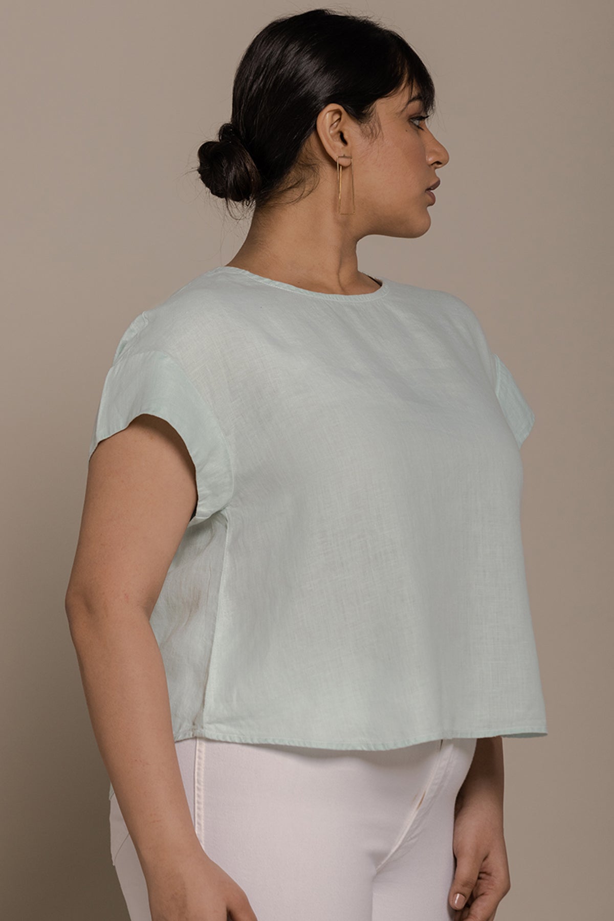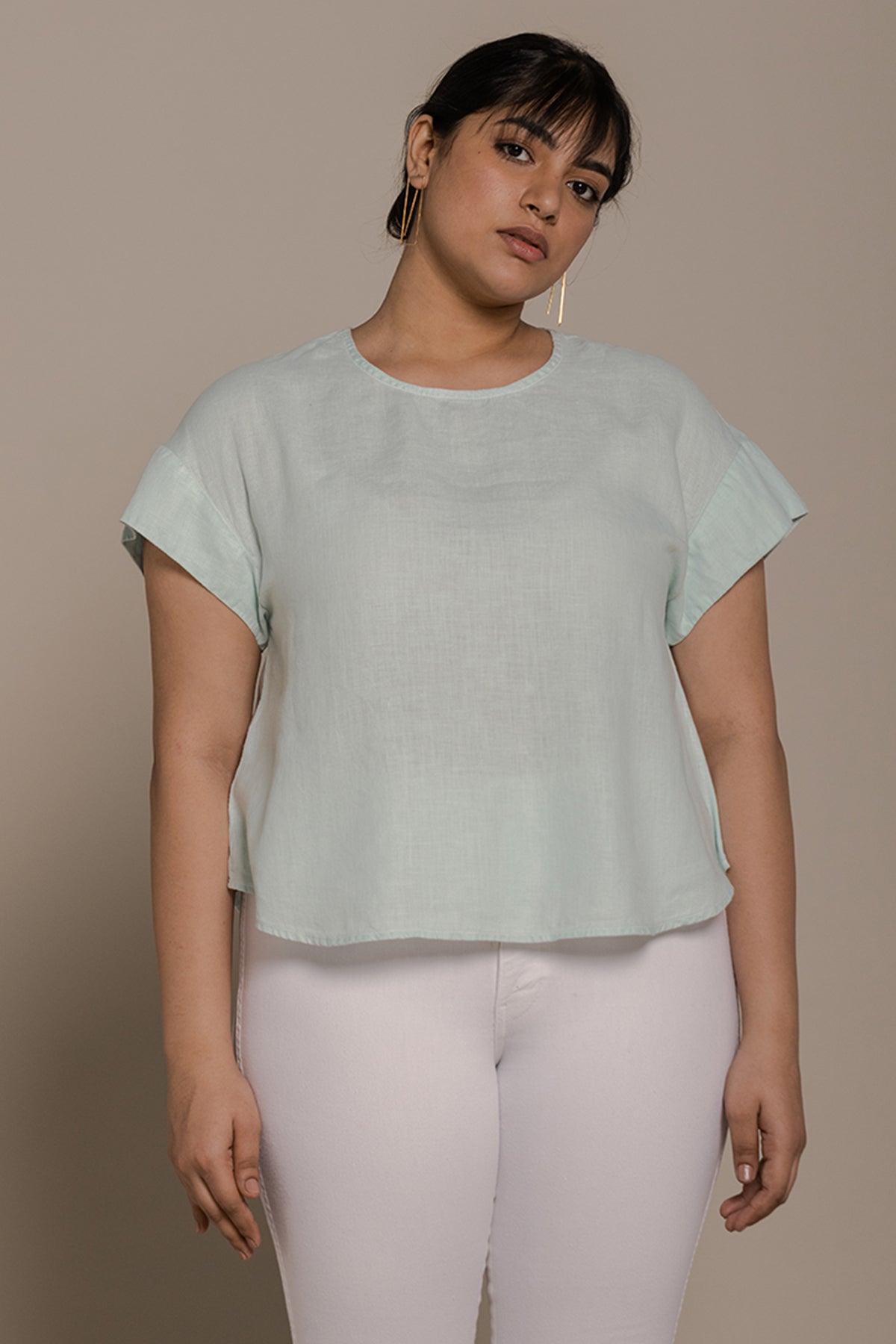 For a cool and casual look, this top with a peephole back and mini sleeves is timeless!
