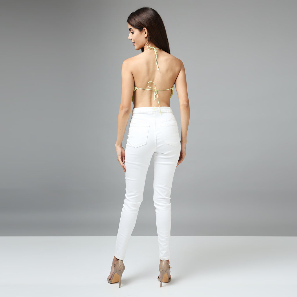 Take your party ensembles up a notch with this lemon crop top. Crafted in satin, this top features a cowl neck and an open back and is definitely a head-turner. Style it with wide-leg pants, block heels and a shoulder bag for brunch with your girlfriends, or team it up with a mini skirt, block heels and a shimmering clutch for date night.