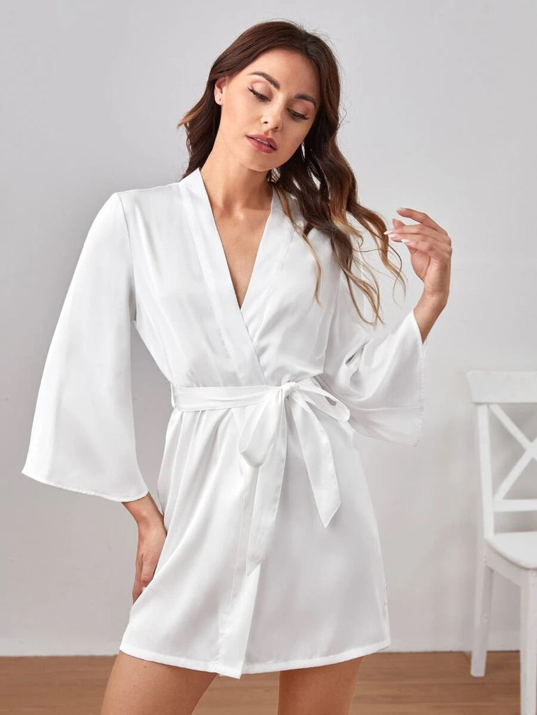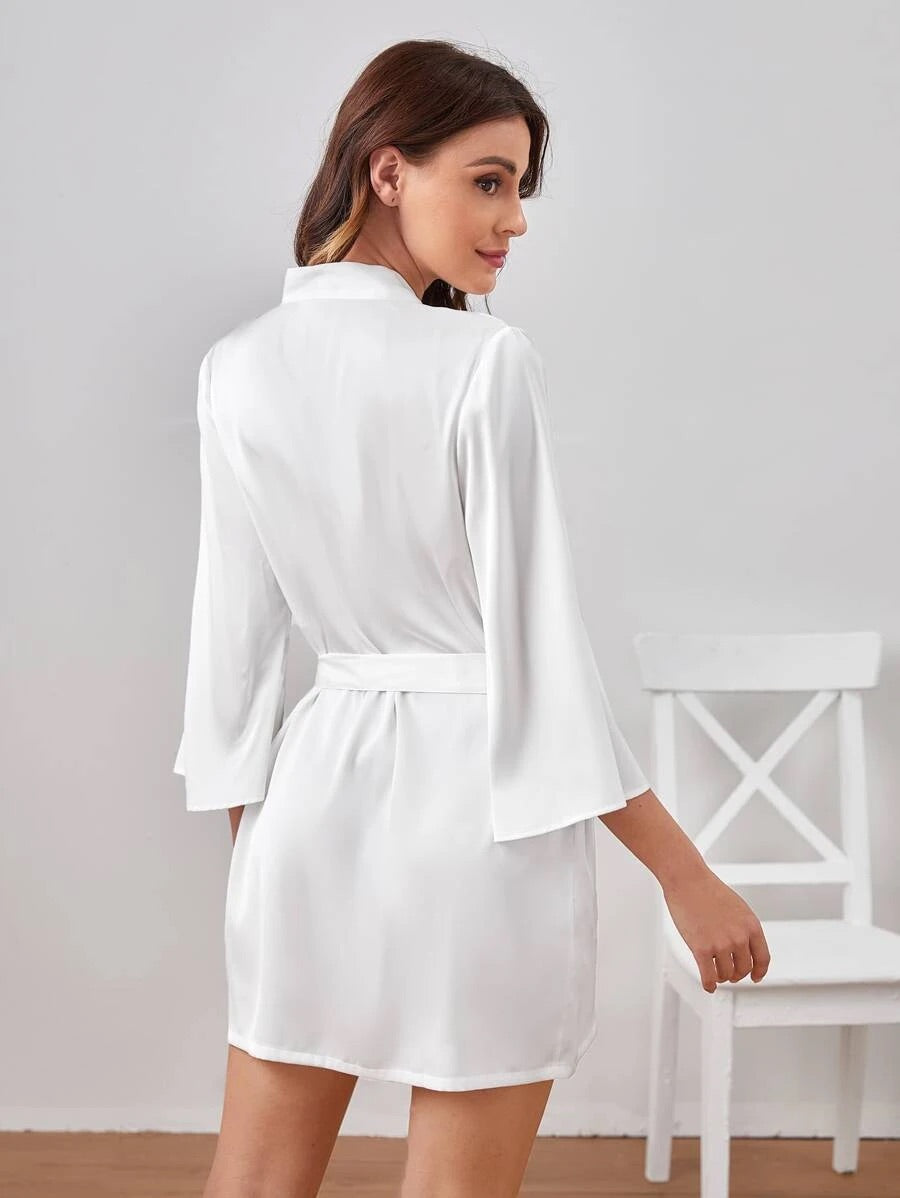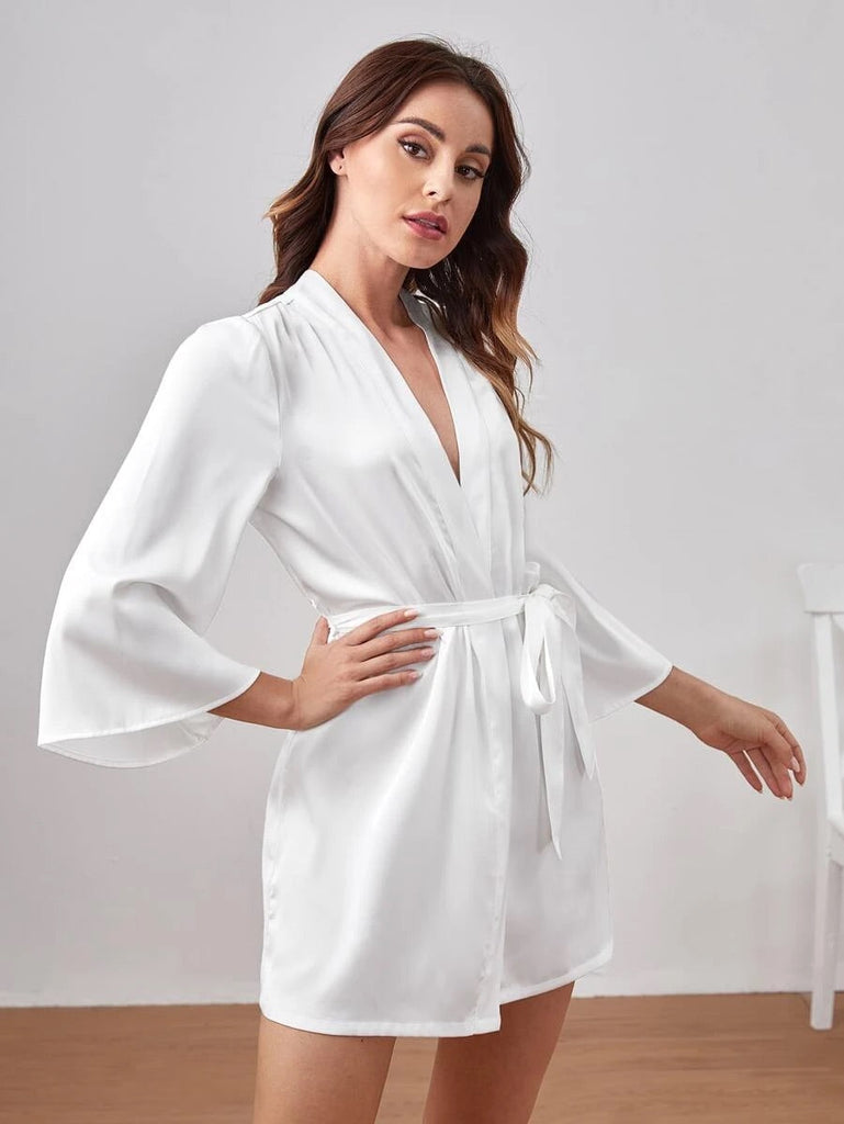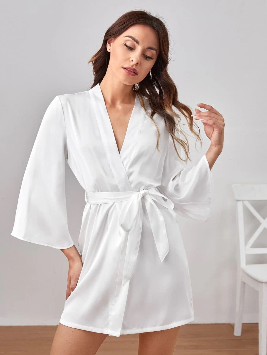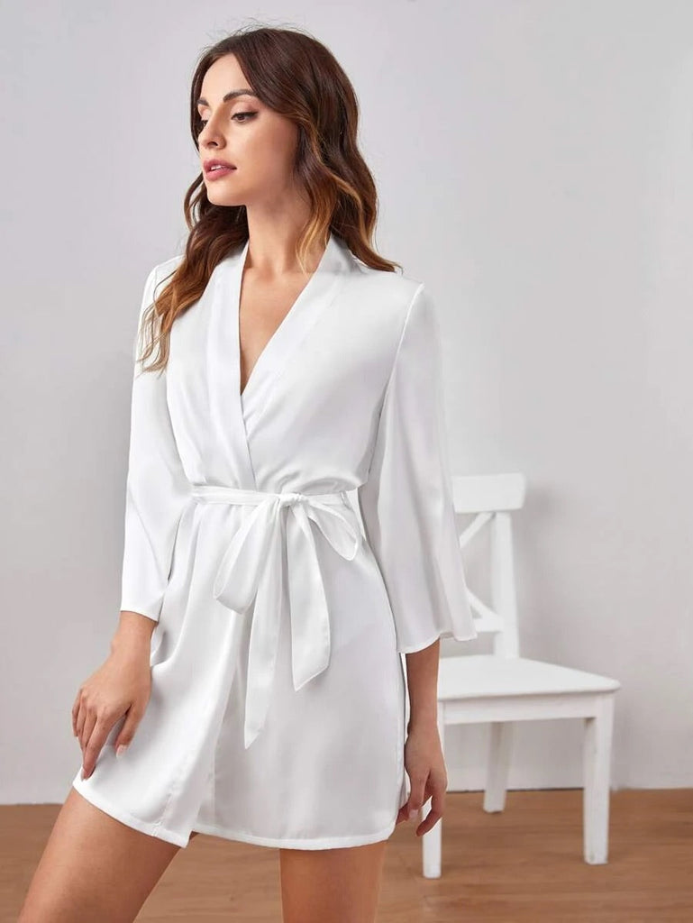 Color: Baby Pink Style: Simple Pattern Type: Plain Details: Belted Neckline: V neck Sleeve Length: Three Quarter Length Sleeve Fabric: Non-Stretch Material: Satin Composition: 95% Polyester, 5% Elastane Care Instructions: Machine wash or professional dry clean Belt: Yes Sheer: No