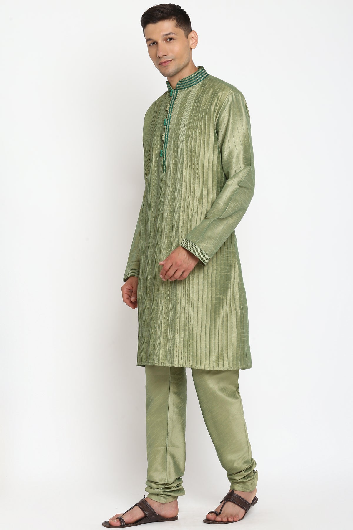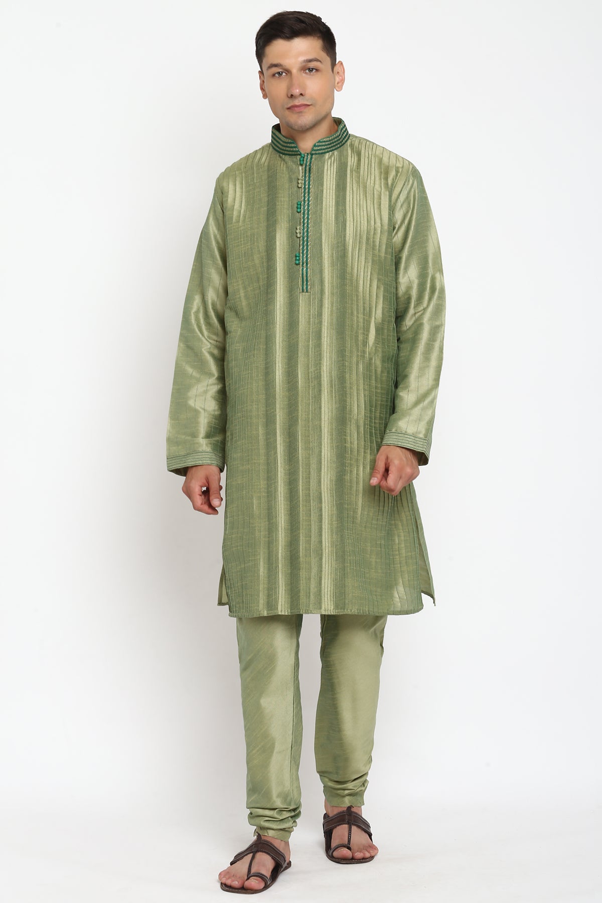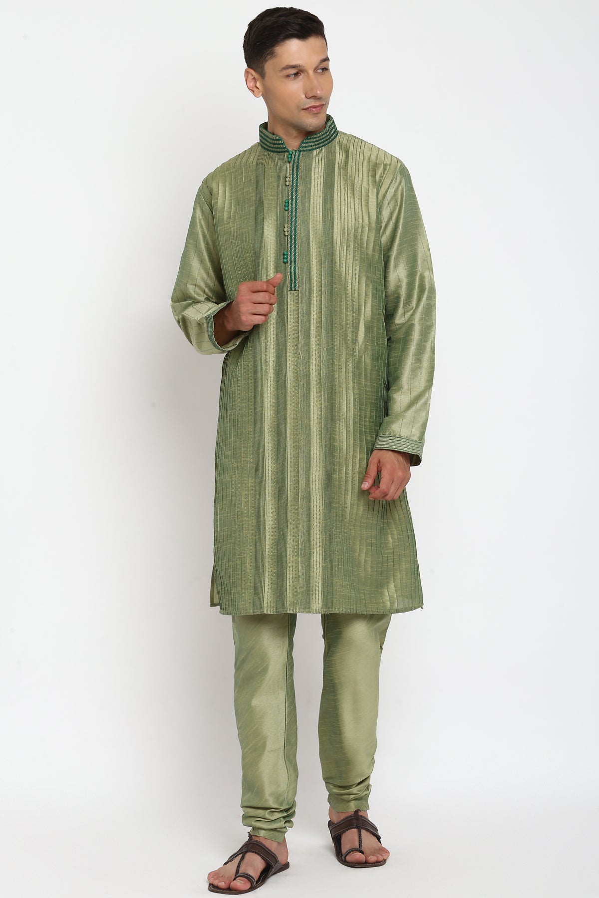 A class apart. This Matka Silk Kurta Set in a tangy green is a royal addition to your festive outfit collection this season, crafted for sheer comfort and style.