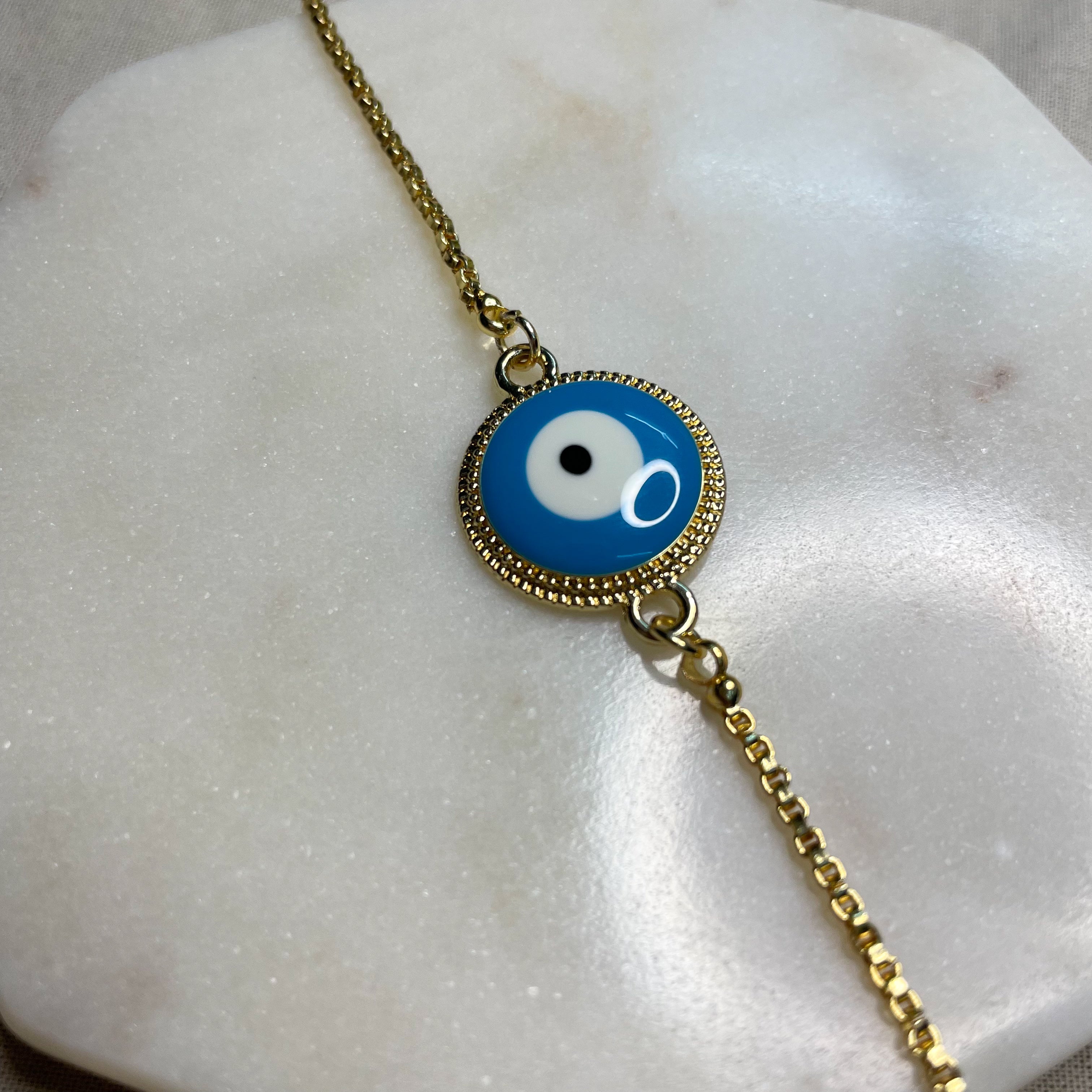 This evil eye bracelet is adjustable to fit your wrist, and features a unique charm design that will bring good luck. This bracelet is a great piece to have in your jewelry collection.