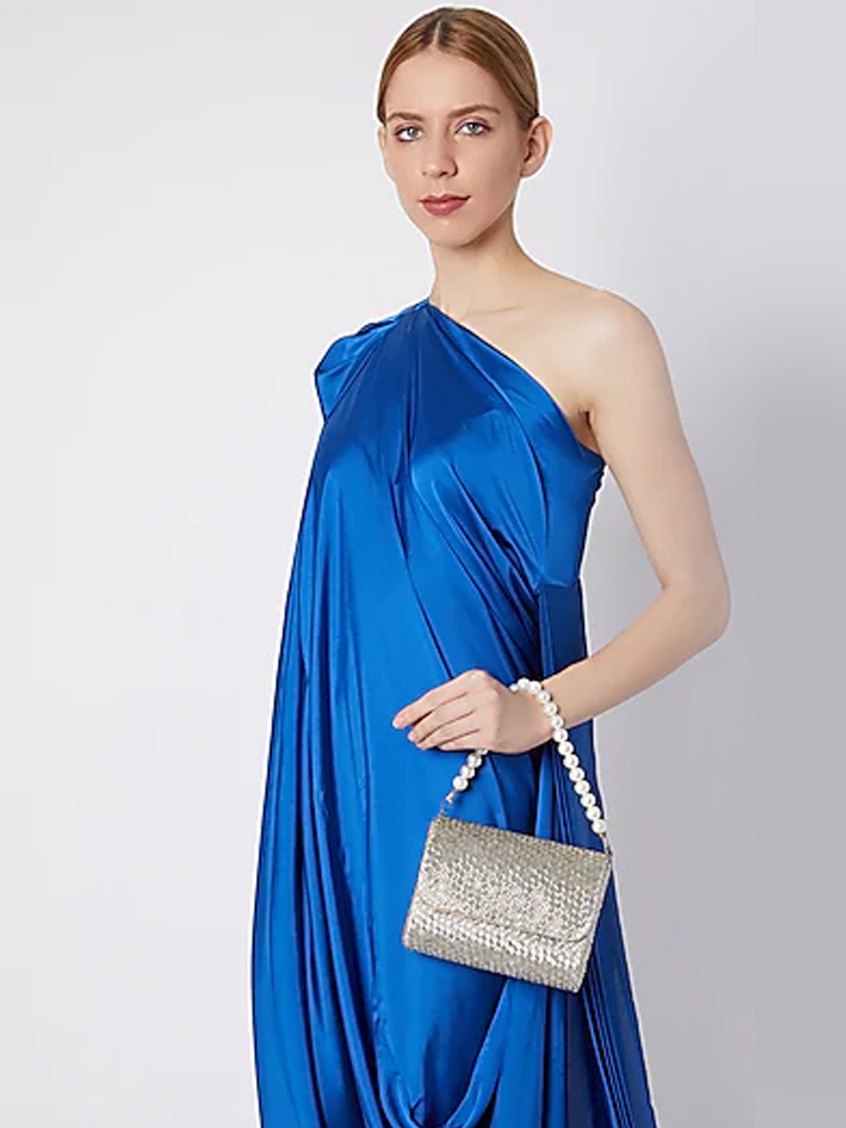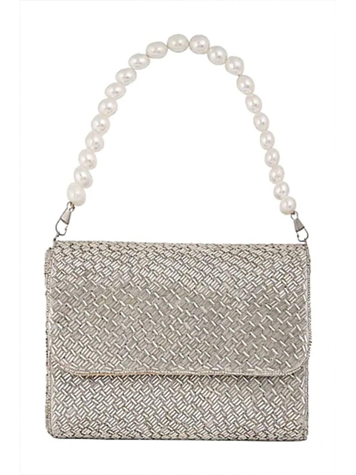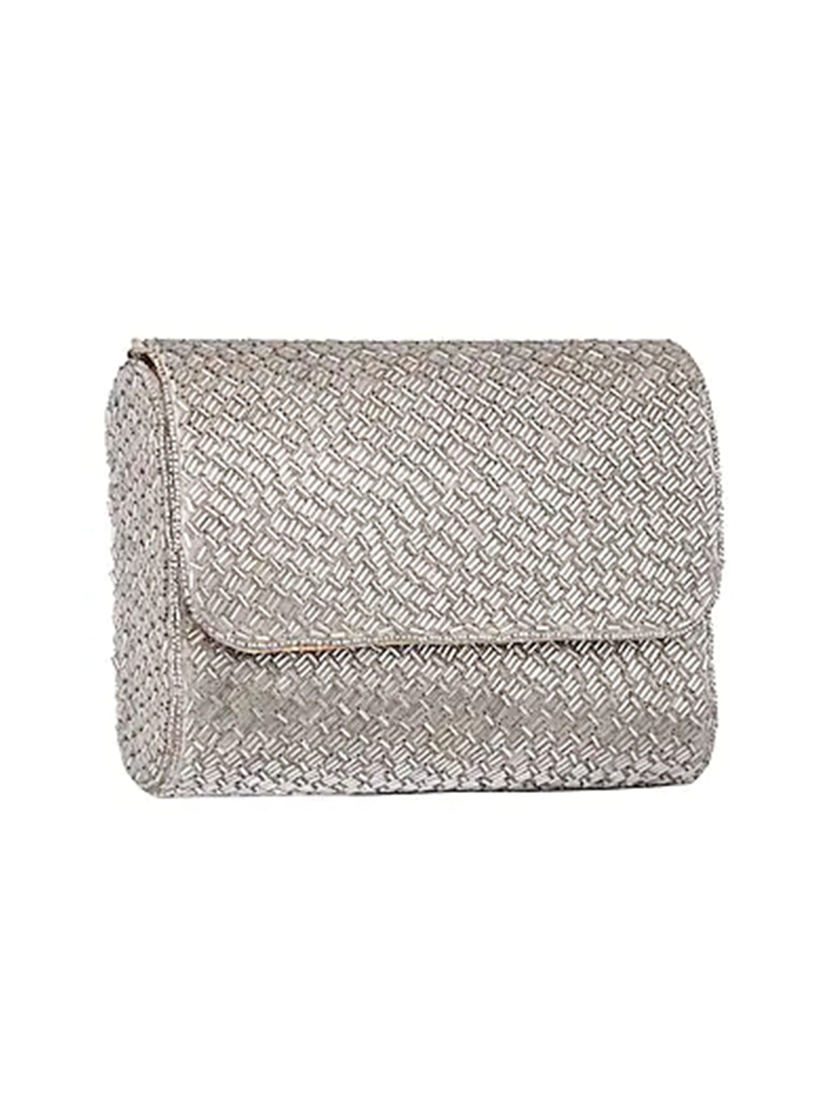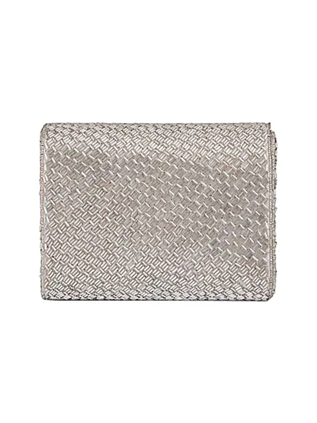 Flap over clutch Hand embroidered with Silver Bugle Beads in a weave pattern on all sides.