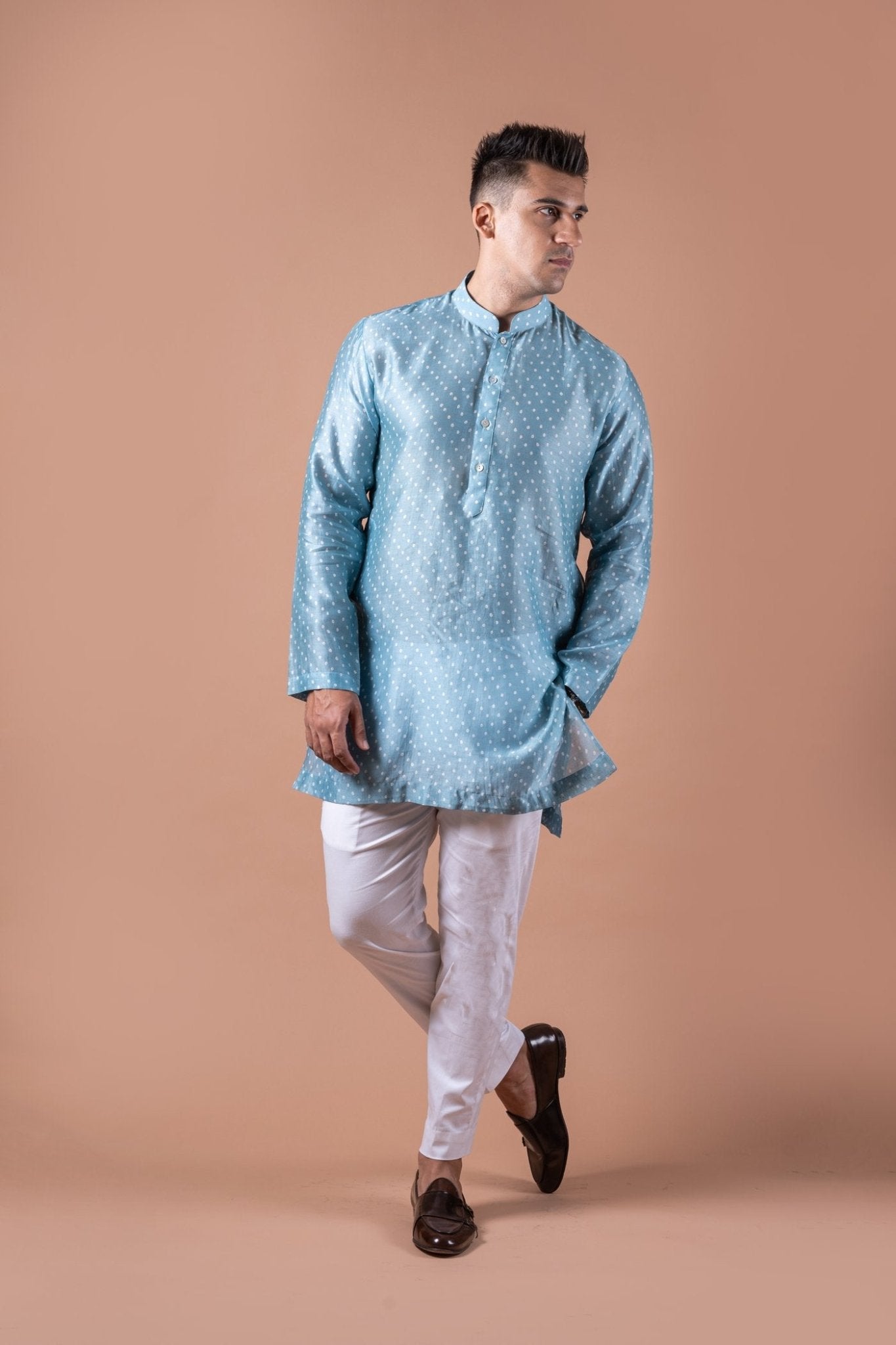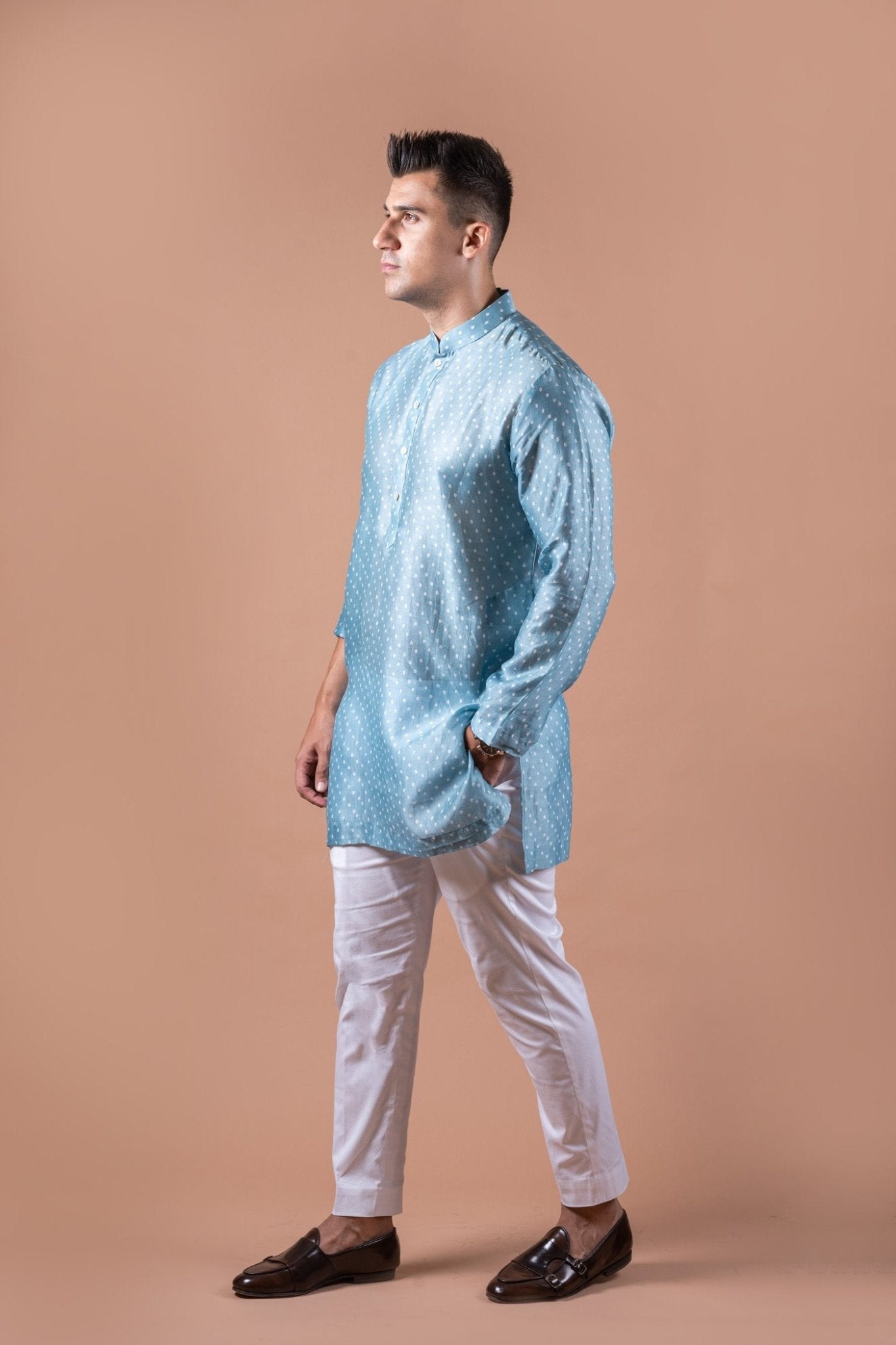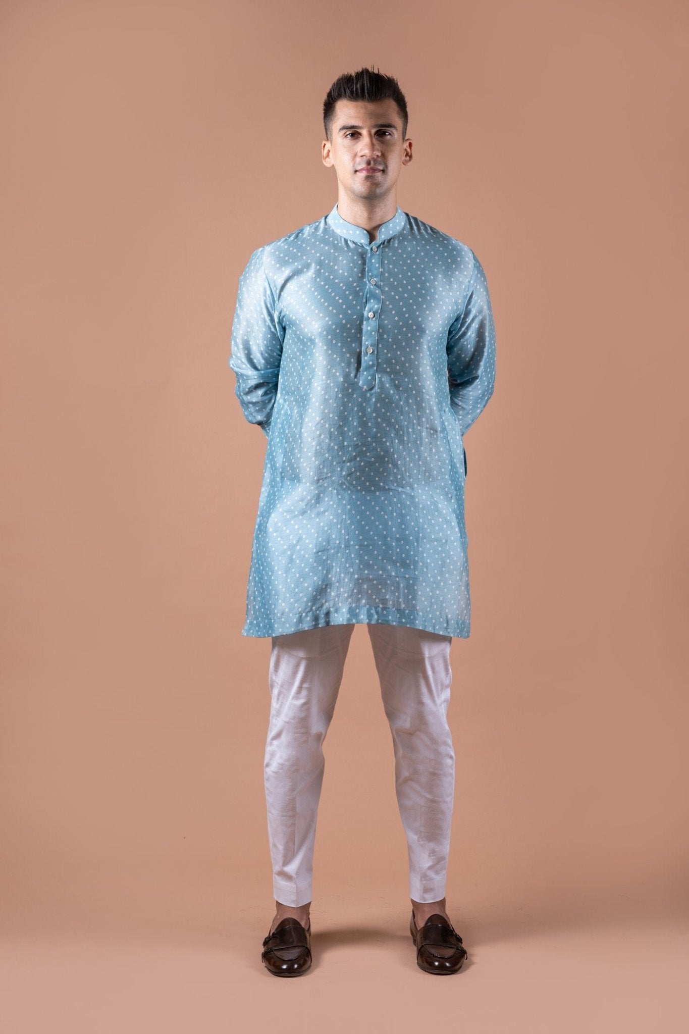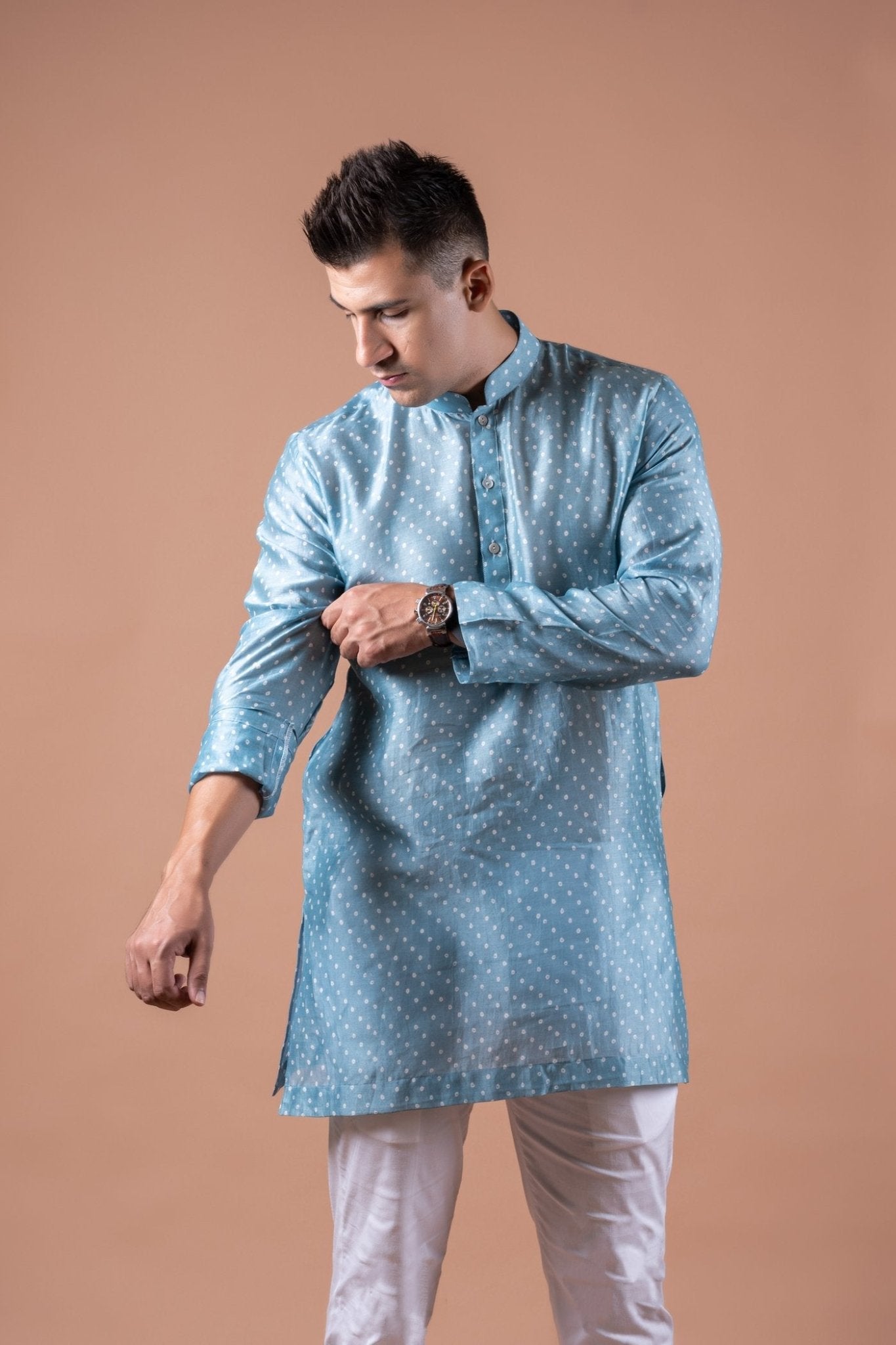 Classic kurta with white bandhani pattern enhances the shine of the kurta. A perfect blend of simplicity and style.
