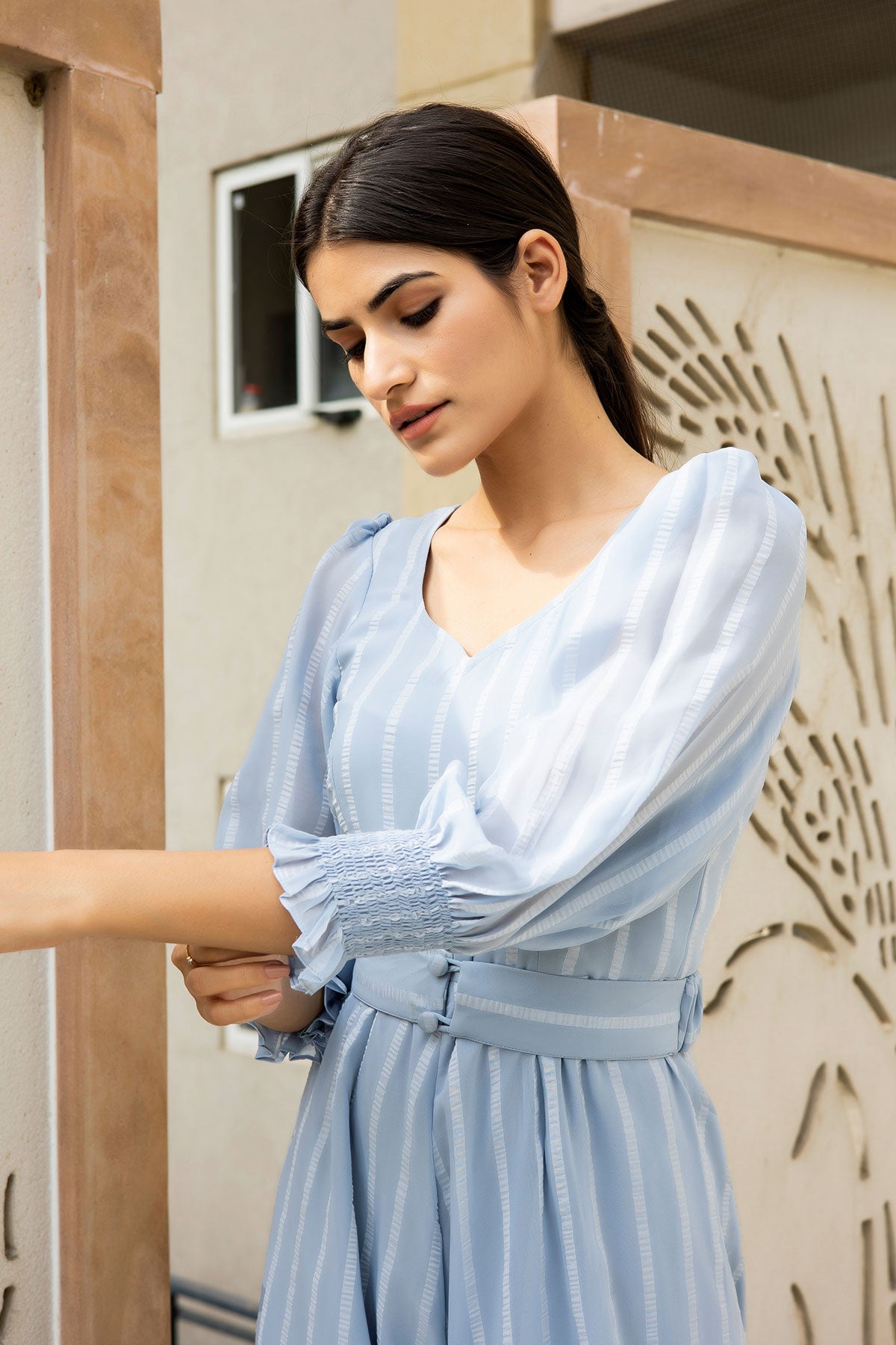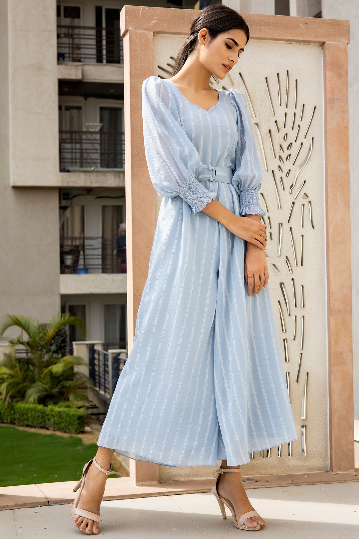 Twill fabric with sky blue color is the real comfort with it's soft touch-feel. Here it's a super trendy jumpsuit with bishop bobbin-elastic sleeve, leaf-shaped neckline and a waist belt for styling. Grab this outfit & style your way for shopping, outing or vacation.
