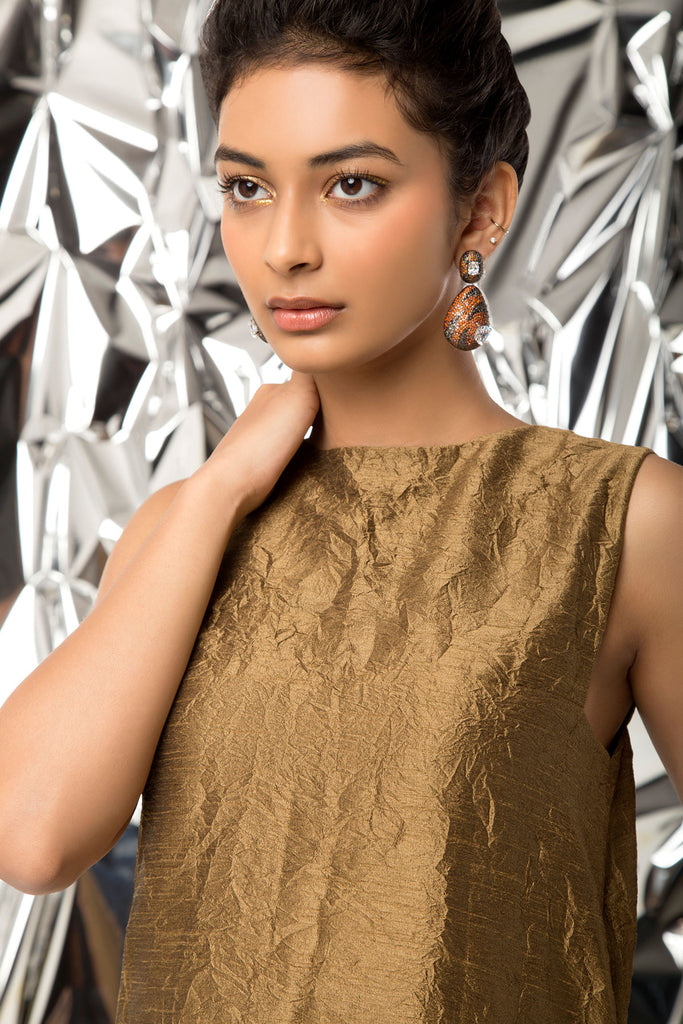 Crumpled fabric. Back button. Sleeveless. Shift dress