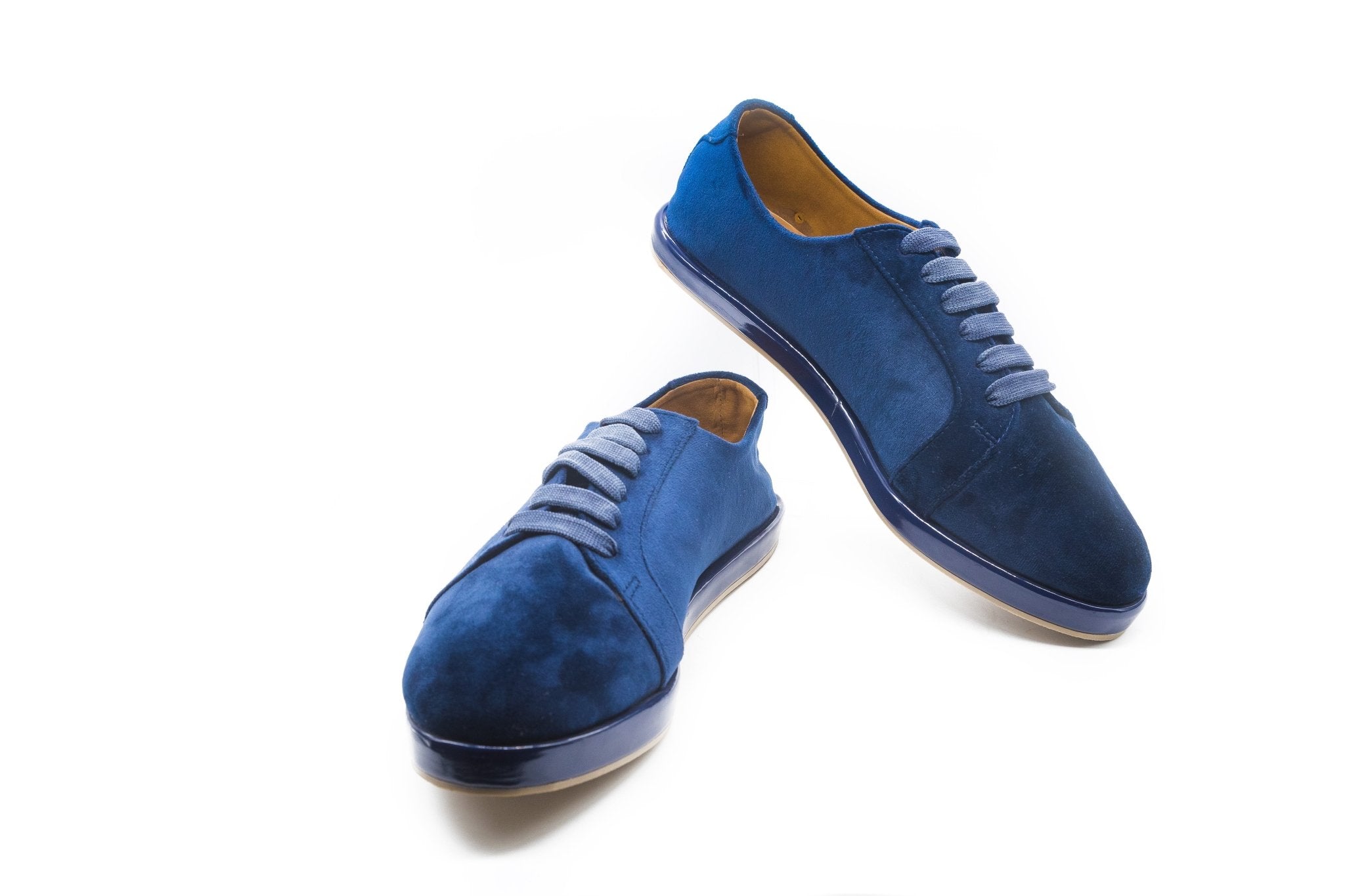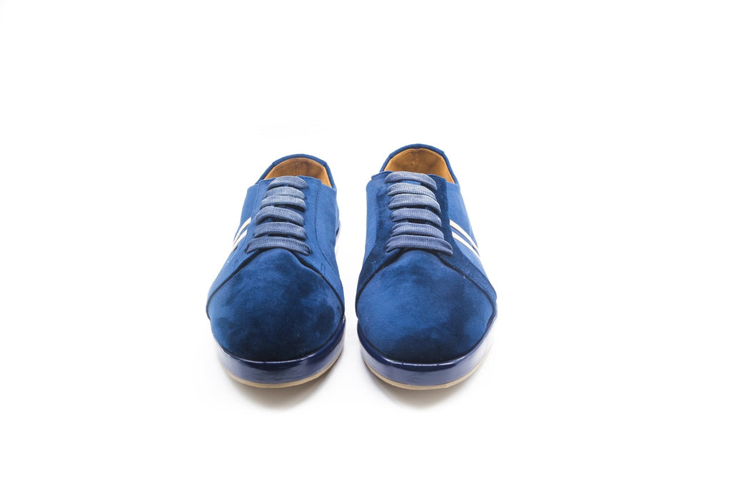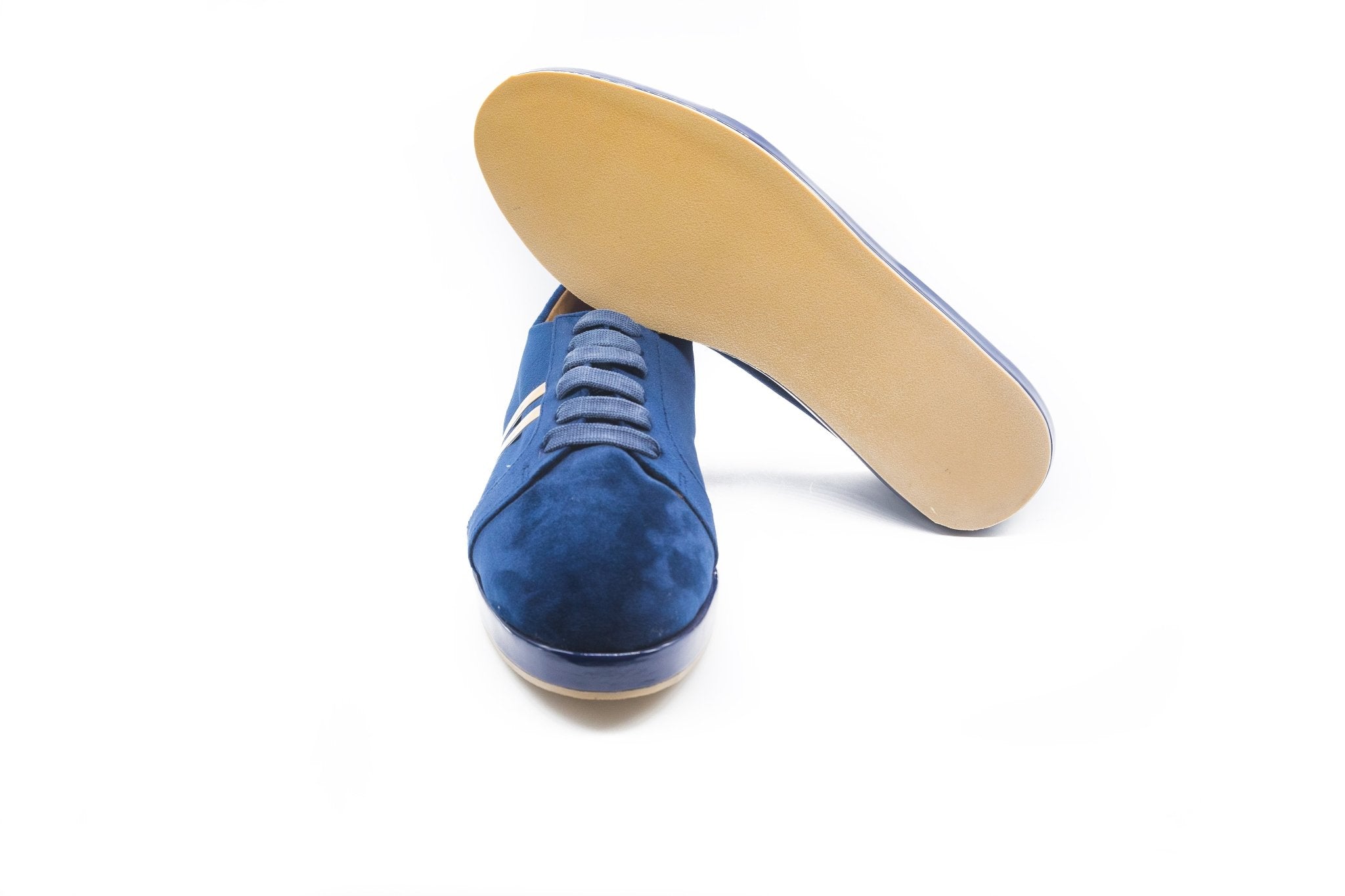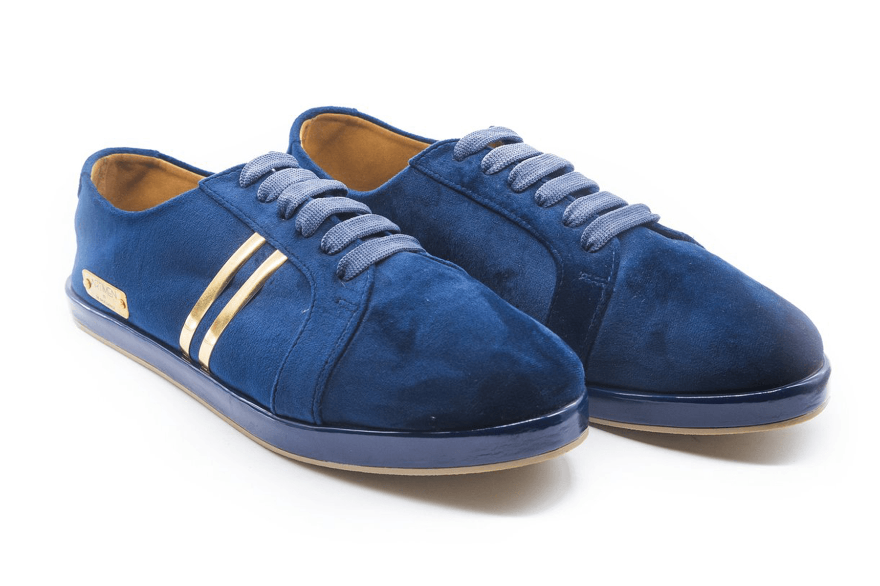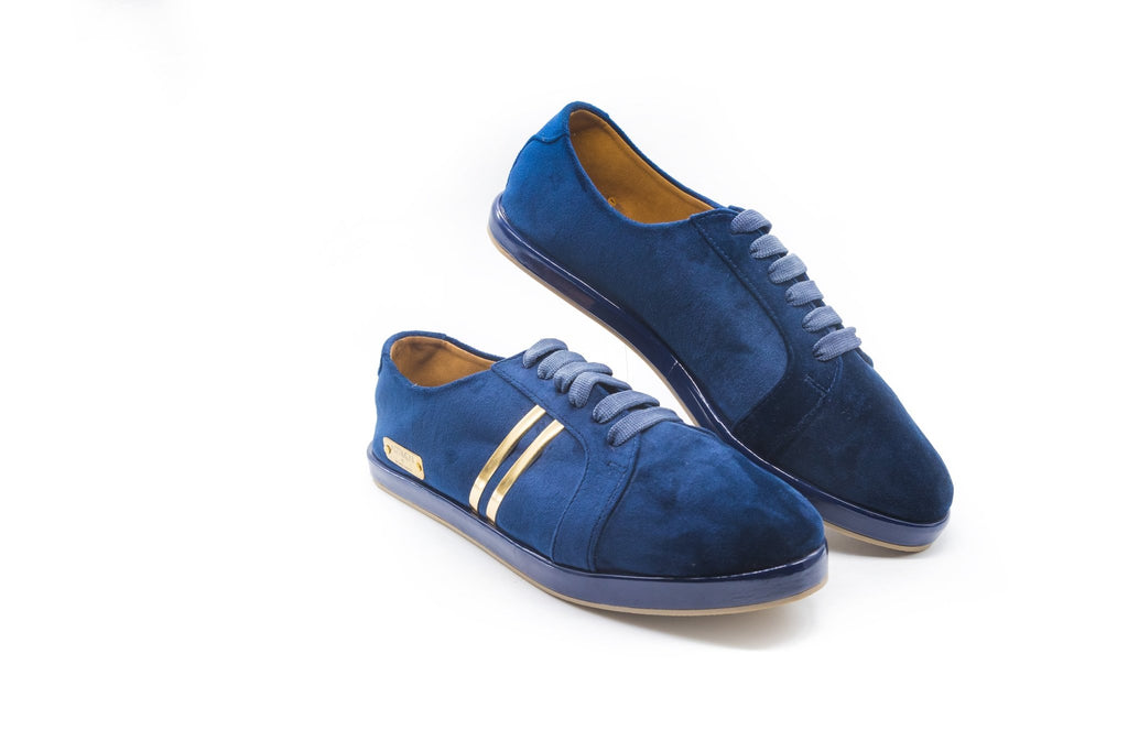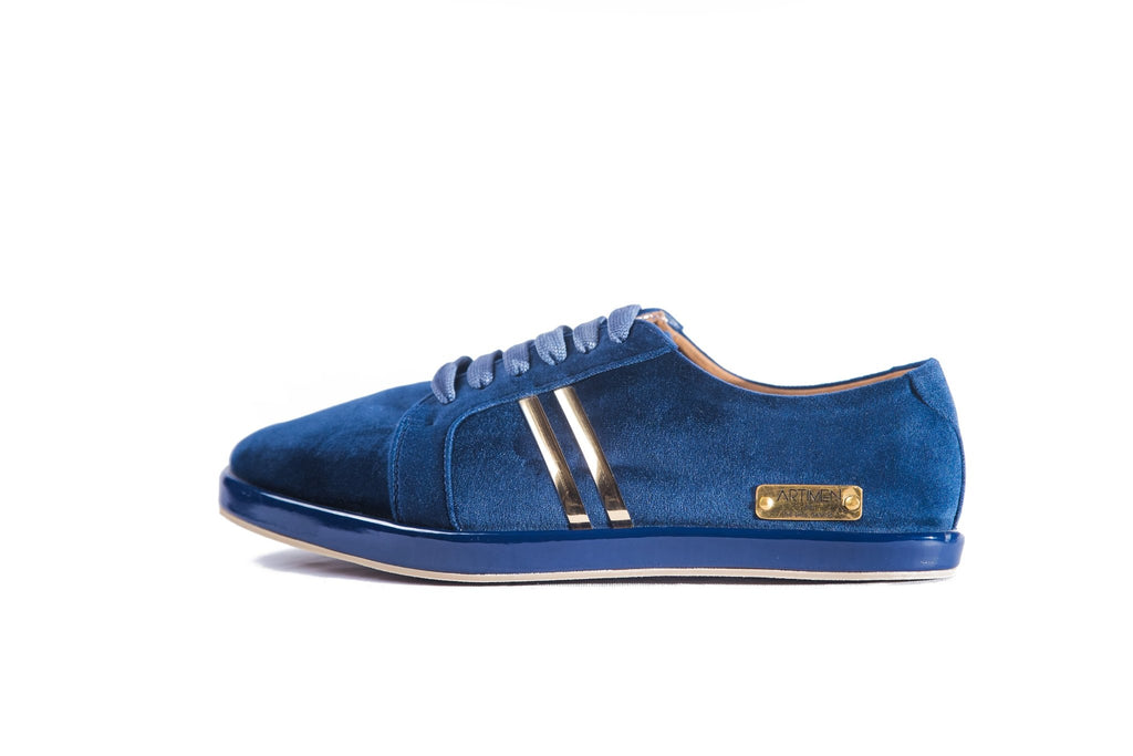 One of our signature designs with two golden strips and Artimen name plate on the sides. Blue velvet sneakers with extra cushioning inside and soft sole make it very comfortable to wear.