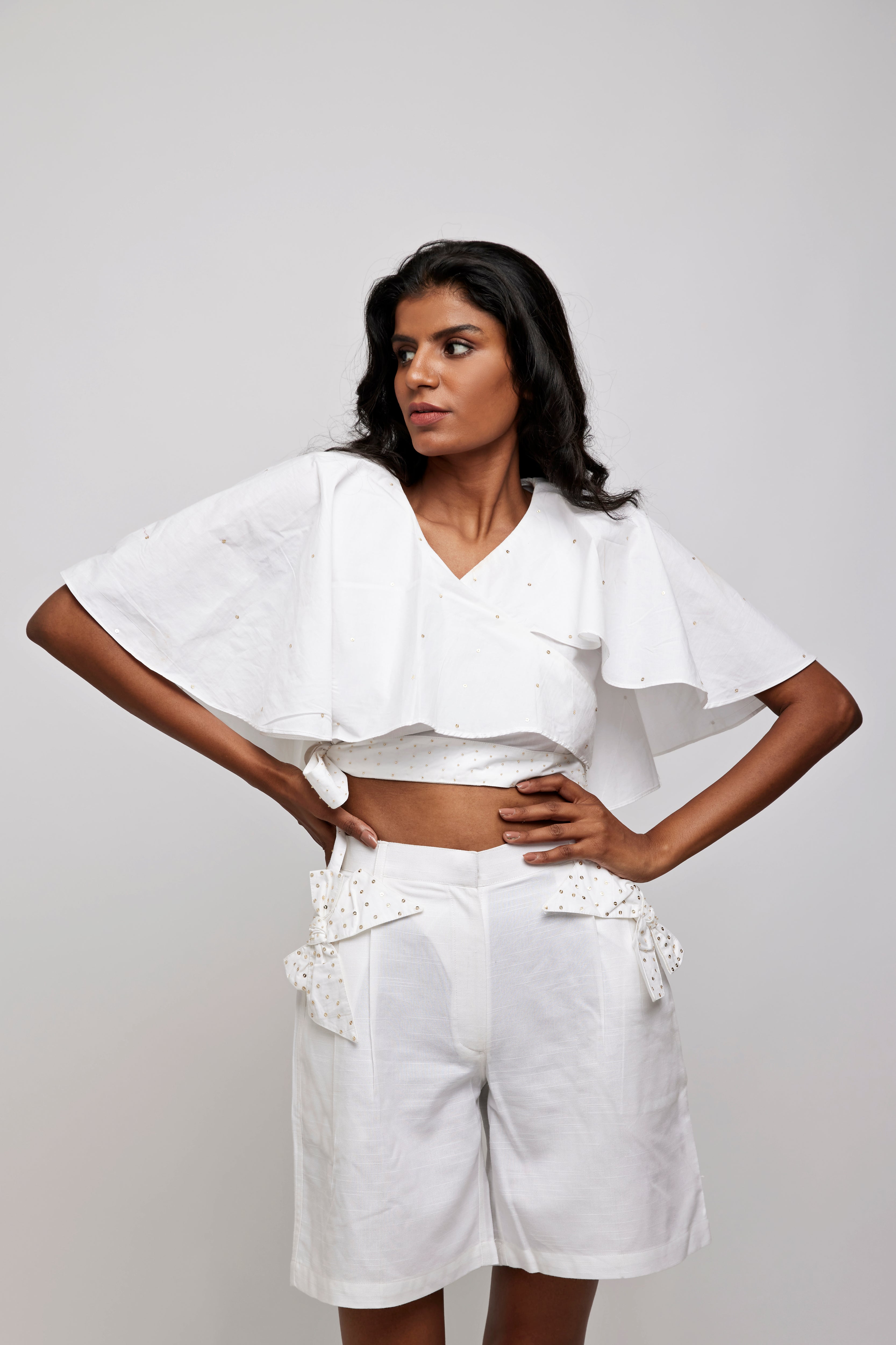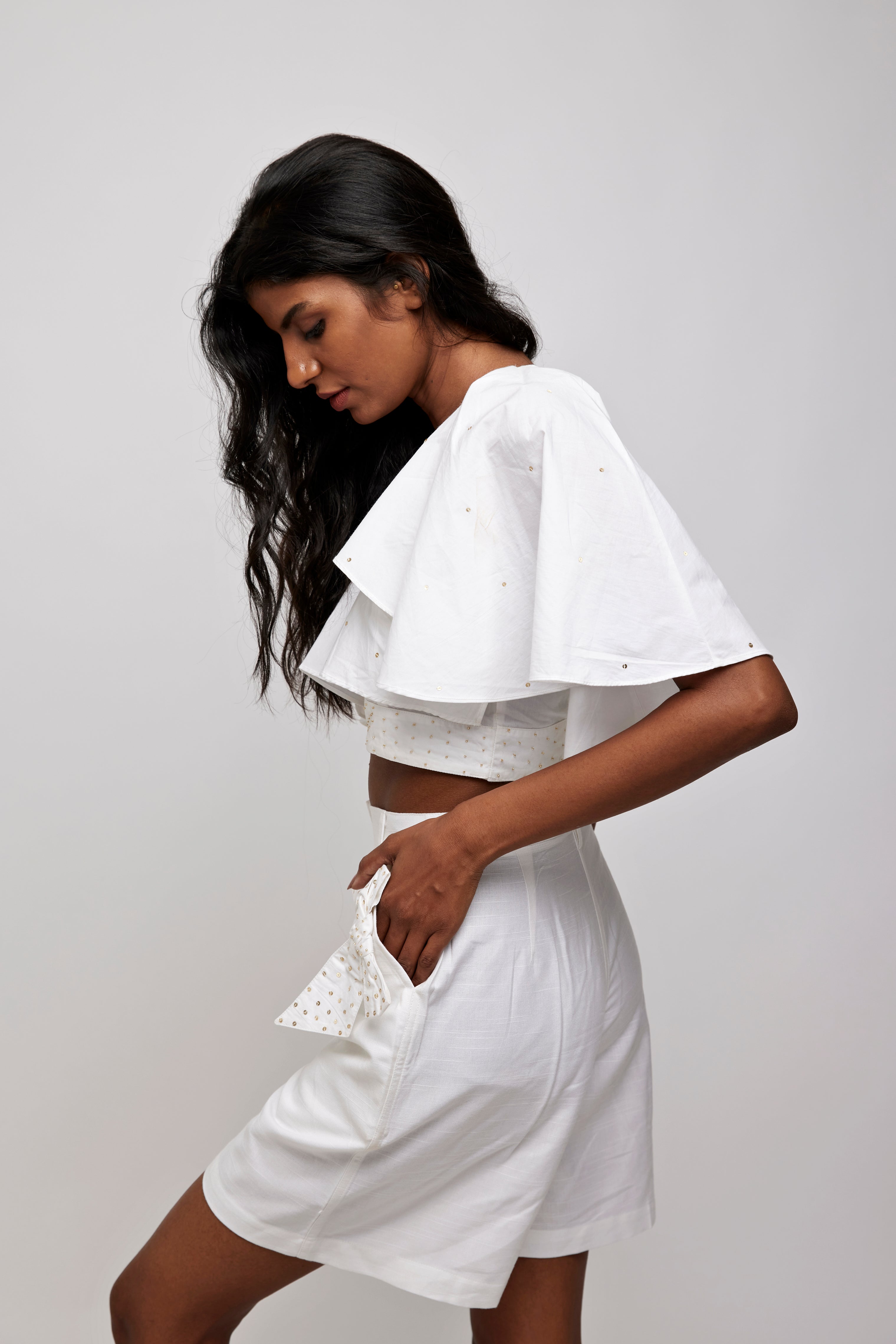 Crop cape top with sequins embellishments. Bermuda with patch pocket with bow details and golden beads embellished.