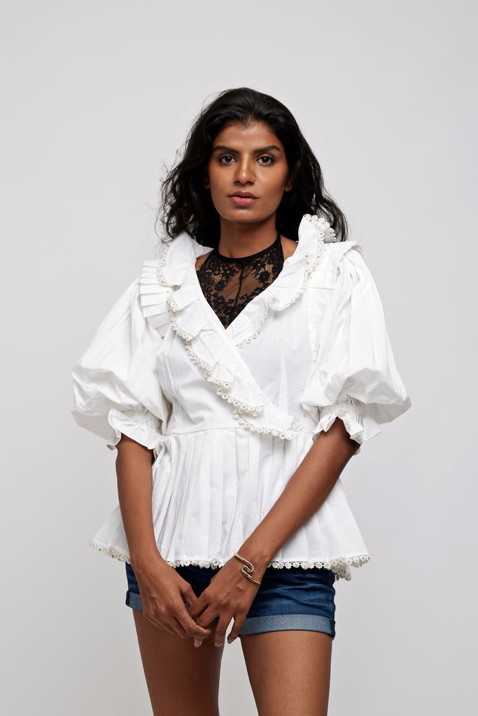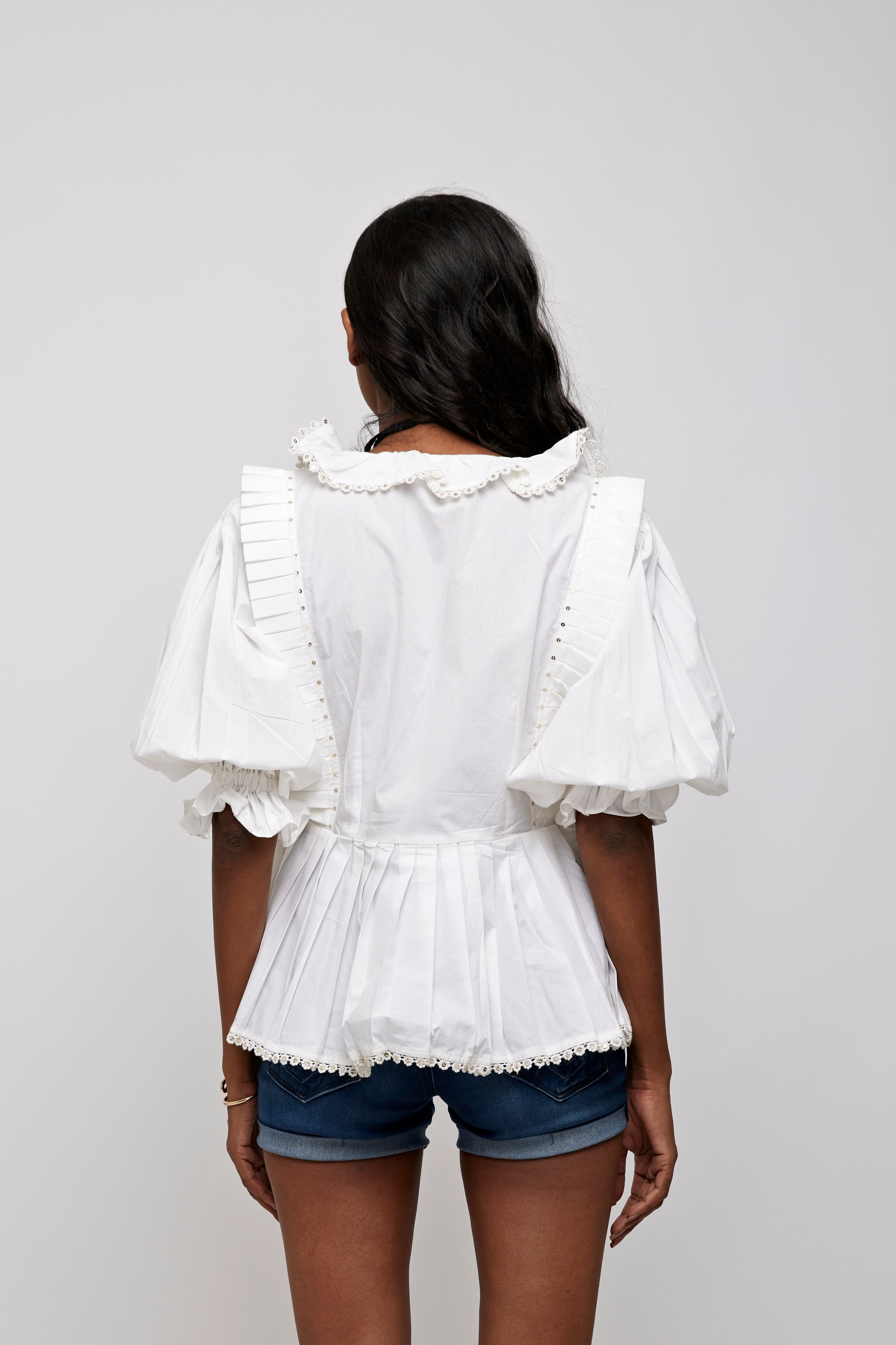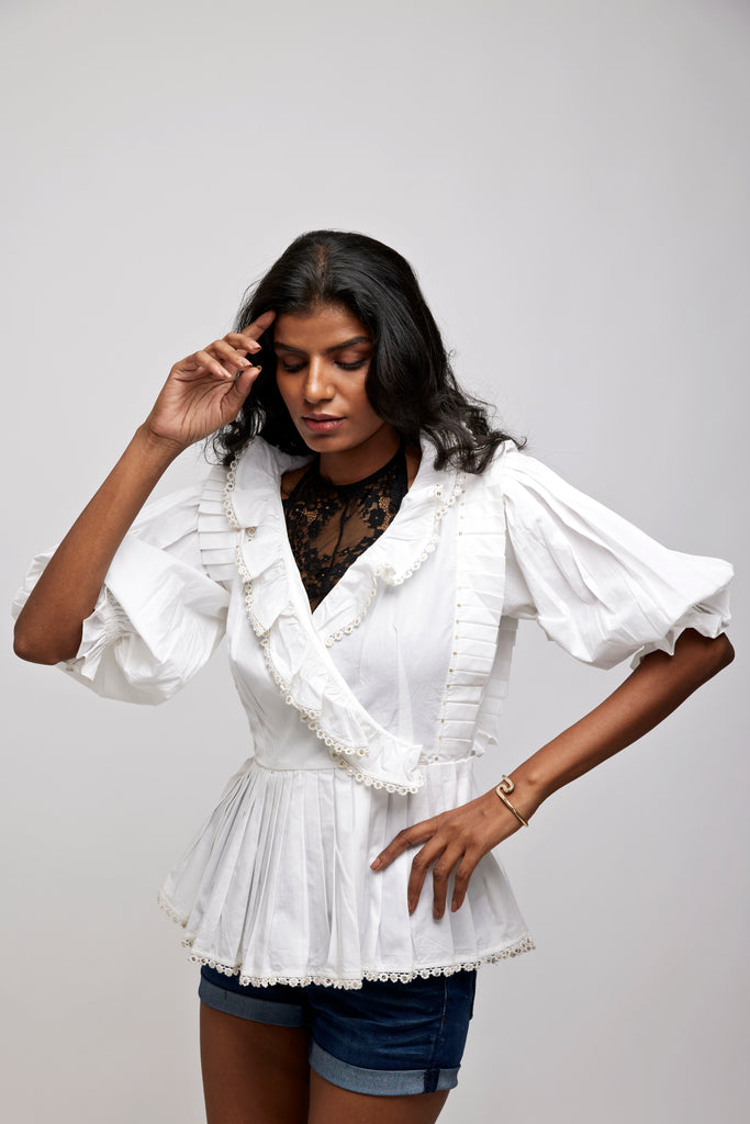 Knife pleated, shawl lapel short top with floral lace on the edges all around.Knife pleated at the front and back princess sty-line. The knife pleated hem with a floral lace embellished with sequins.