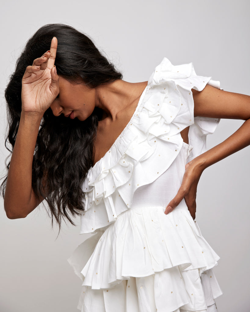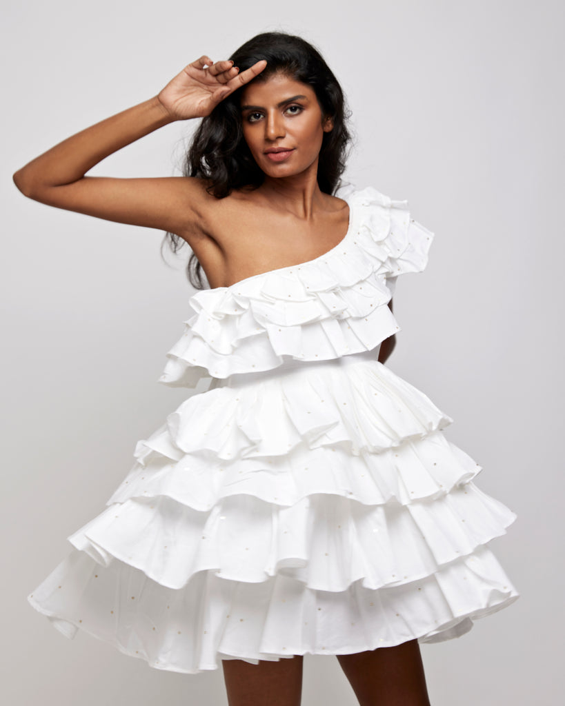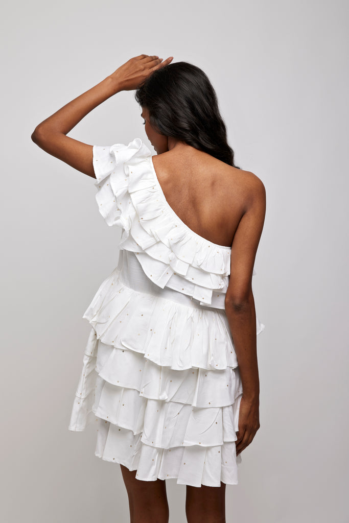 One shoulder fitted flair dress. OverLap tier full circular dress with sequins embellishments.