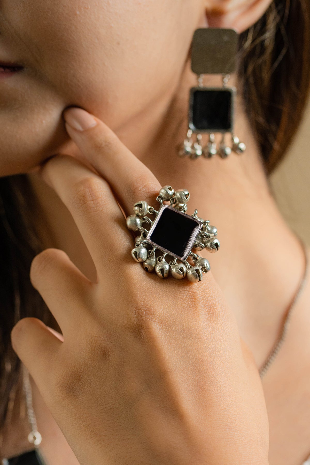 This statement ring is handcrafted to perfection using fine quality brass, ghungroos and black enamel with light silver plating on it. Traditional look with modern simplicity is what this ring has to offer.
