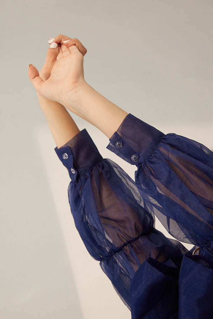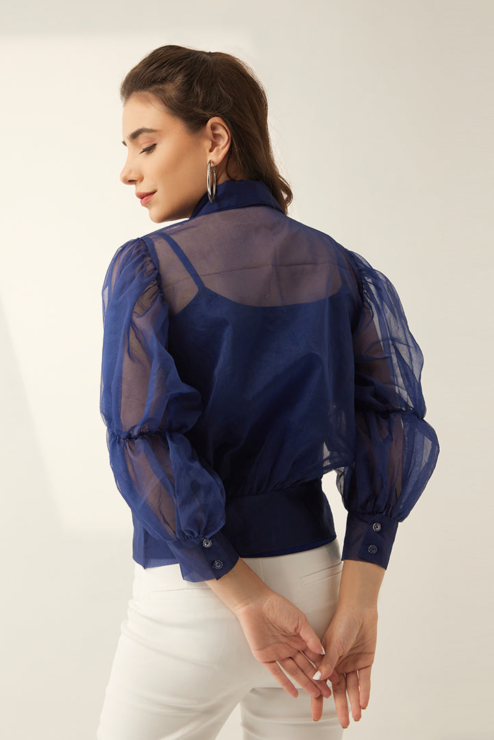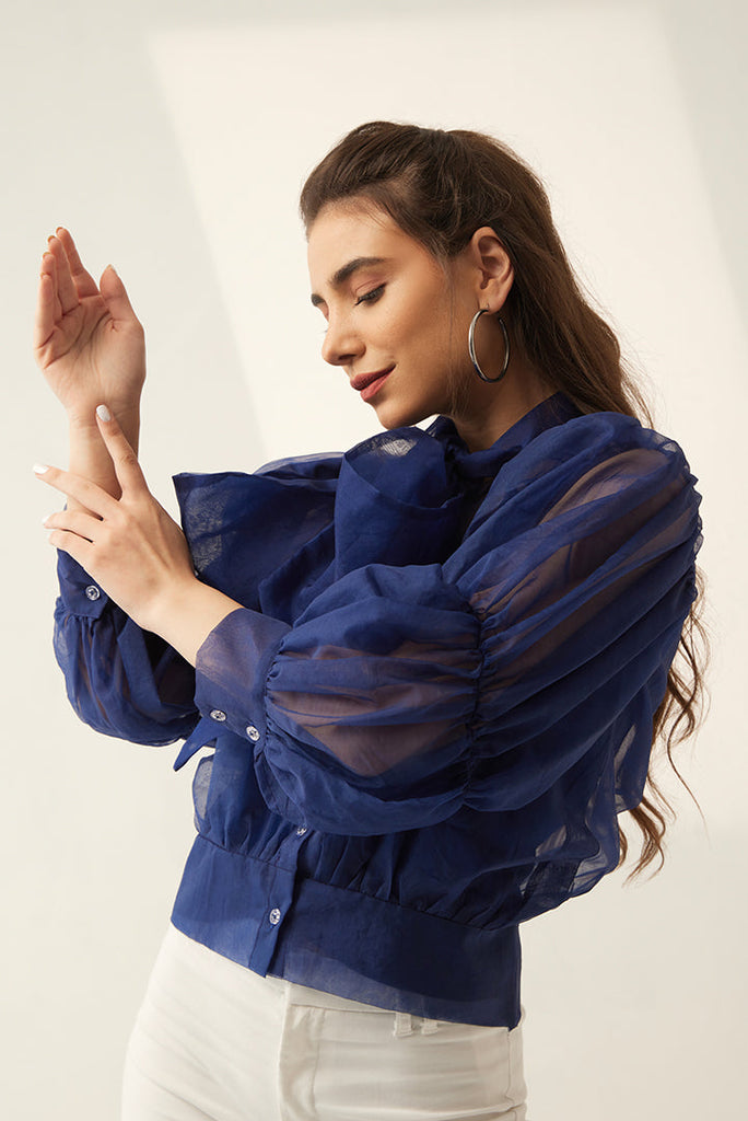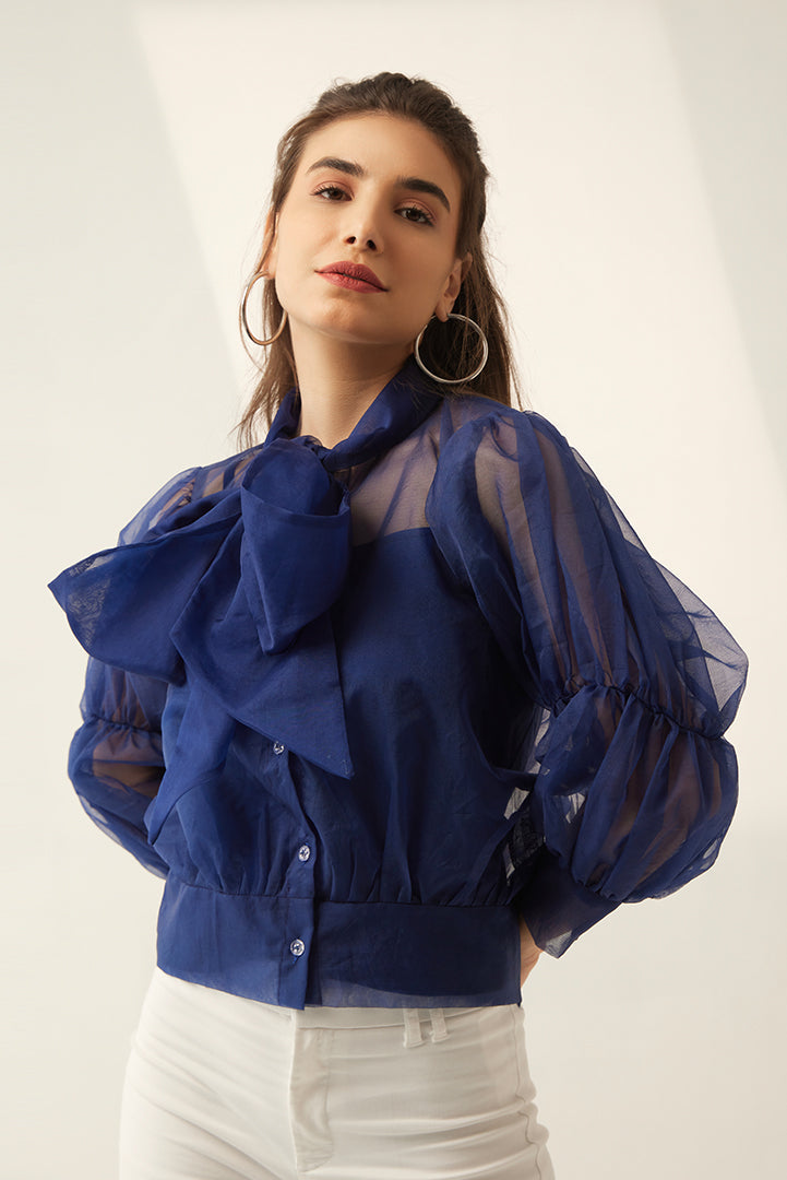 Organza sheer top with bow tie collar and the front opening is perfect to style from day to night. It has a front opening with cuff detail on the sleeves. The peasant sleeves with a twist add volume making it a classic top. The top comes with a strappy slip. Available in plus size also.