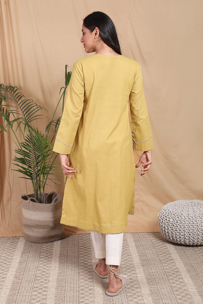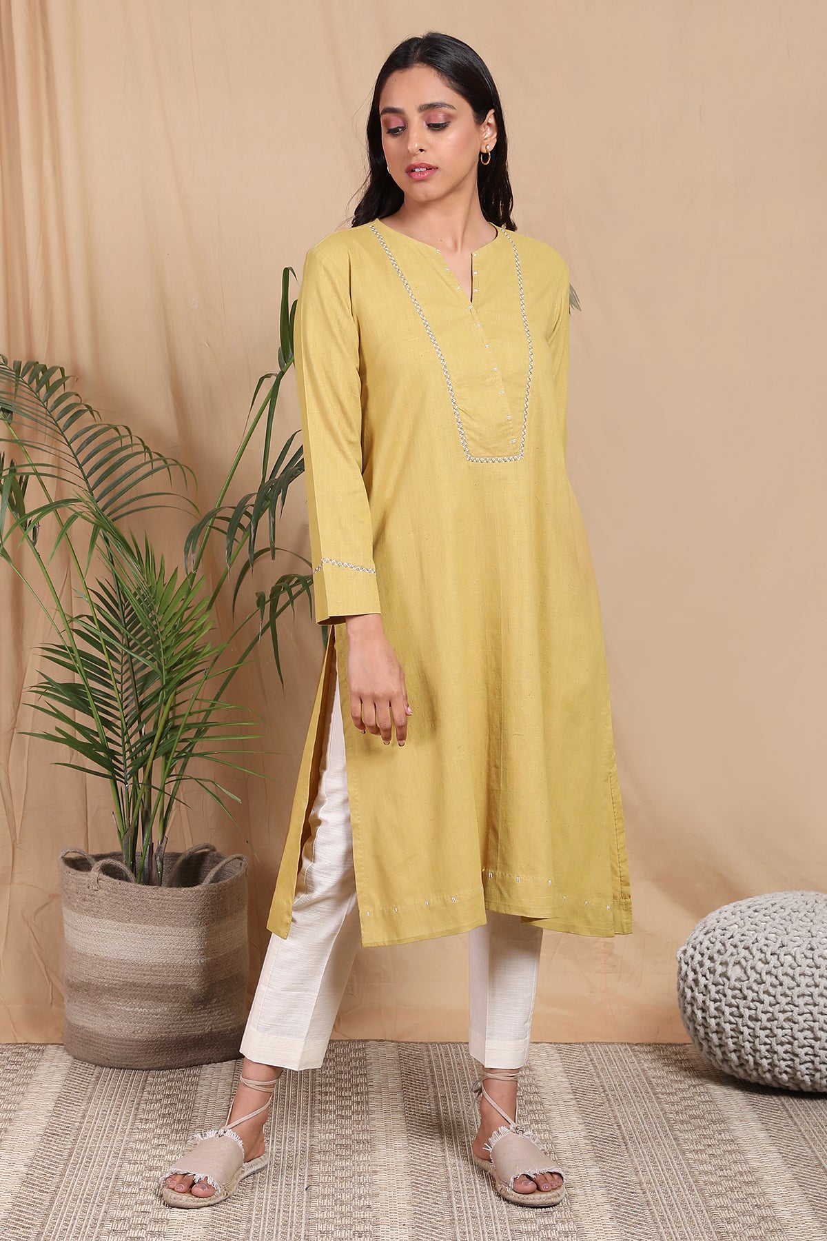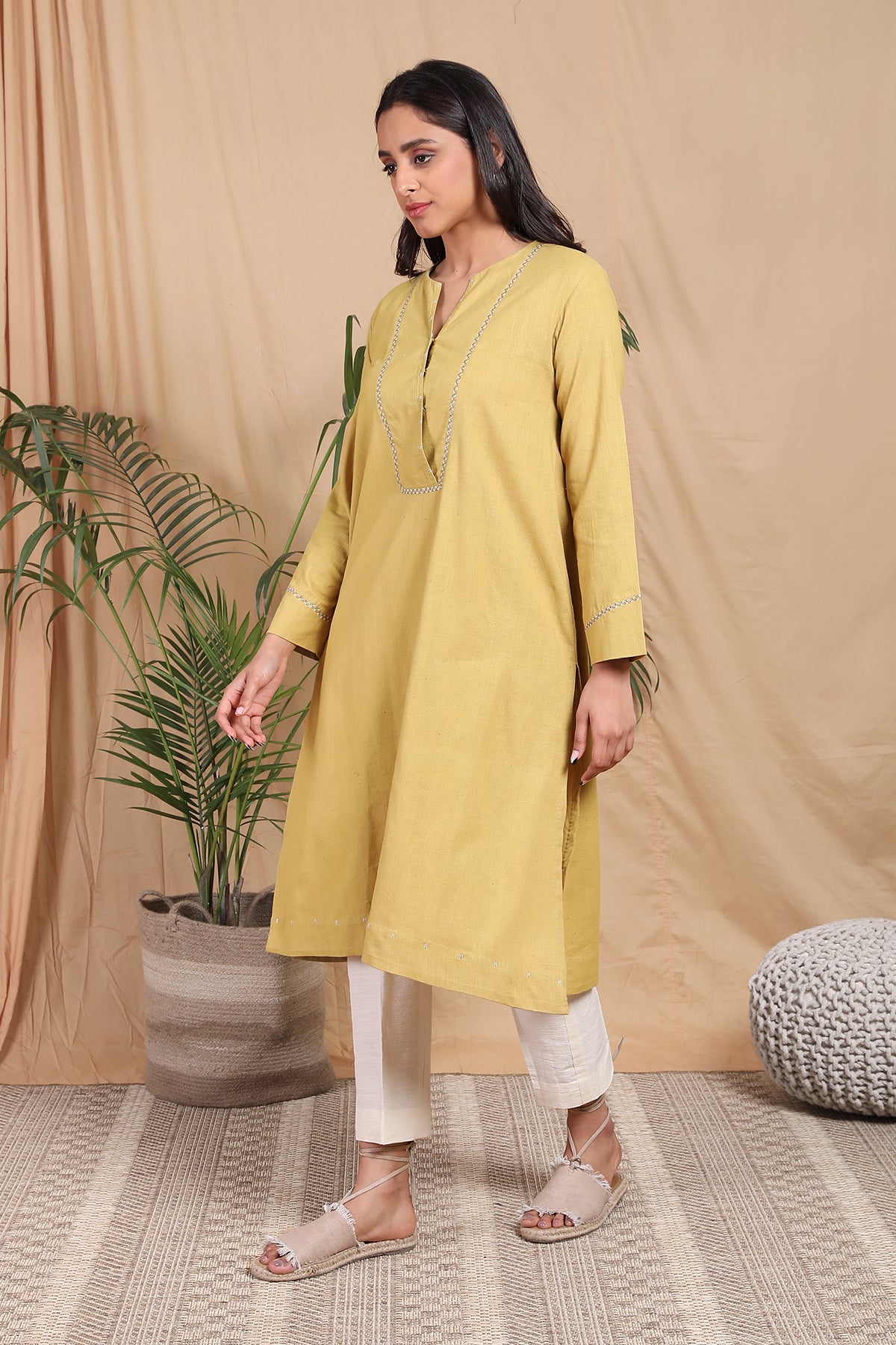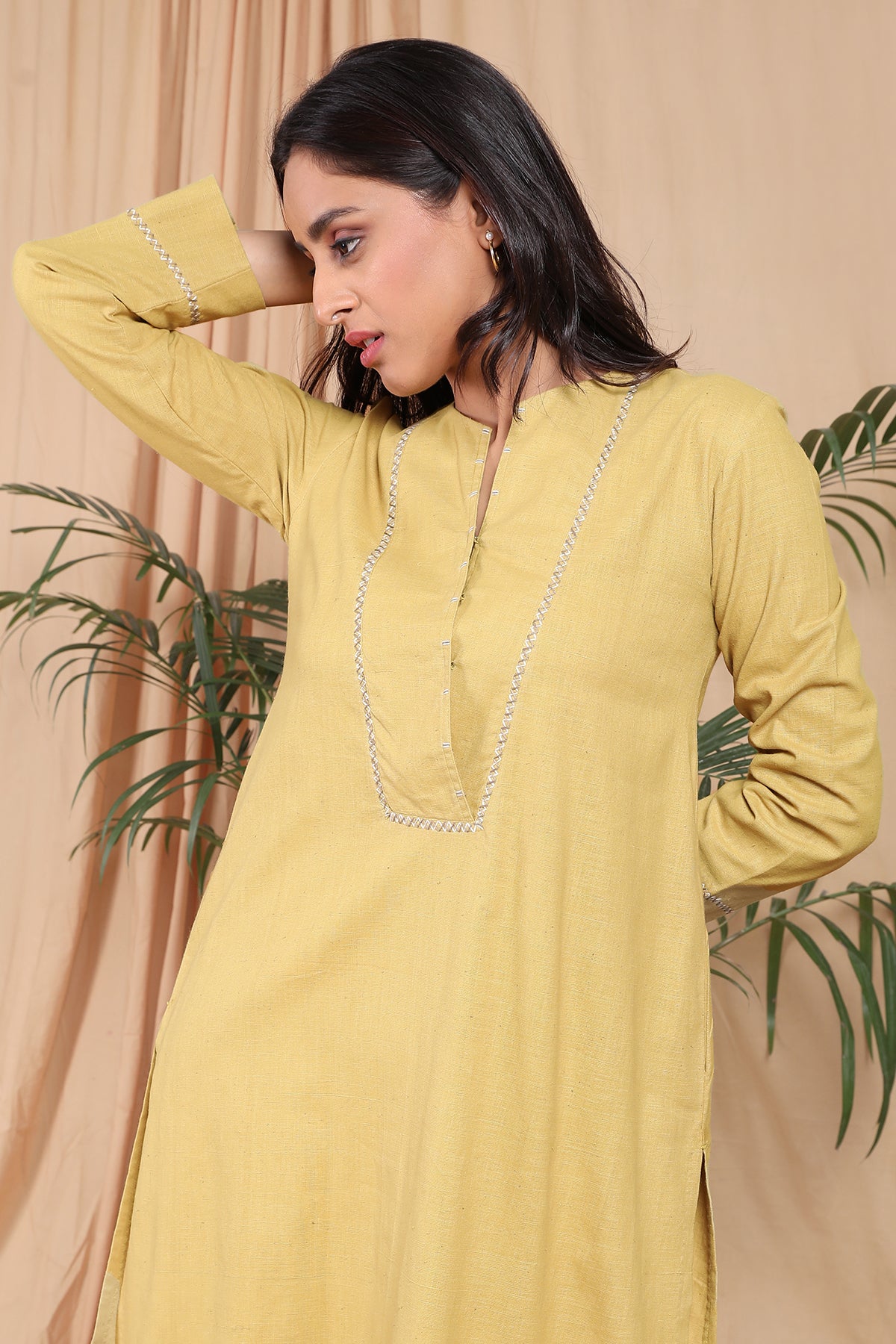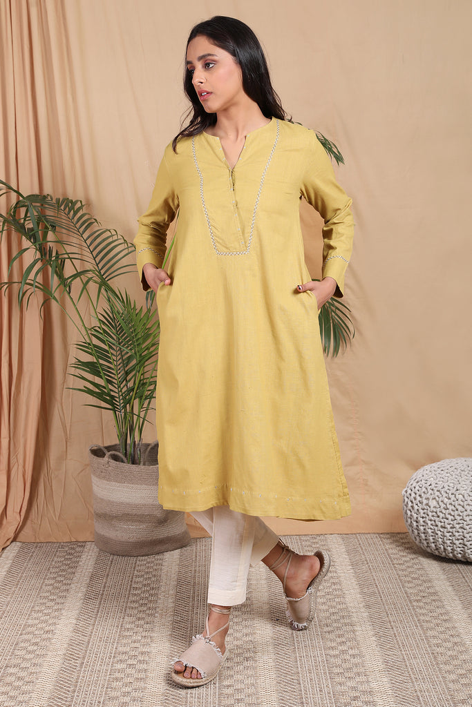 Showcasing a classic shade of mustard, our Sukh Kurta is the epitome of elegance. This handwoven Cotton Kurta is accented with gorgeous hand-embroidery work on the neckline panel and cuffs. Also features a slightly A-line silhouette. It also has pockets!
