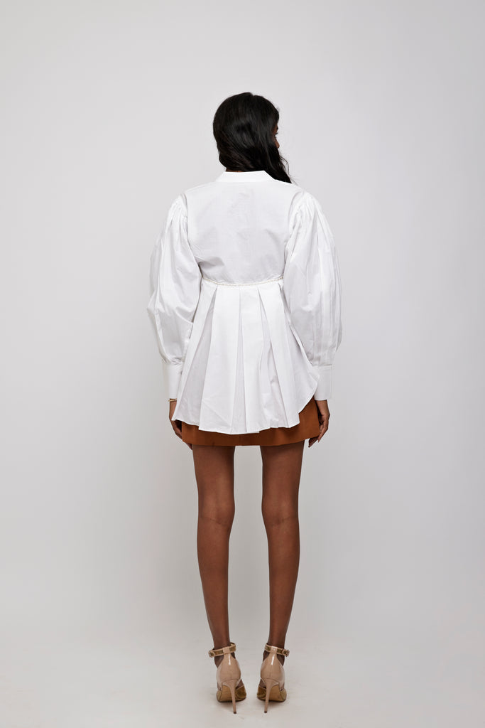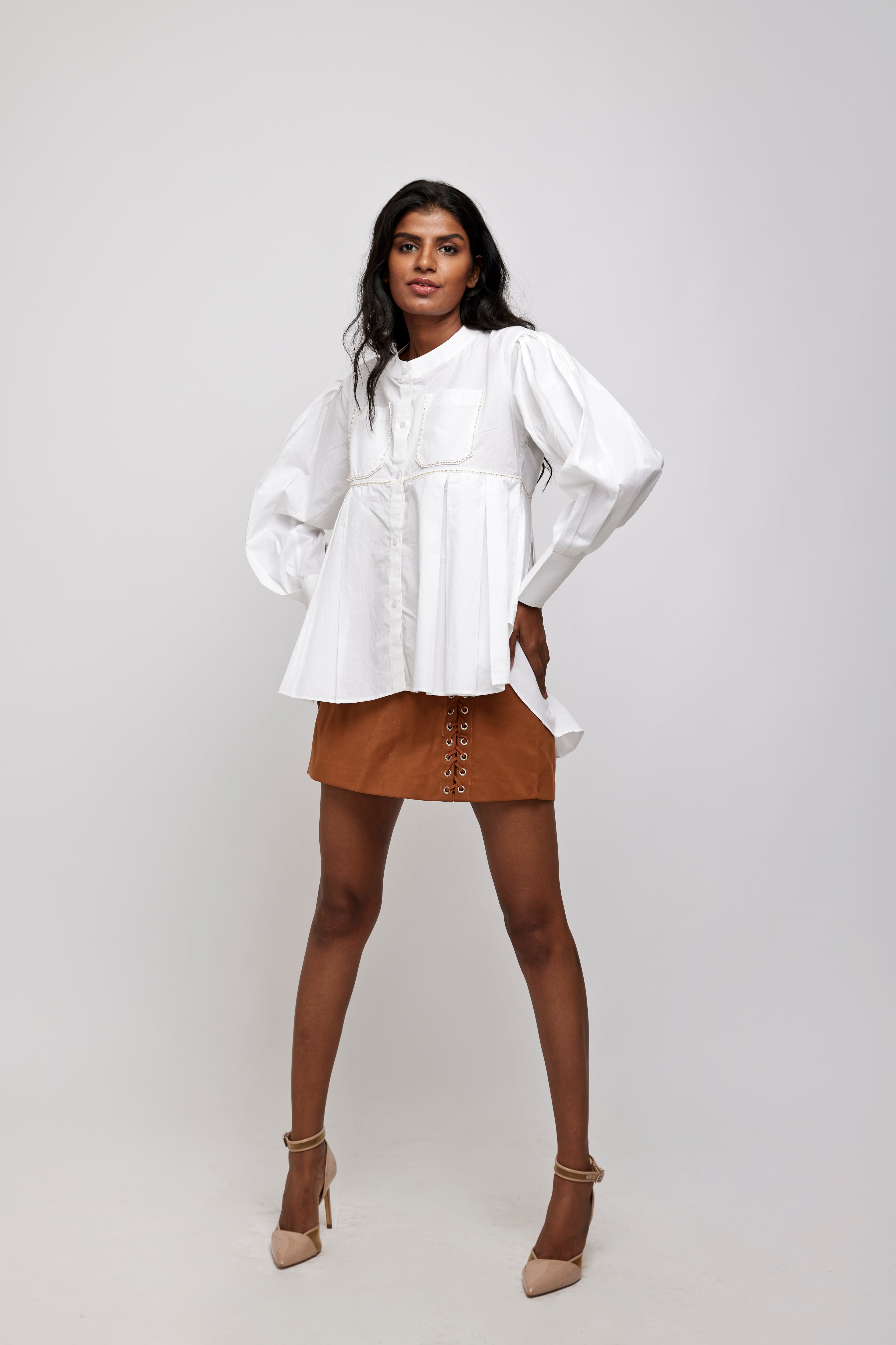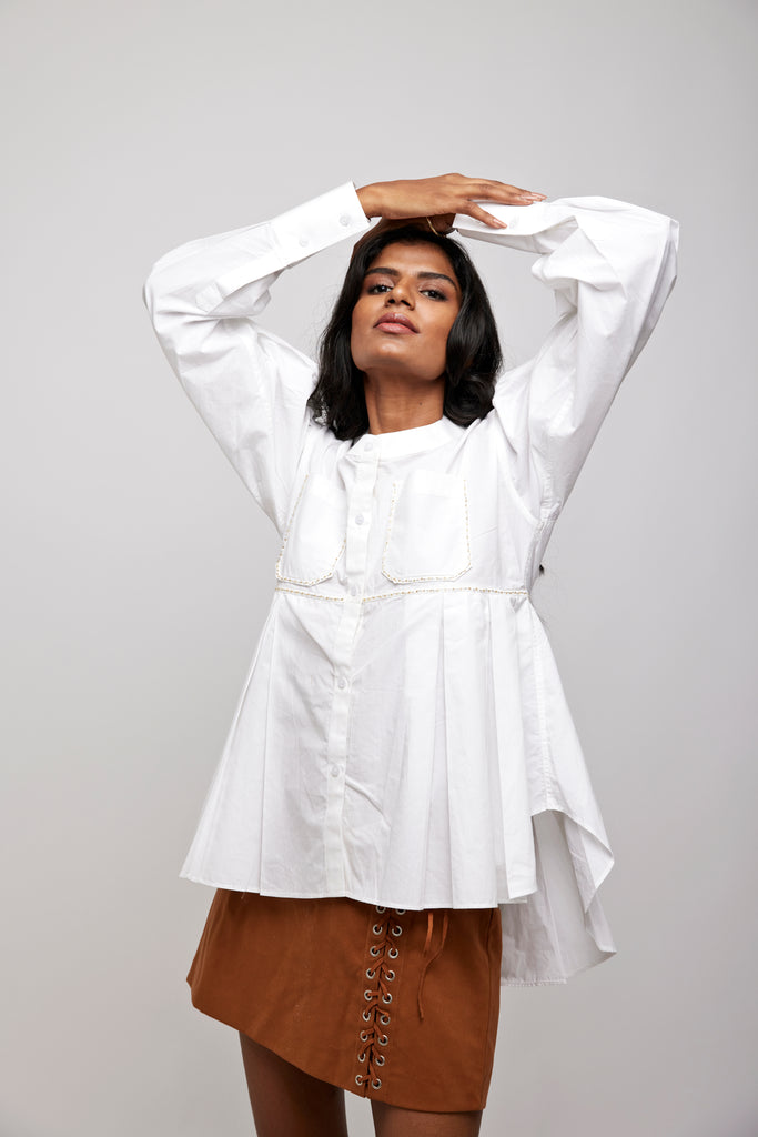 Box pleated flair shirt tail hem, basic shirt sleeves.Classic patch pockets embellished with golden glass beads.