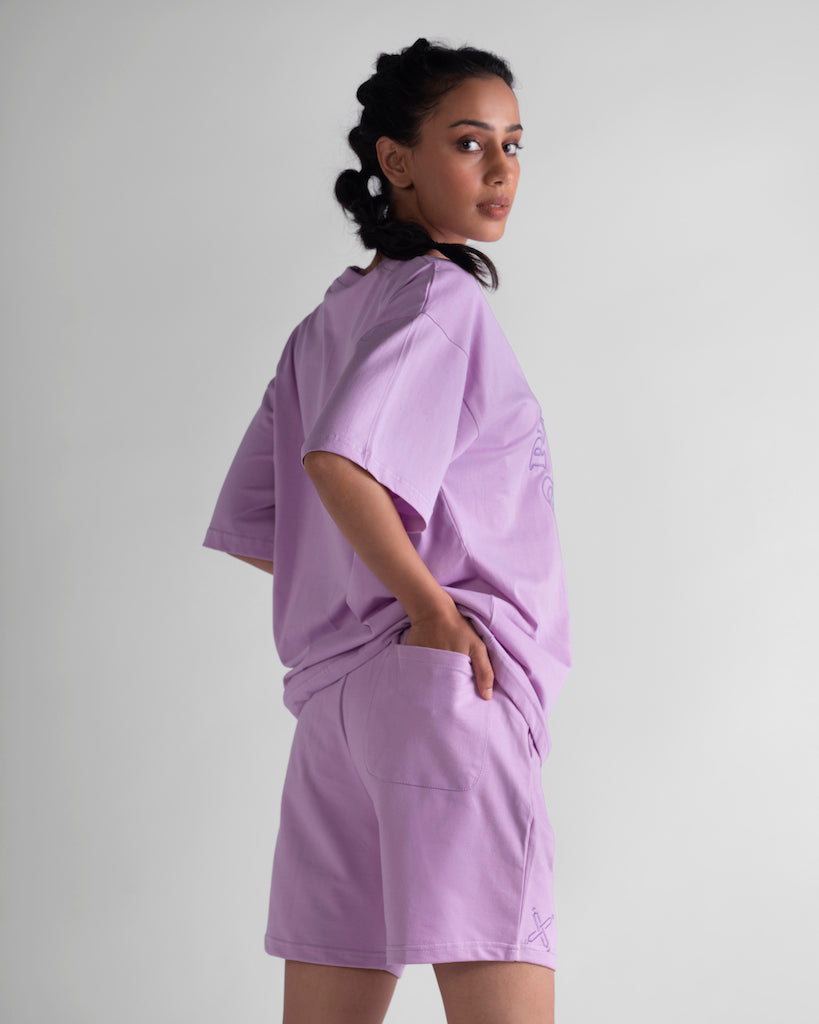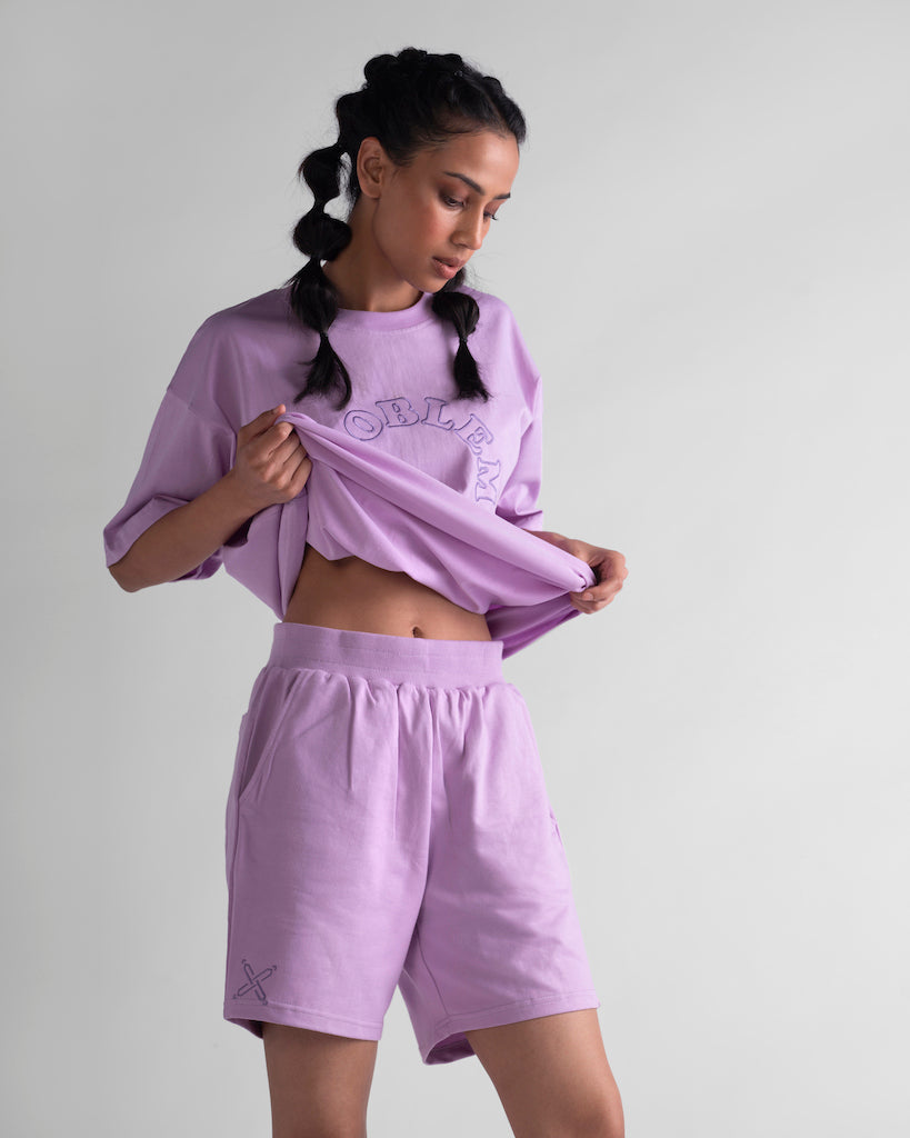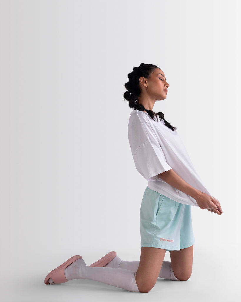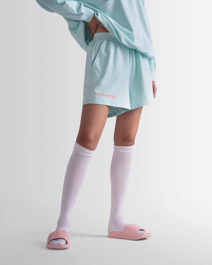 All things are possible with a great set of lashes. Treat yourself with this aqua pair of shorts. To add a little bit more pizazz to your outfit, complete it with our matching oversized sweatshirt with an inspiring message.