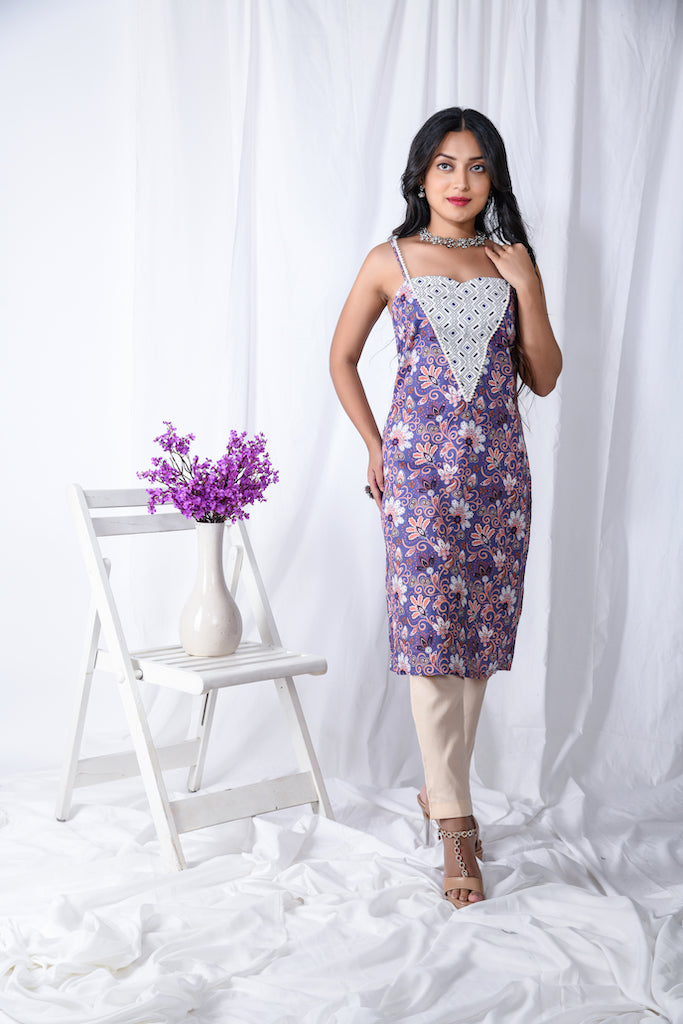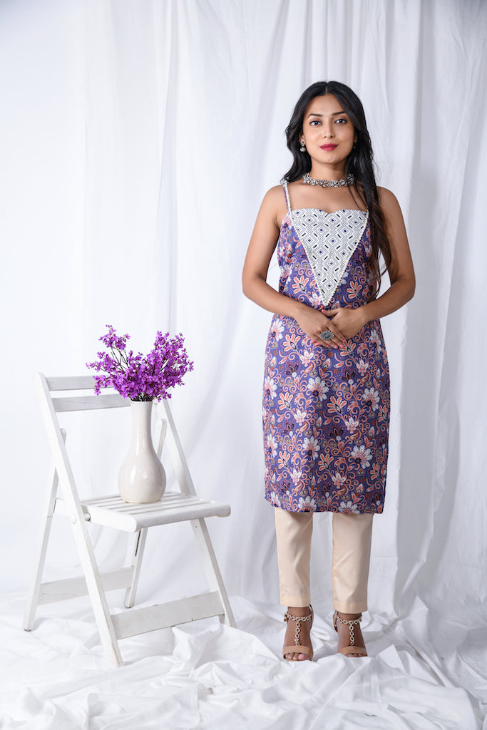 A digital printed slim fit sleeveless kurta set with a v shaped yoke along with pearl lace on the border.
