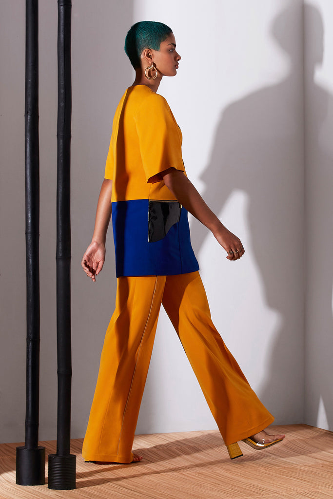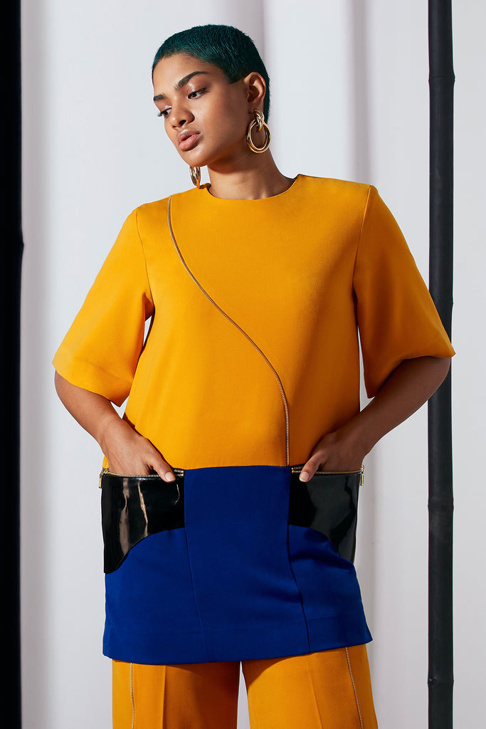 A colour-blocked mini shift dress with faux-leather pocket flaps and signature gold hardware details.