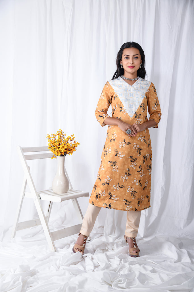 A digital printed 3/4 sleeves kurta set with V patched print yoke which has pearl lace on the neckline.